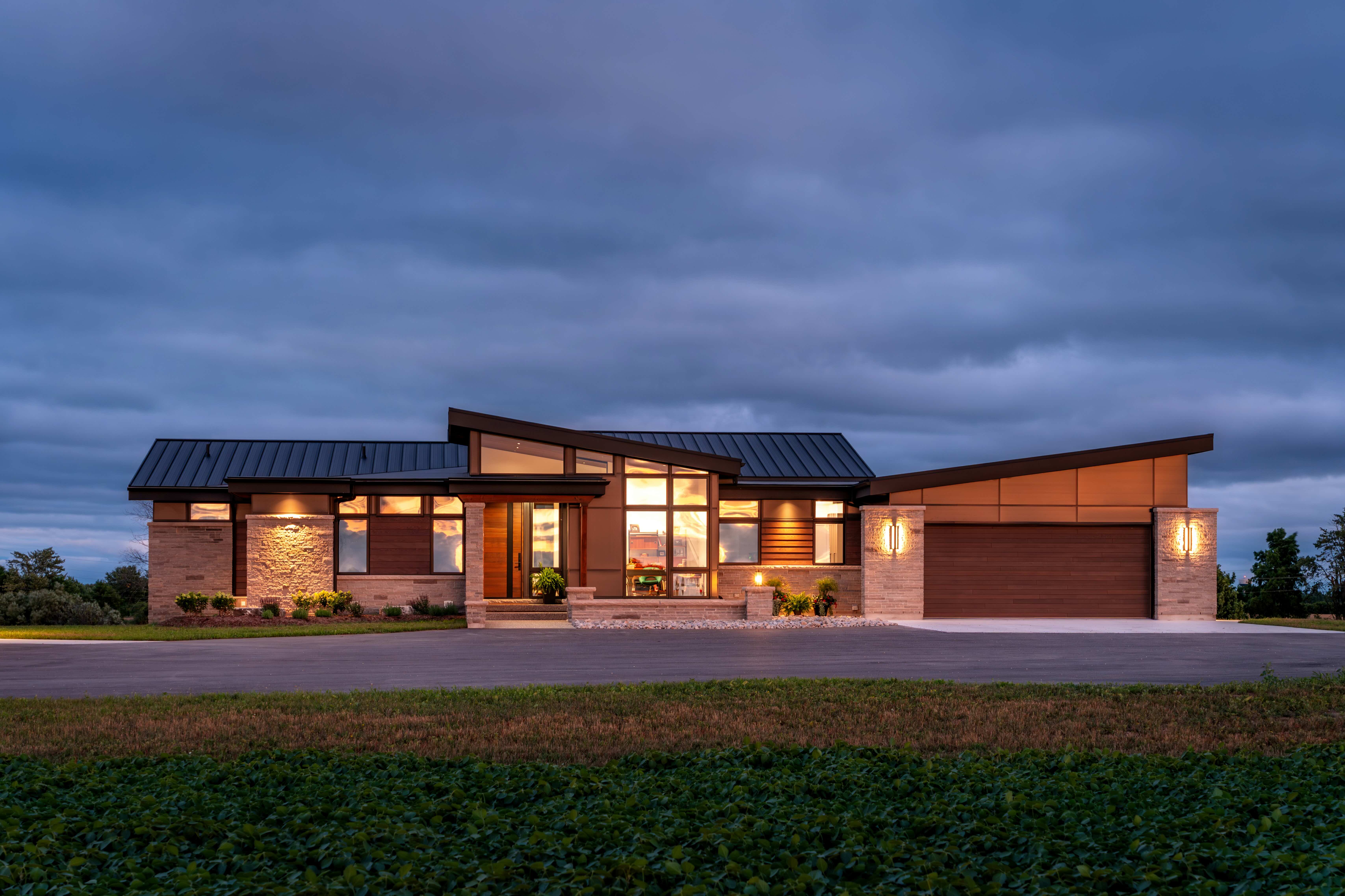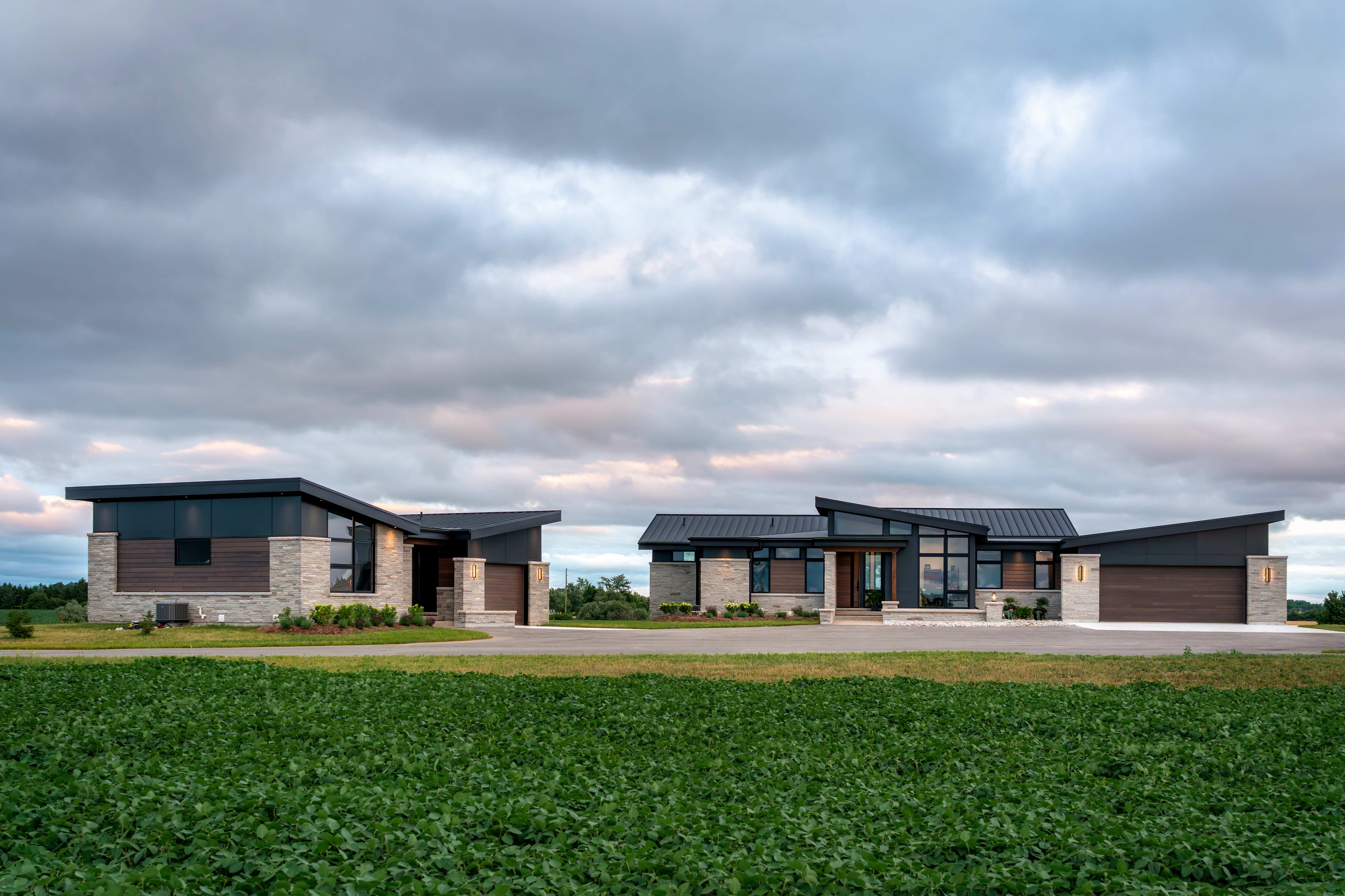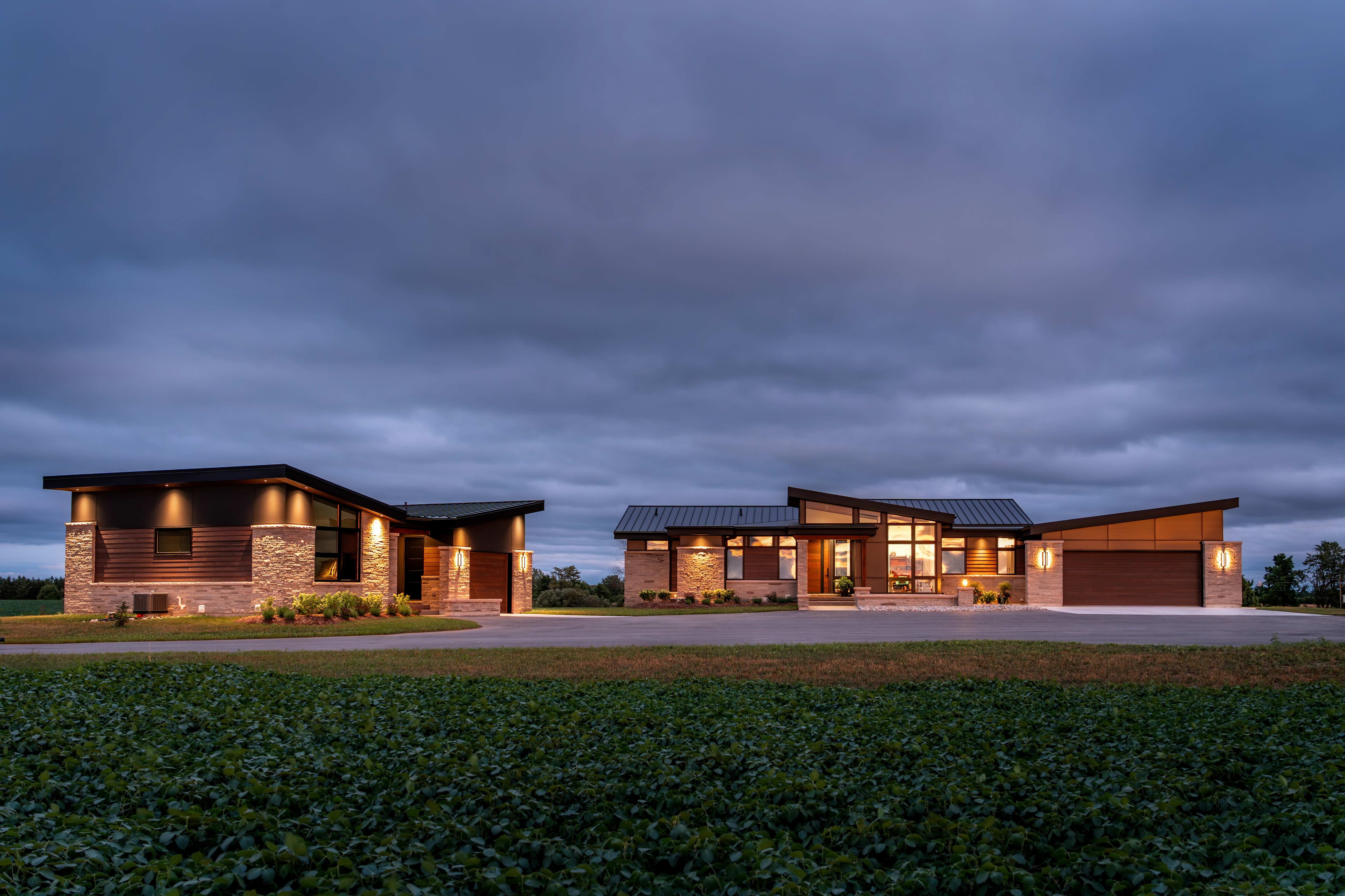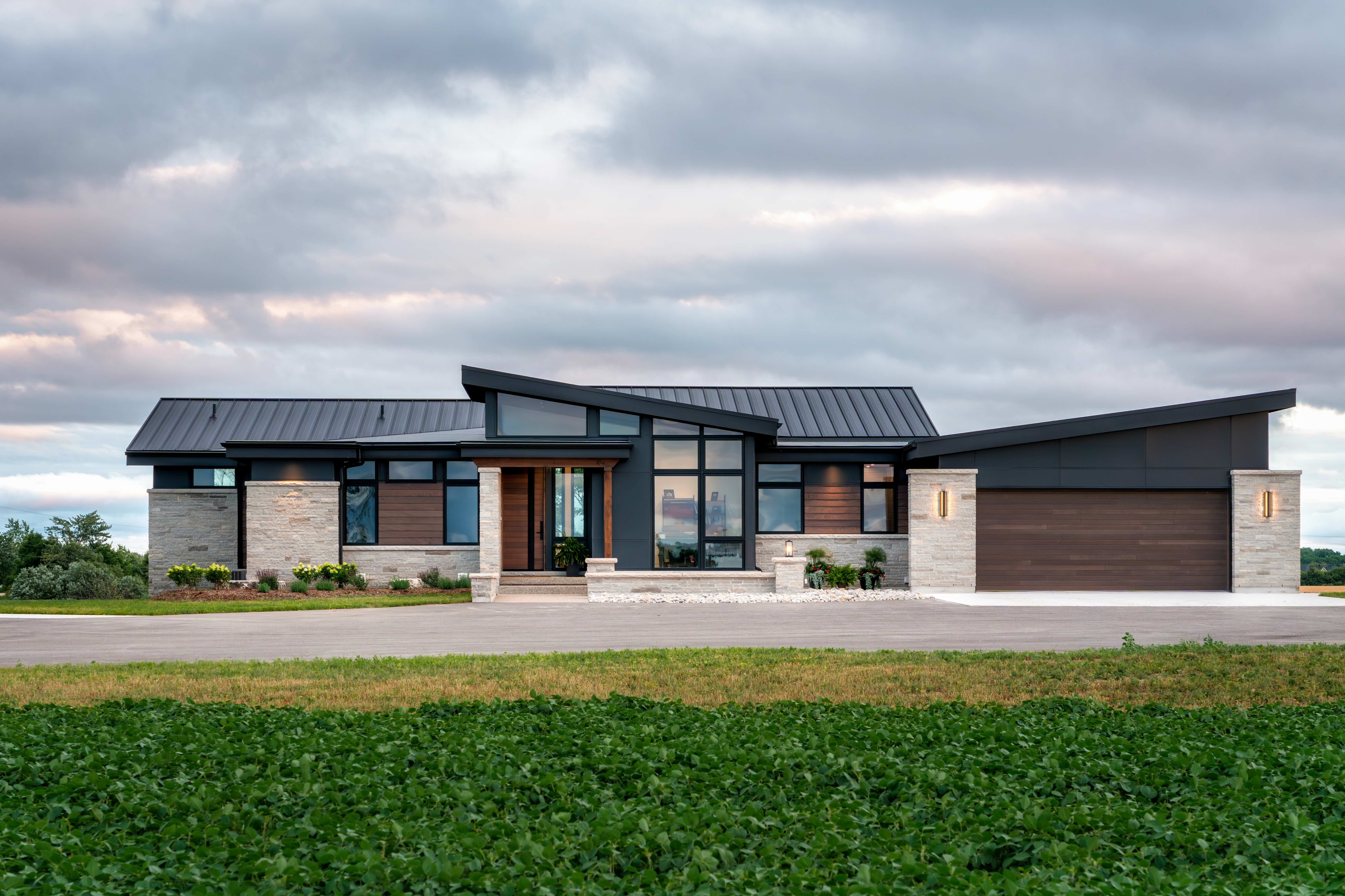 Anchored by bold monoslope rooflines, this contemporary home strikes a powerful yet grounded presence on its expansive rural site. The sweeping roof planes, subtly varied in height and pitch, echo the natural horizontality of the surrounding plains, visually rooting the architecture to the land. This connection is reinforced through deliberate alignments—where lines of roof, stone, and siding converge to form a harmonious visual rhythm that guides the eye across the façade.