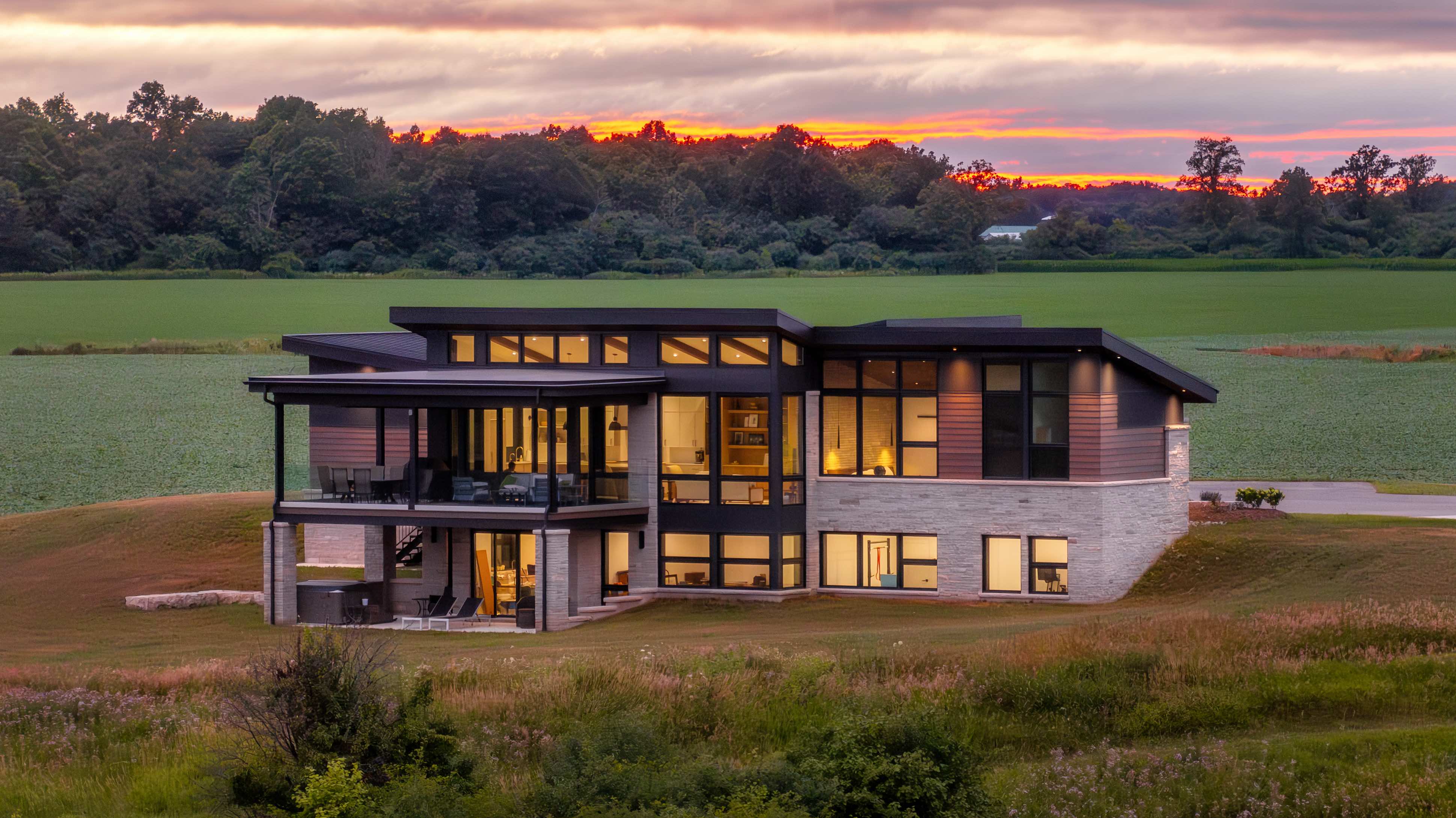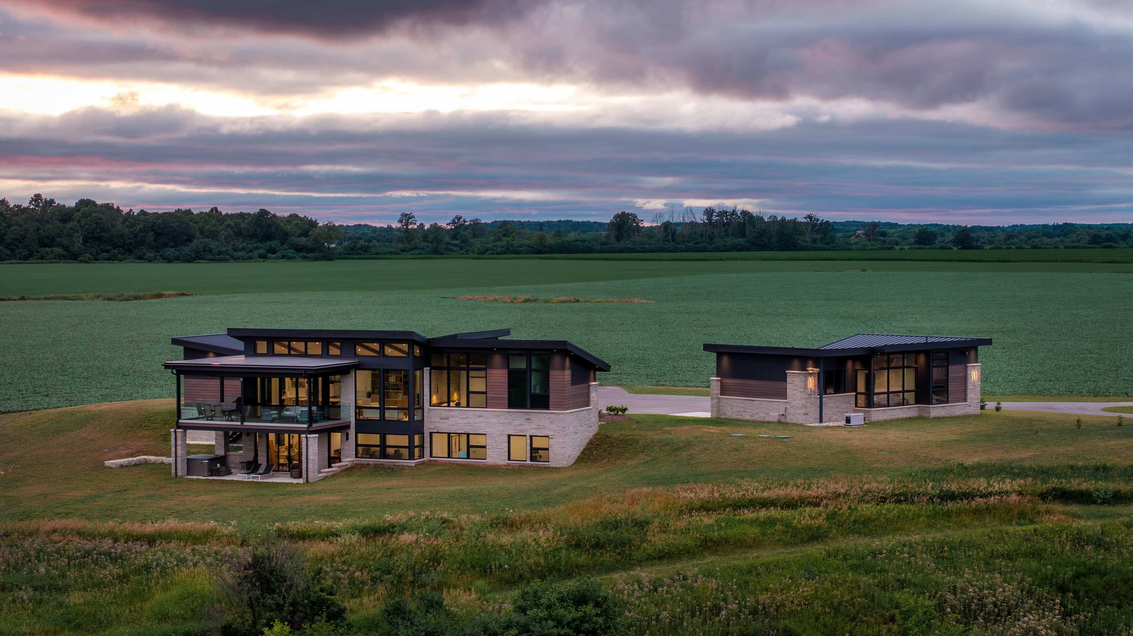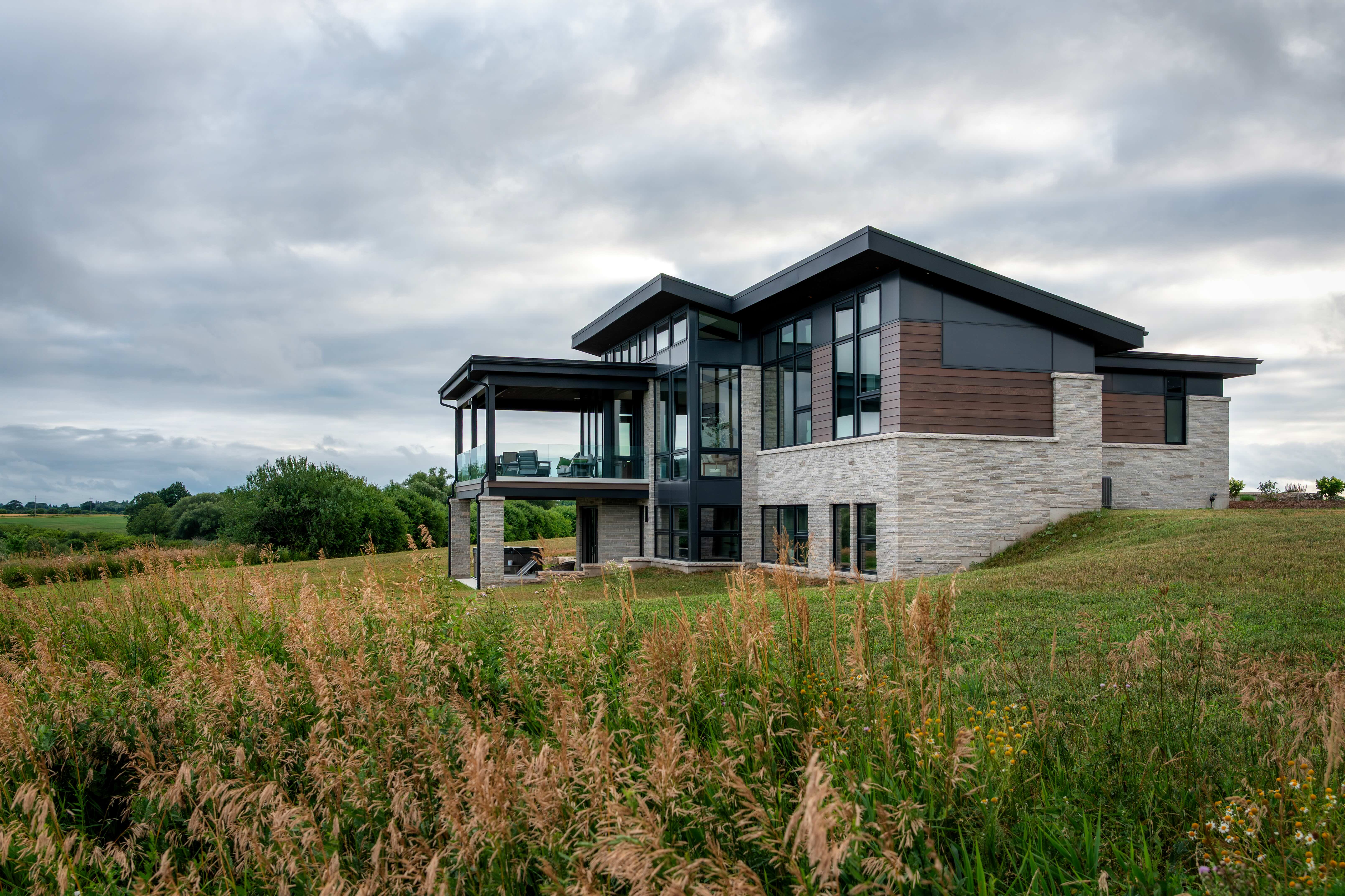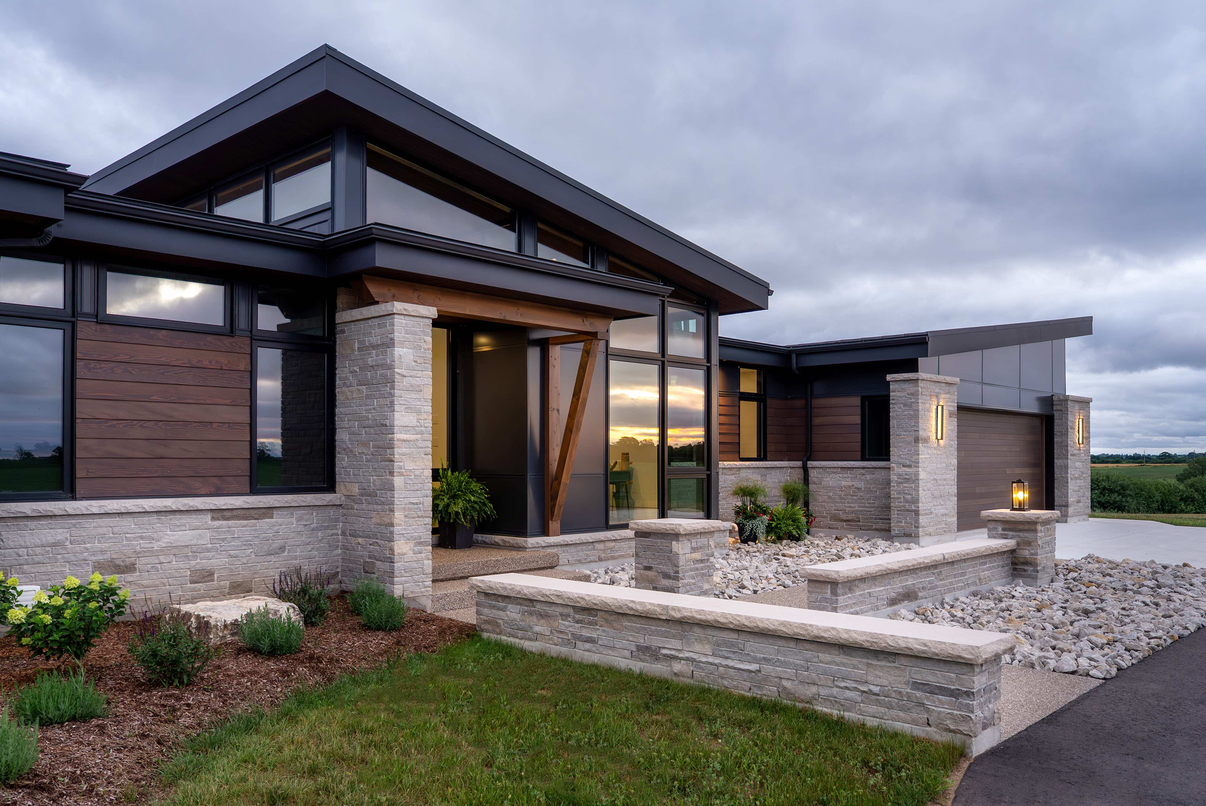 Anchored by bold monoslope rooflines, this contemporary home strikes a powerful yet grounded presence on its expansive rural site. The sweeping roof planes, subtly varied in height and pitch, echo the natural horizontality of the surrounding plains, visually rooting the architecture to the land. This connection is reinforced through deliberate alignments—where lines of roof, stone, and siding converge to form a harmonious visual rhythm that guides the eye across the façade.