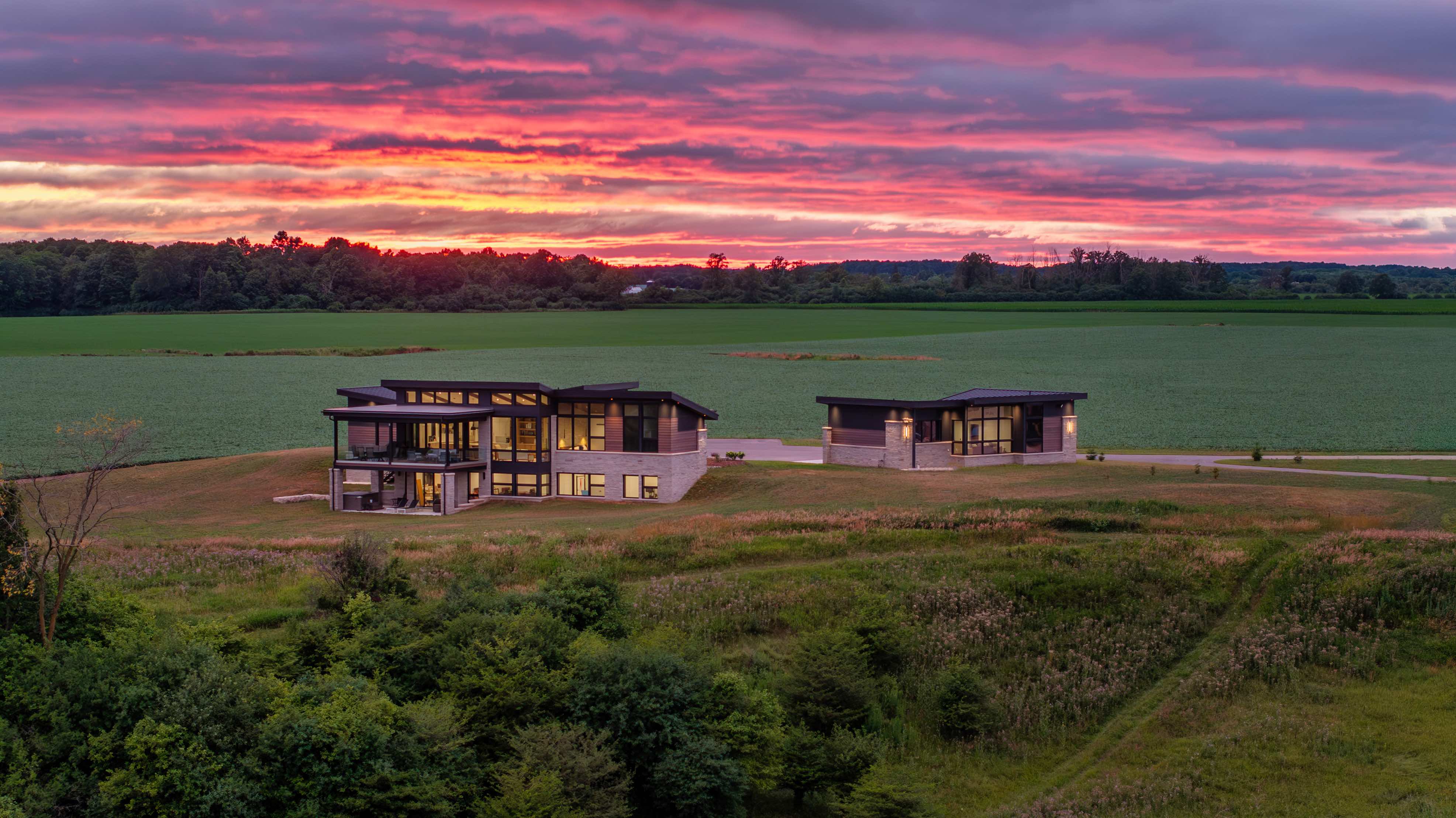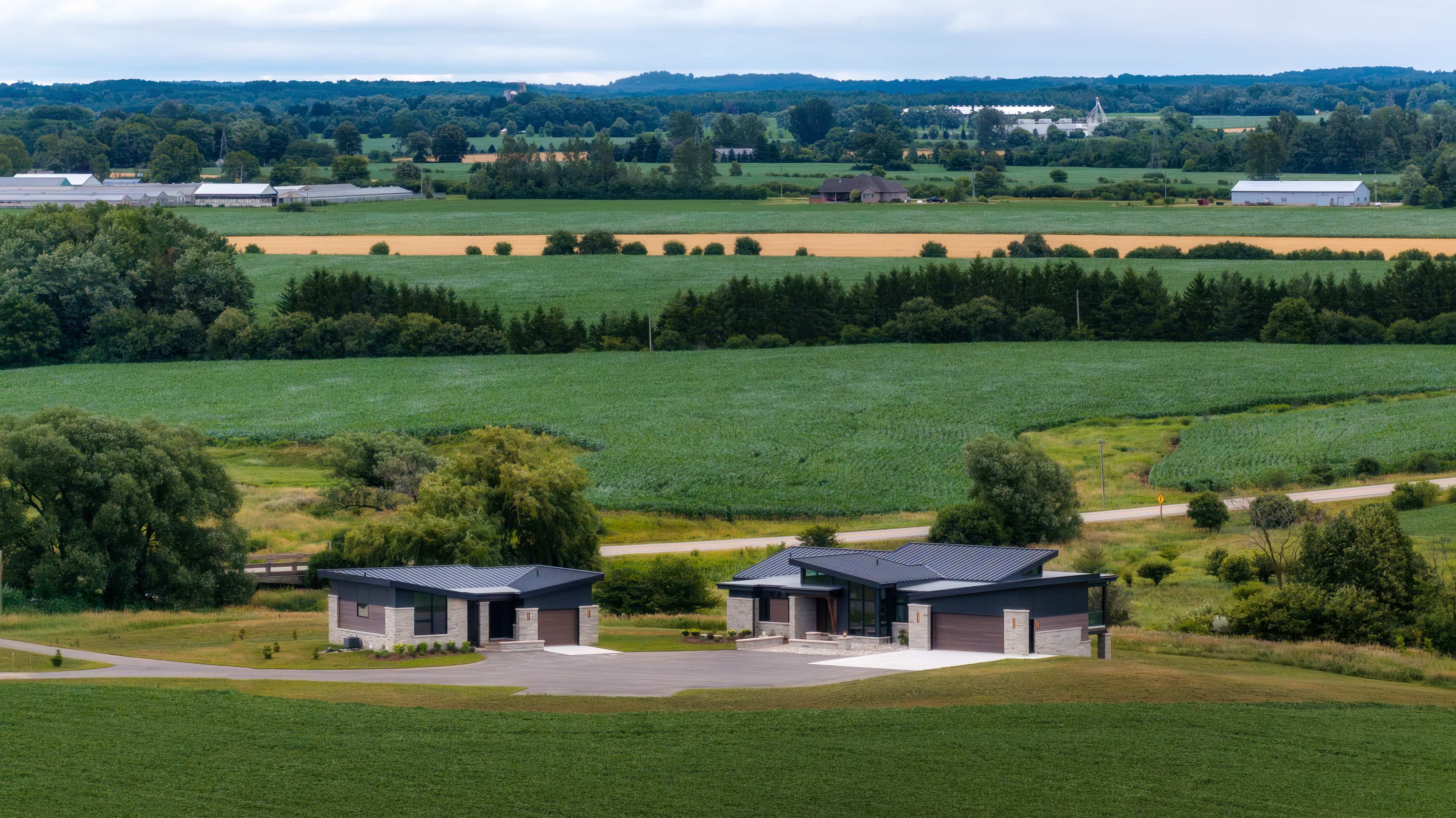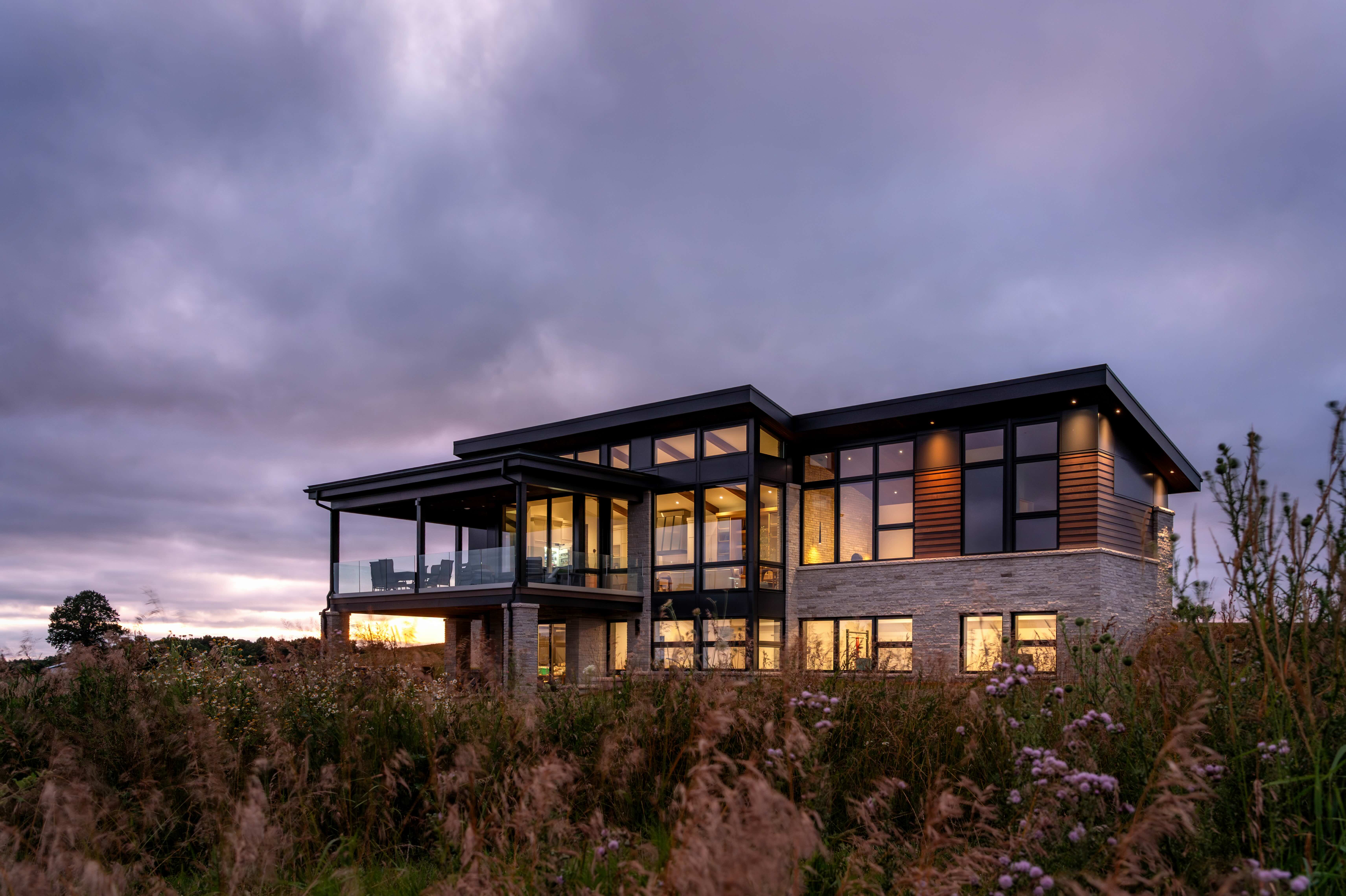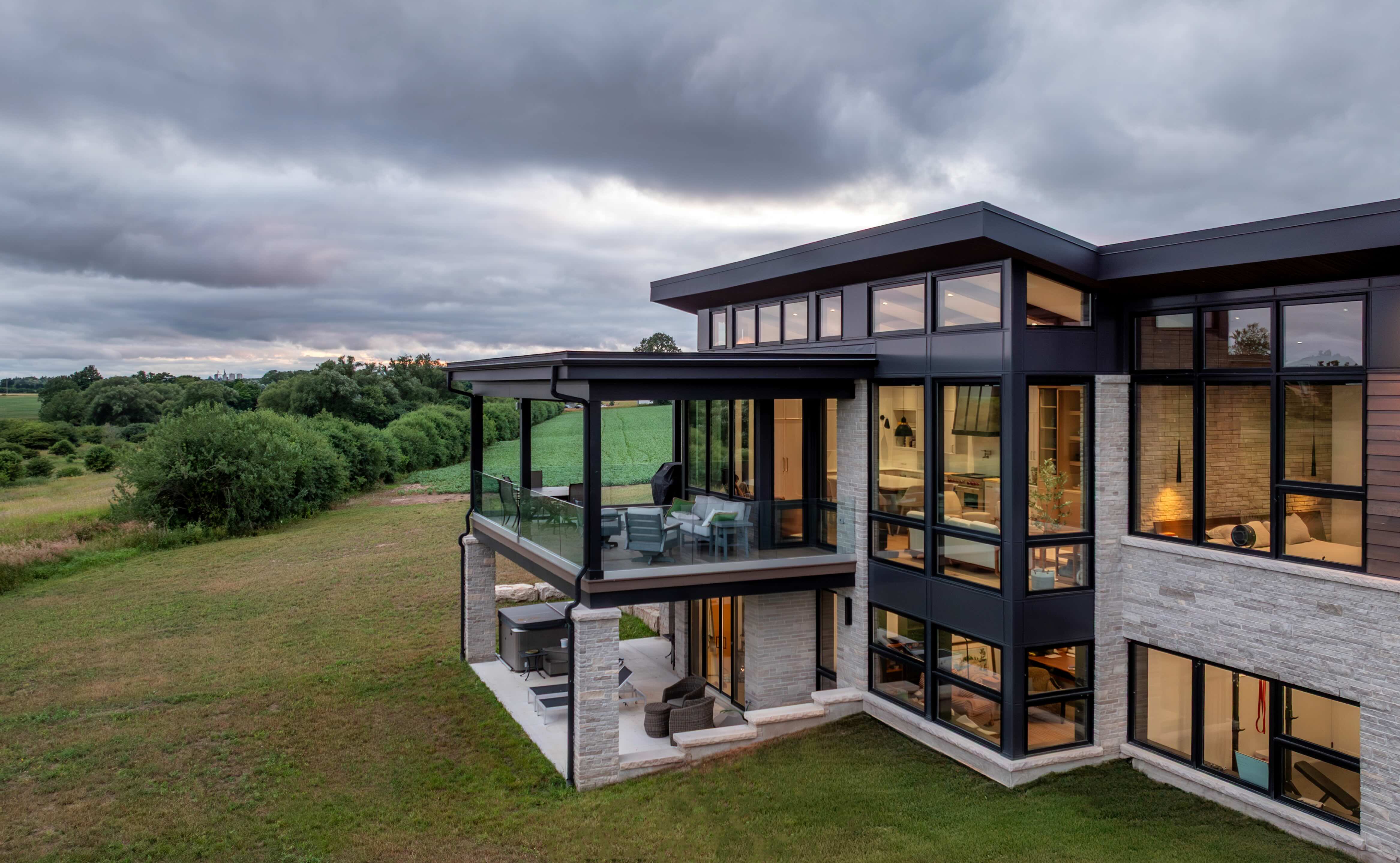 Anchored by bold monoslope rooflines, this contemporary home strikes a powerful yet grounded presence on its expansive rural site. The sweeping roof planes, subtly varied in height and pitch, echo the natural horizontality of the surrounding plains, visually rooting the architecture to the land. This connection is reinforced through deliberate alignments—where lines of roof, stone, and siding converge to form a harmonious visual rhythm that guides the eye across the façade.