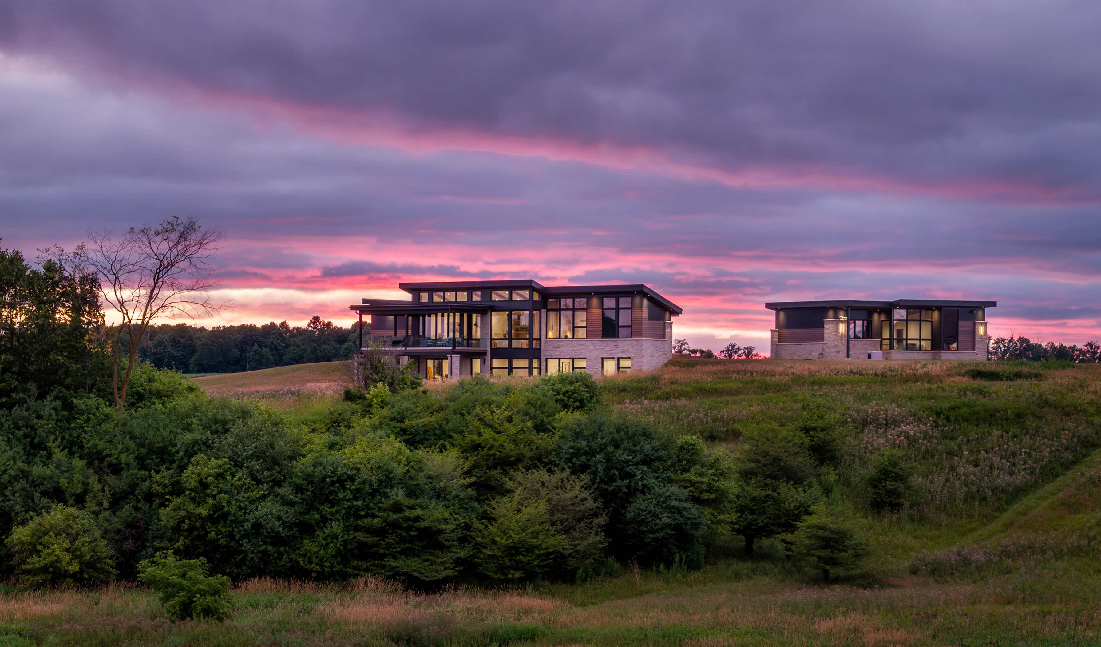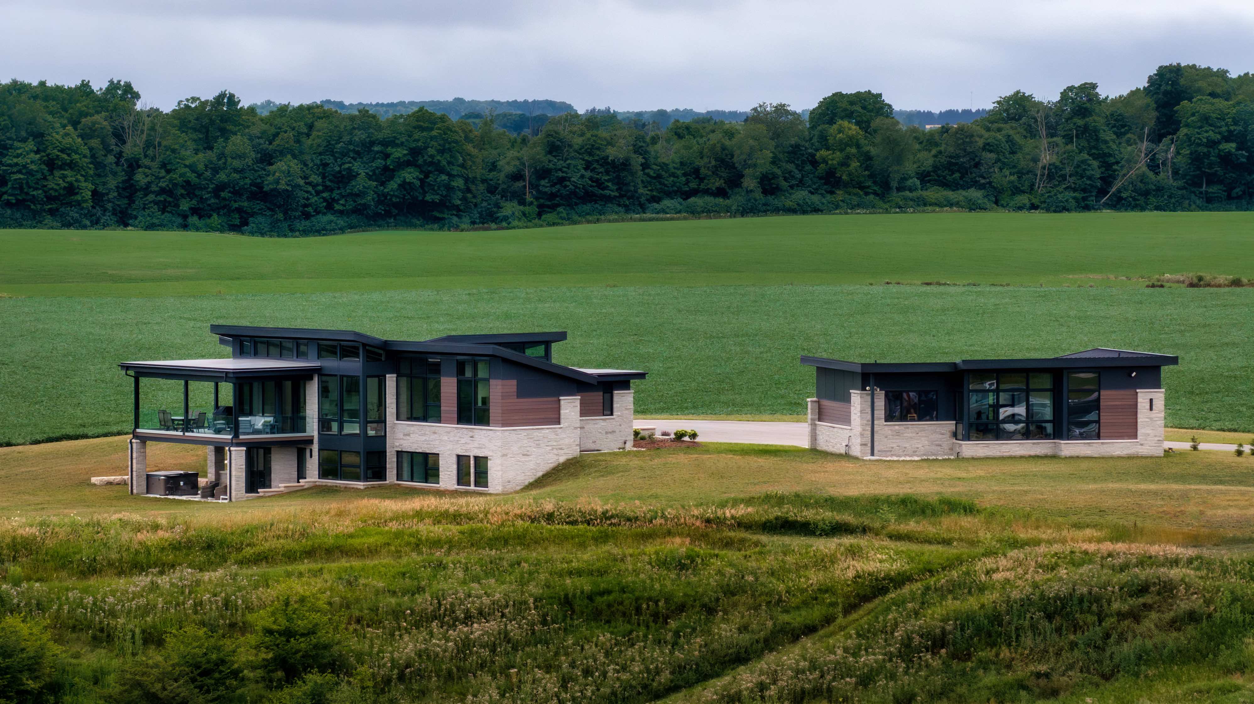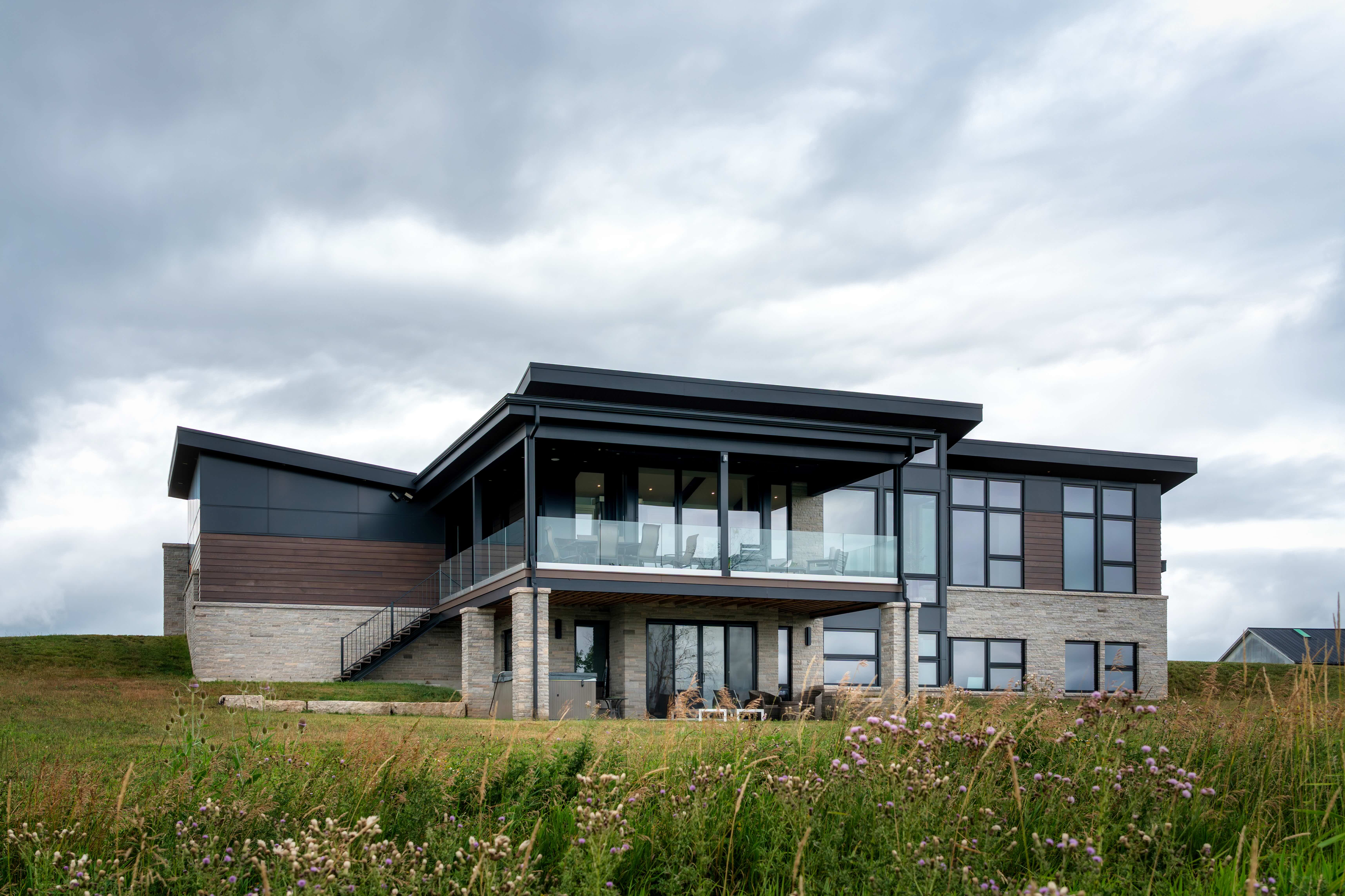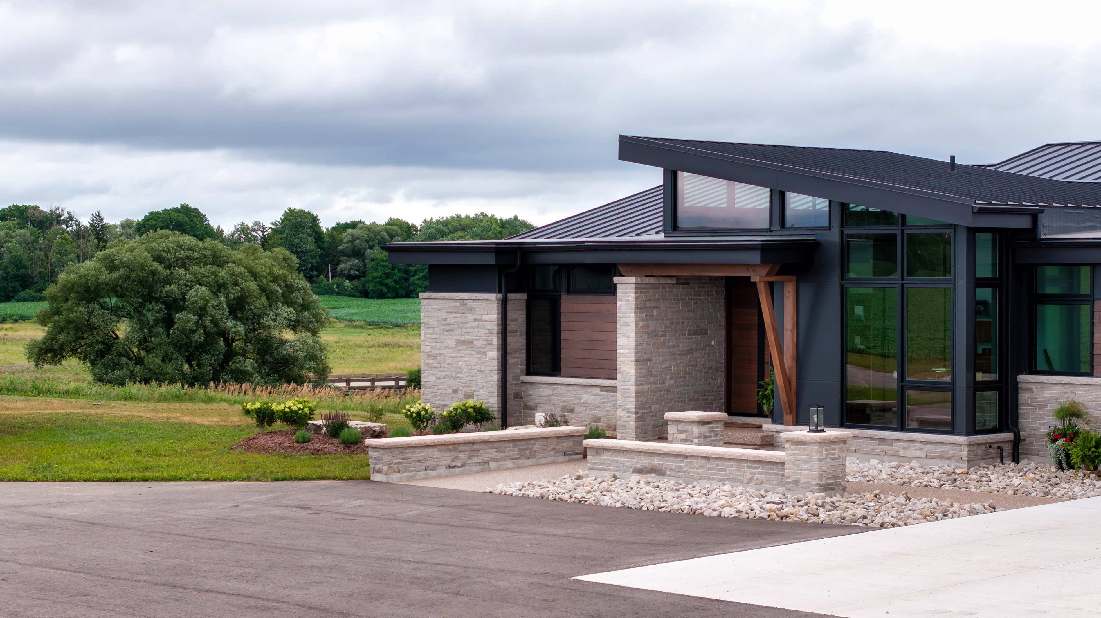 Anchored by bold monoslope rooflines, this contemporary home strikes a powerful yet grounded presence on its expansive rural site. The sweeping roof planes, subtly varied in height and pitch, echo the natural horizontality of the surrounding plains, visually rooting the architecture to the land. This connection is reinforced through deliberate alignments—where lines of roof, stone, and siding converge to form a harmonious visual rhythm that guides the eye across the façade.