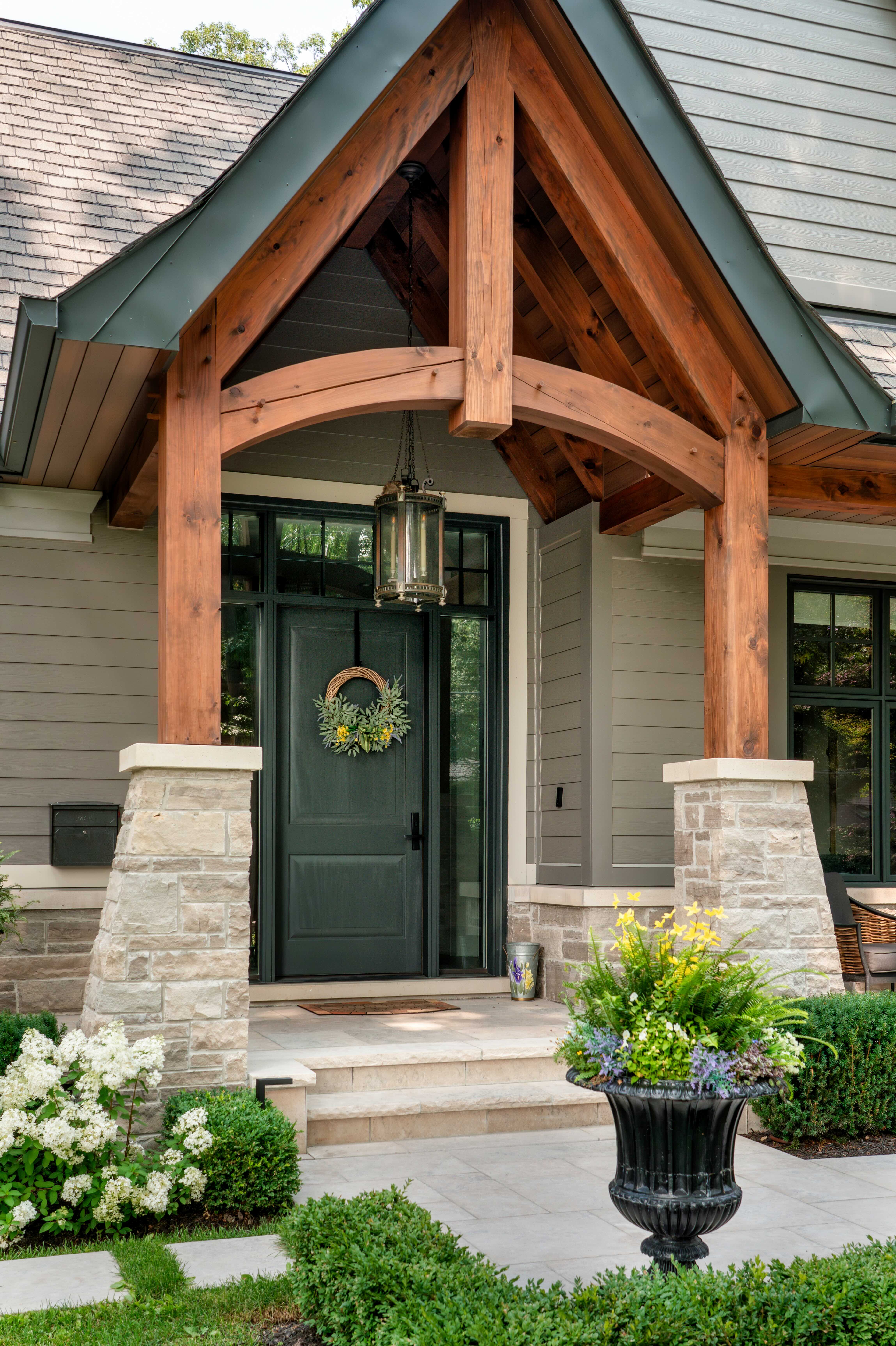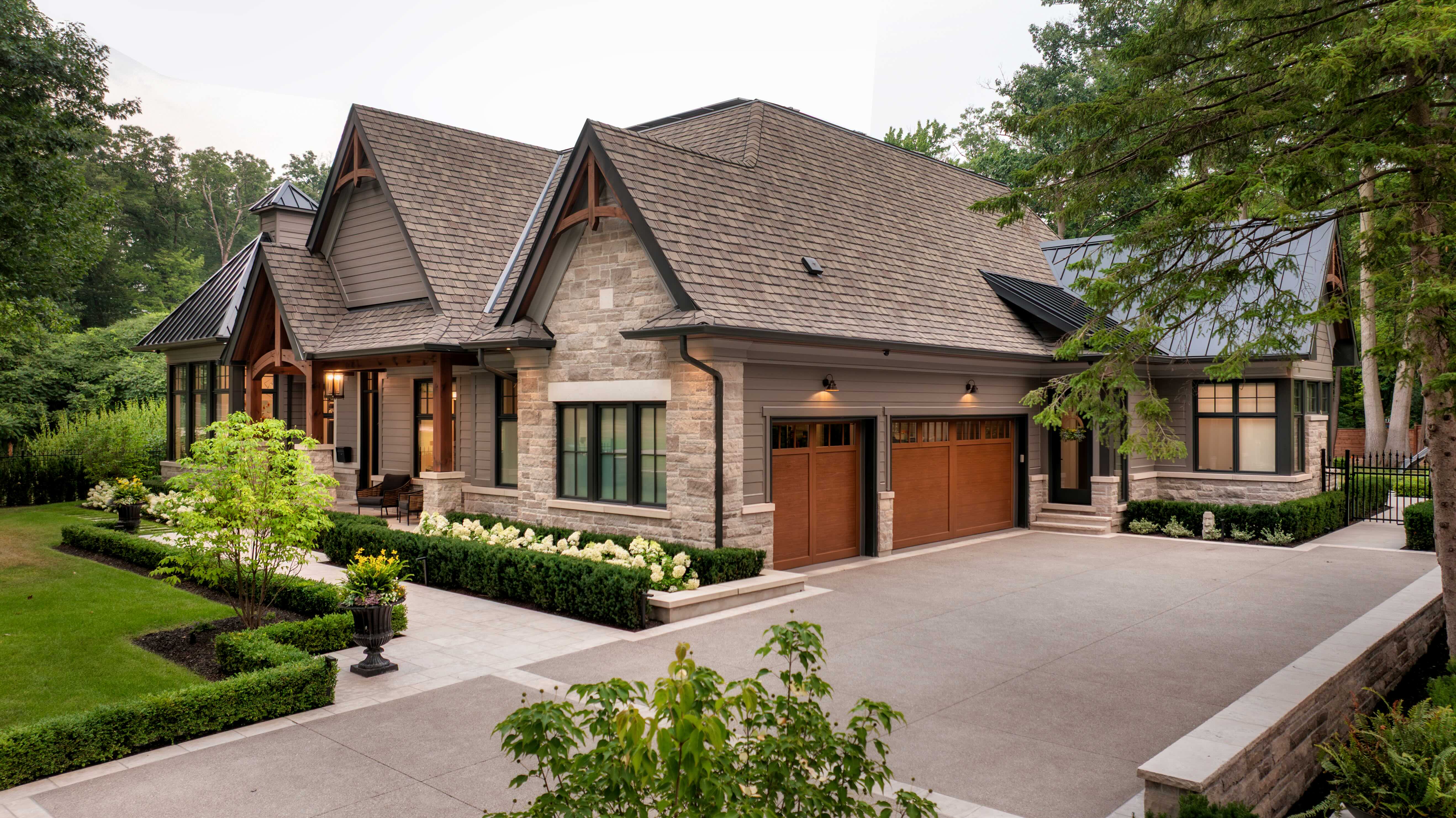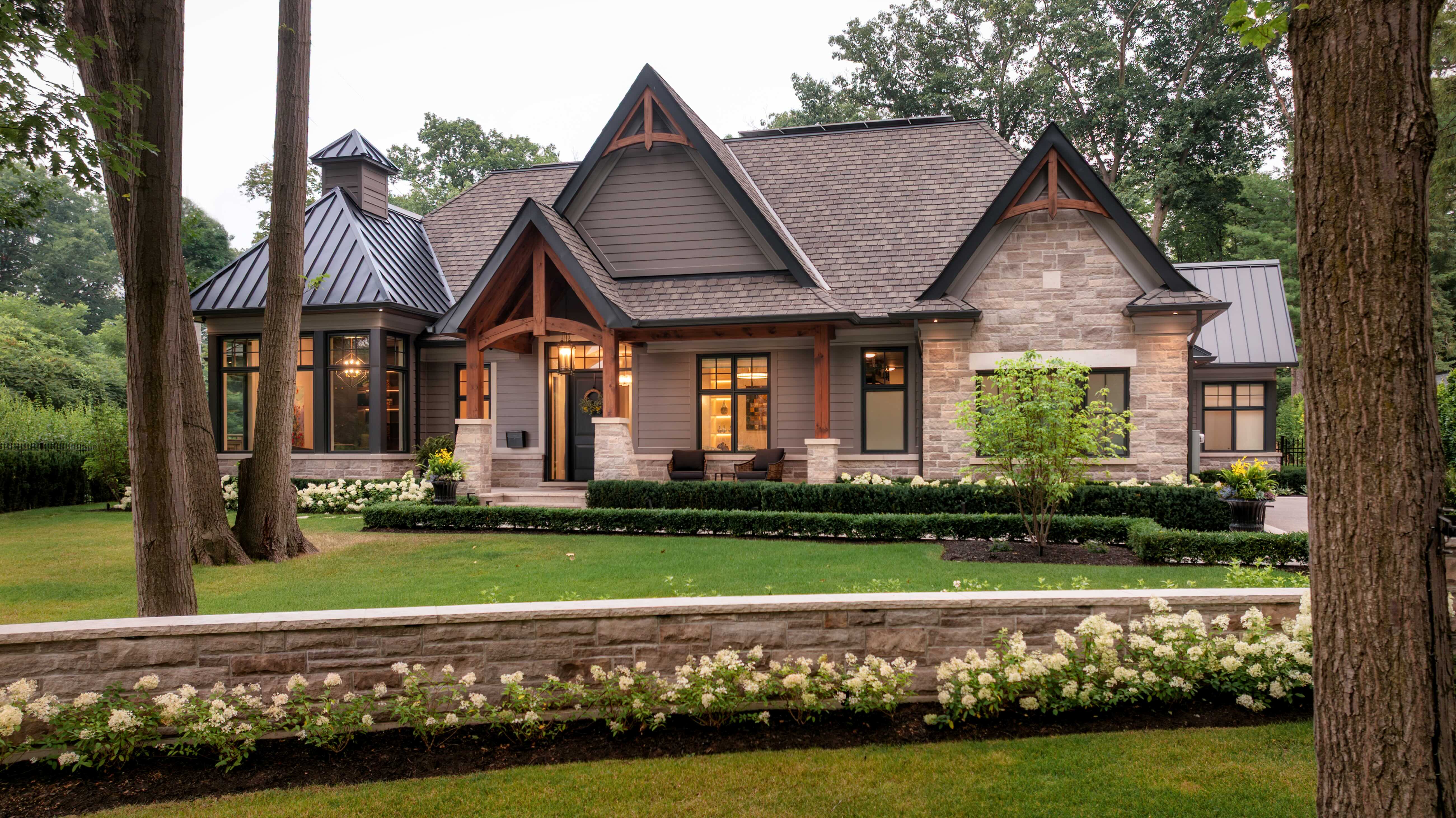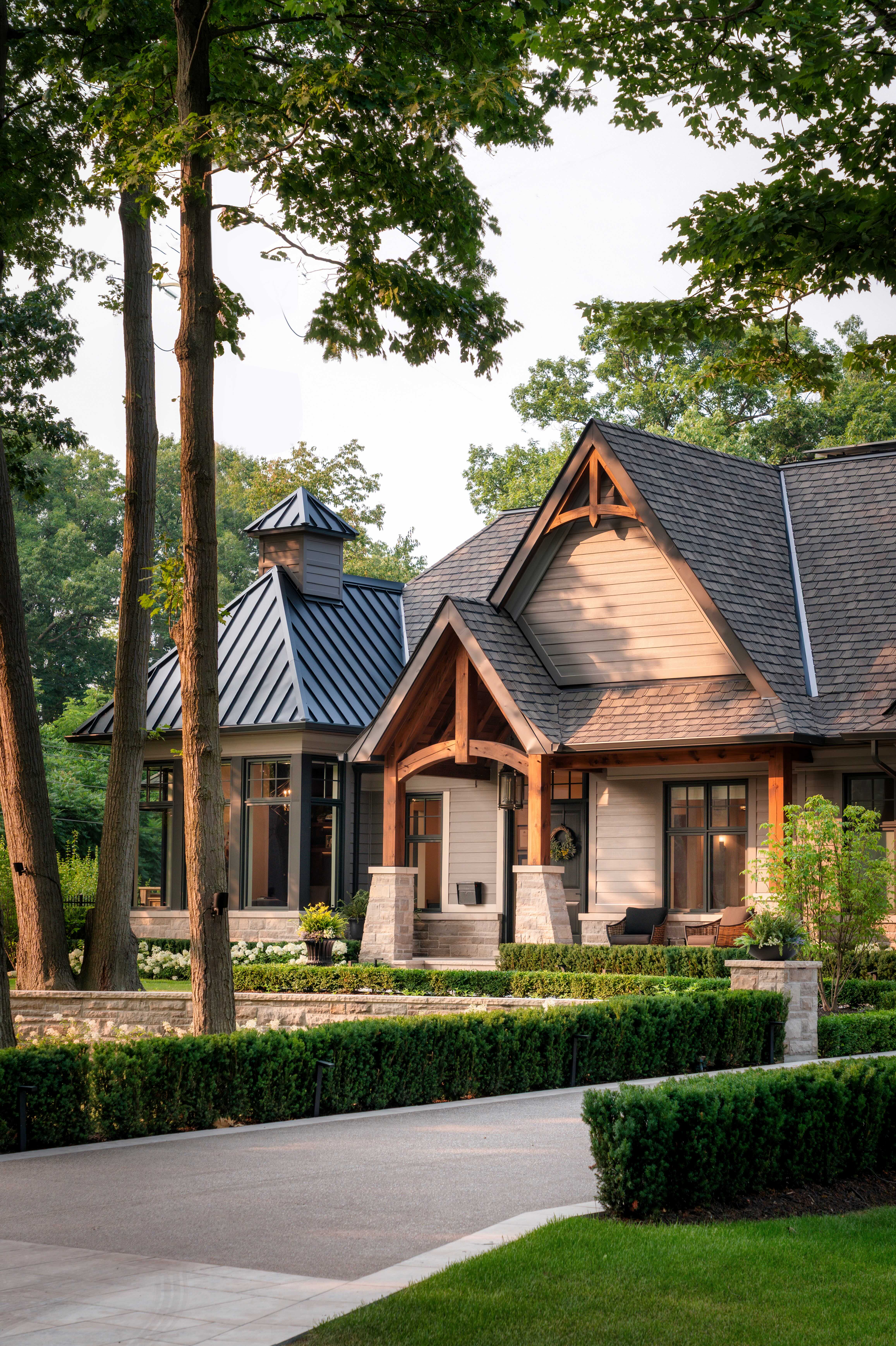 The architecture layers classic gabled forms with modern detailing, creating a home that feels both grounded and contemporary. Natural stone, horizontal siding, and warm wood accents are paired with standing-seam metal roofing to strike the perfect balance between rustic texture and modern precision. Every element — from the gable proportions to the placement of the windows — was designed to achieve visual balance and enduring curb appeal.