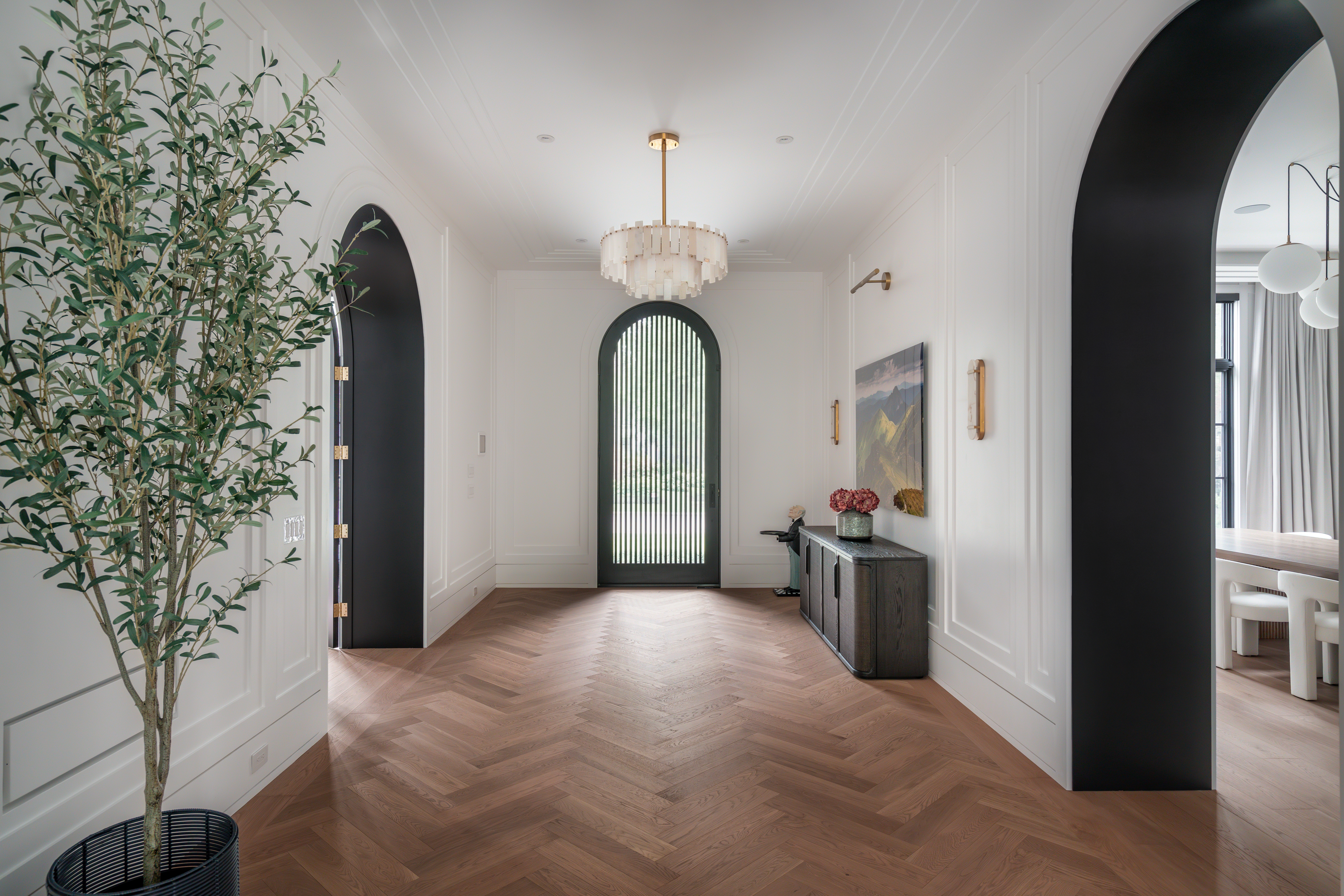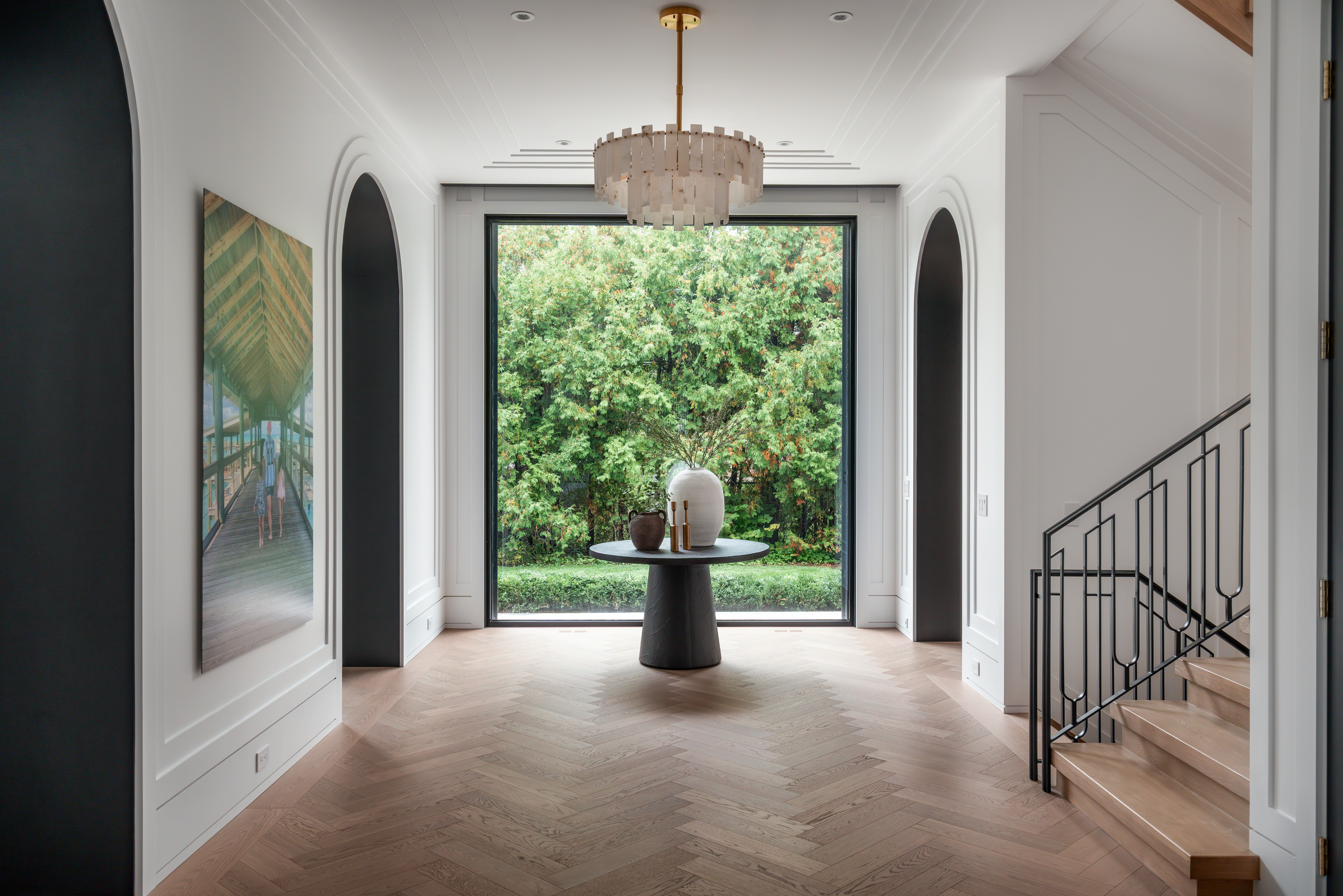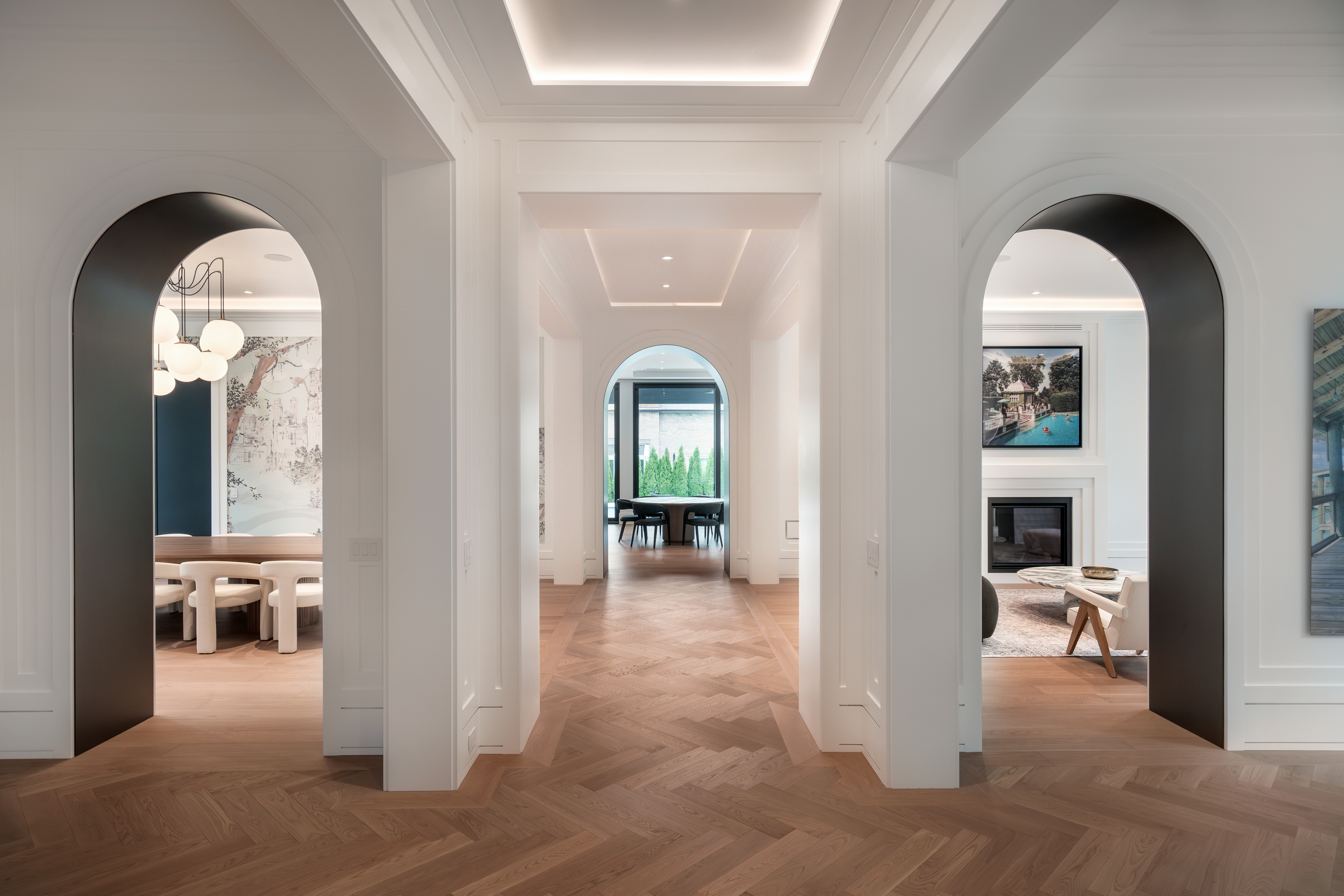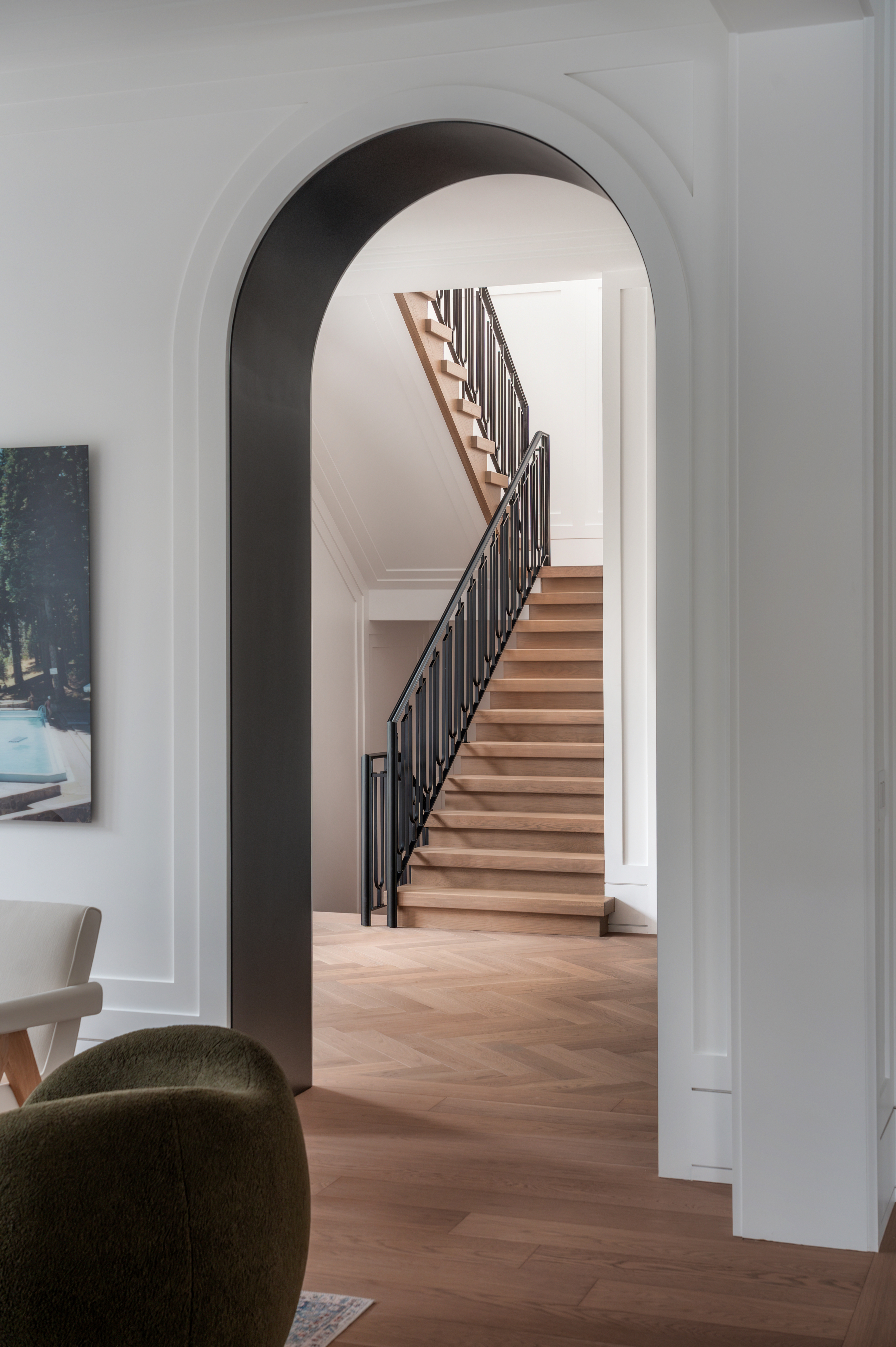 As both the architectural and interior design team, we approached the interior with the same focus on proportion, detail, and material richness. Arched openings soften the flow between rooms, while custom millwork, layered mouldings, and expansive sightlines anchor the interior architecture. The foyer and main hall feature herringbone wood flooring, adding warmth and texture that complement the home’s clean, modern detailing.
