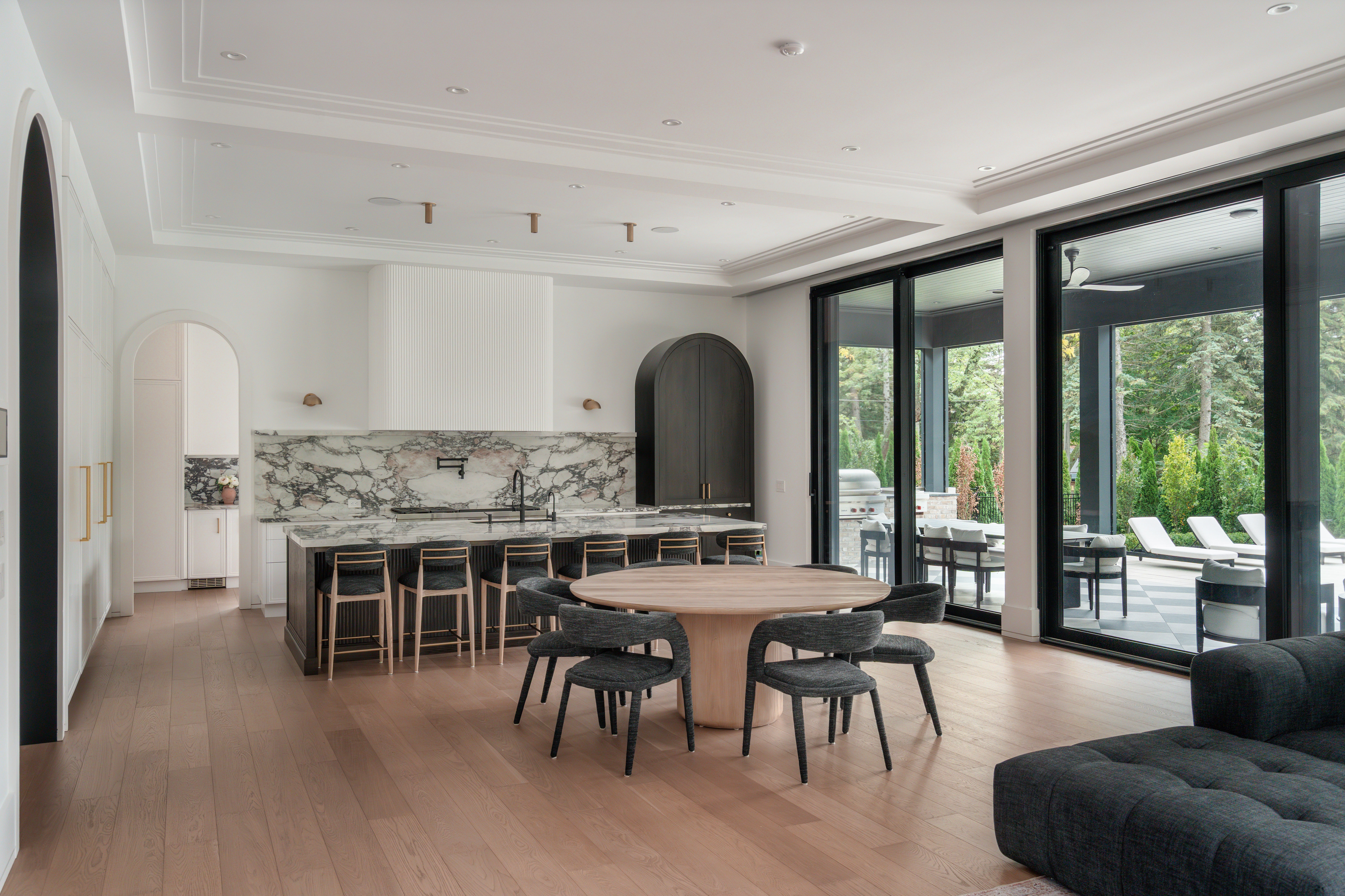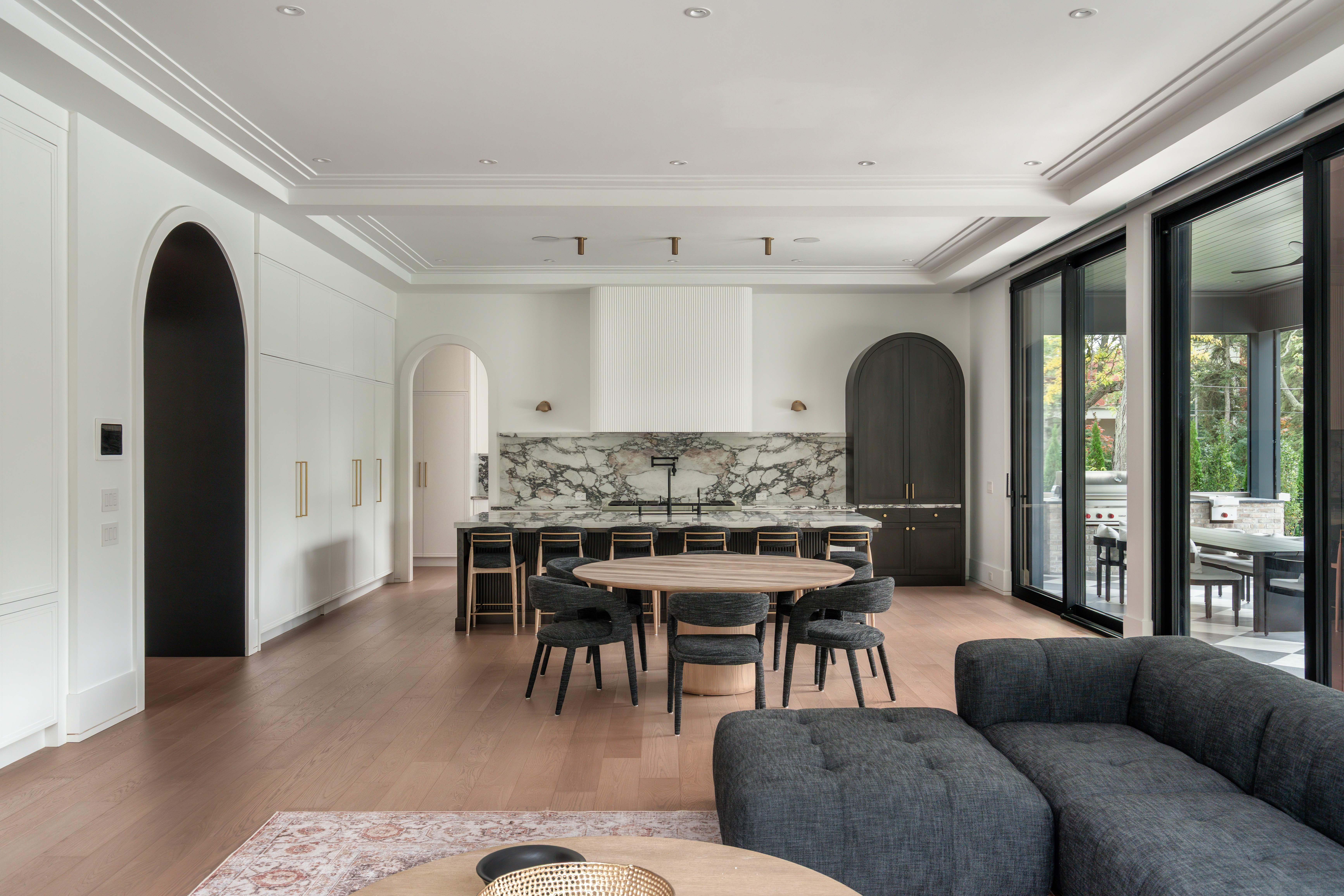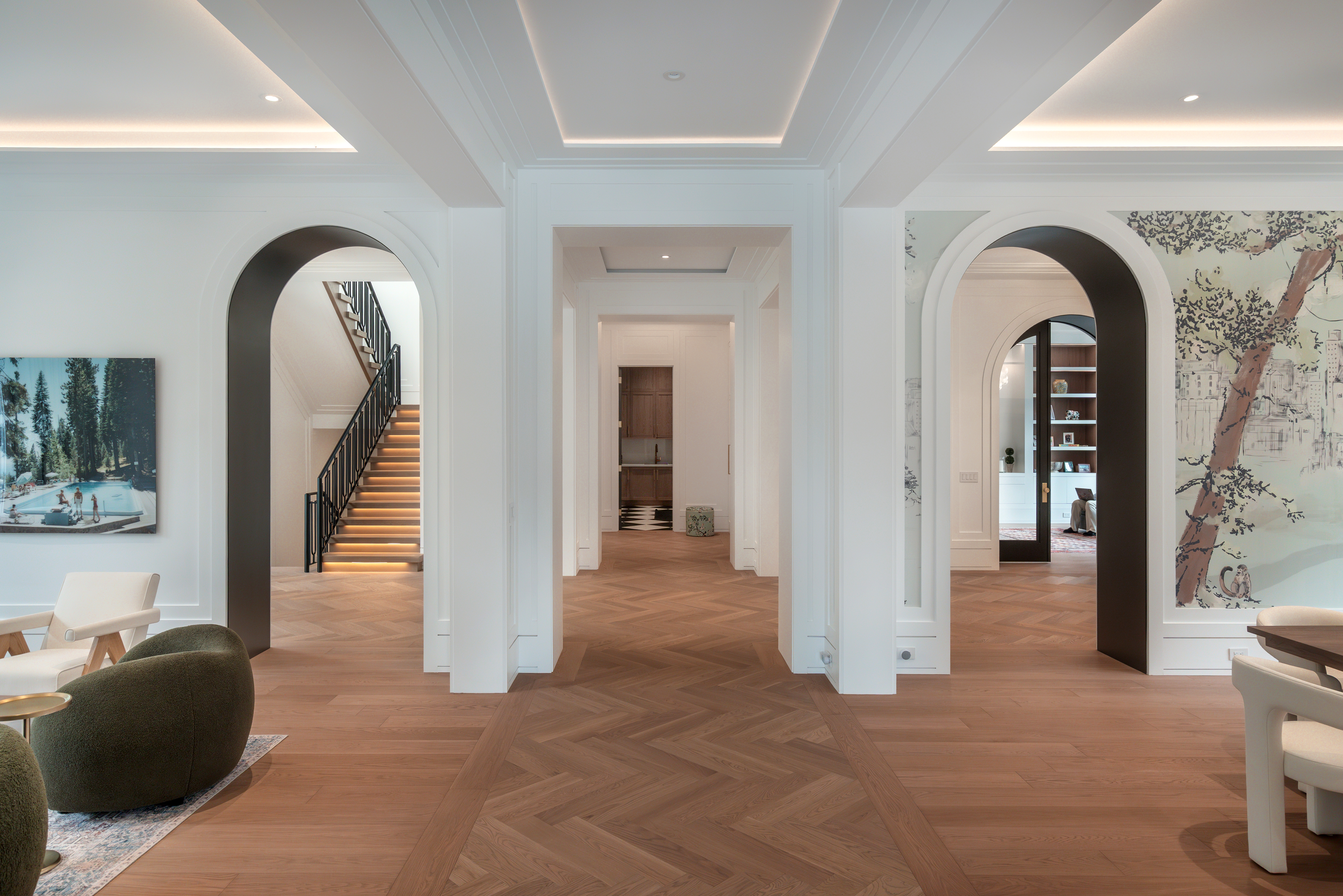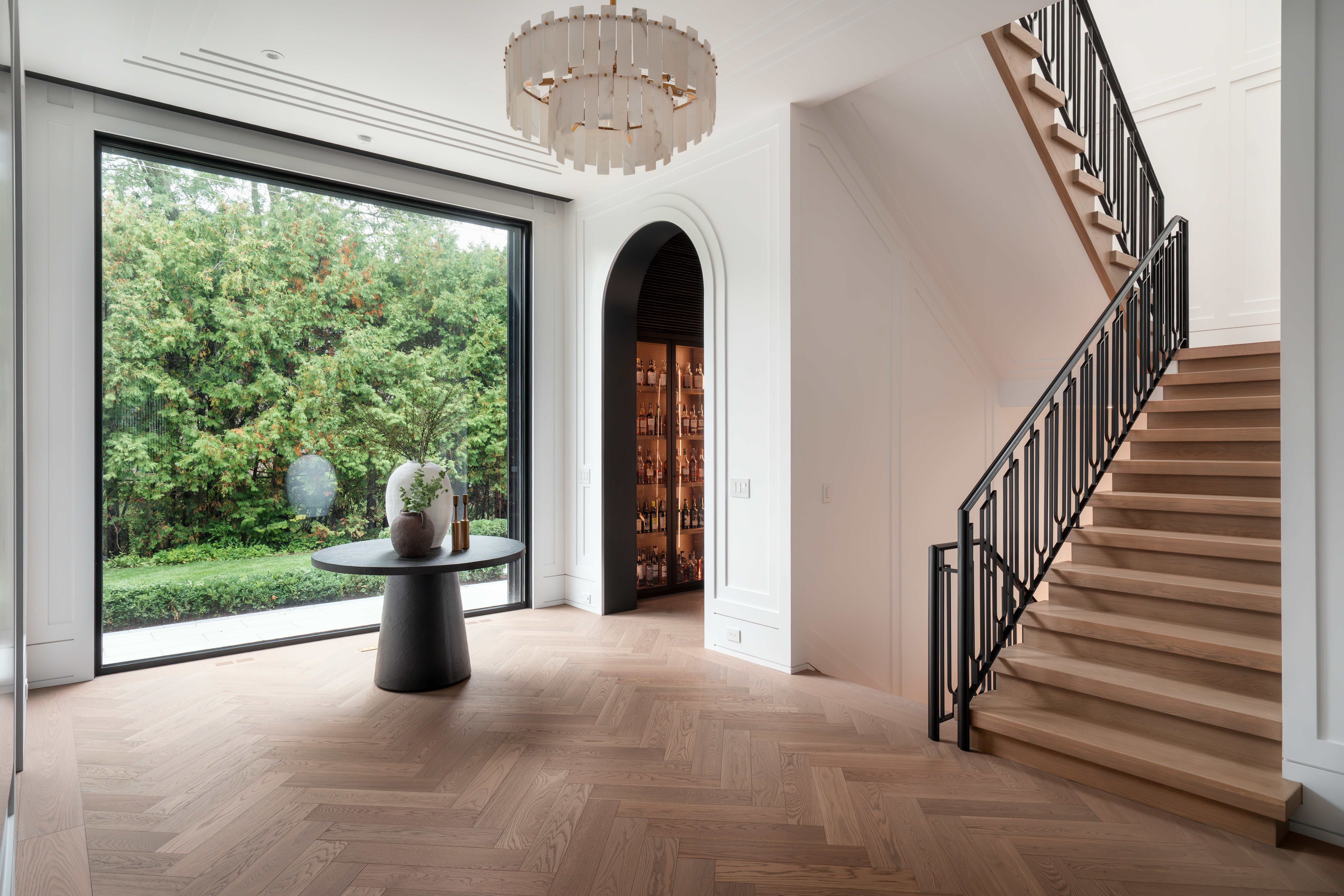 As both the architectural and interior design team, we approached the interior with the same focus on proportion, detail, and material richness. Arched openings soften the flow between rooms, while custom millwork, layered mouldings, and expansive sightlines anchor the interior architecture. The foyer and main hall feature herringbone wood flooring, adding warmth and texture that complement the home’s clean, modern detailing.