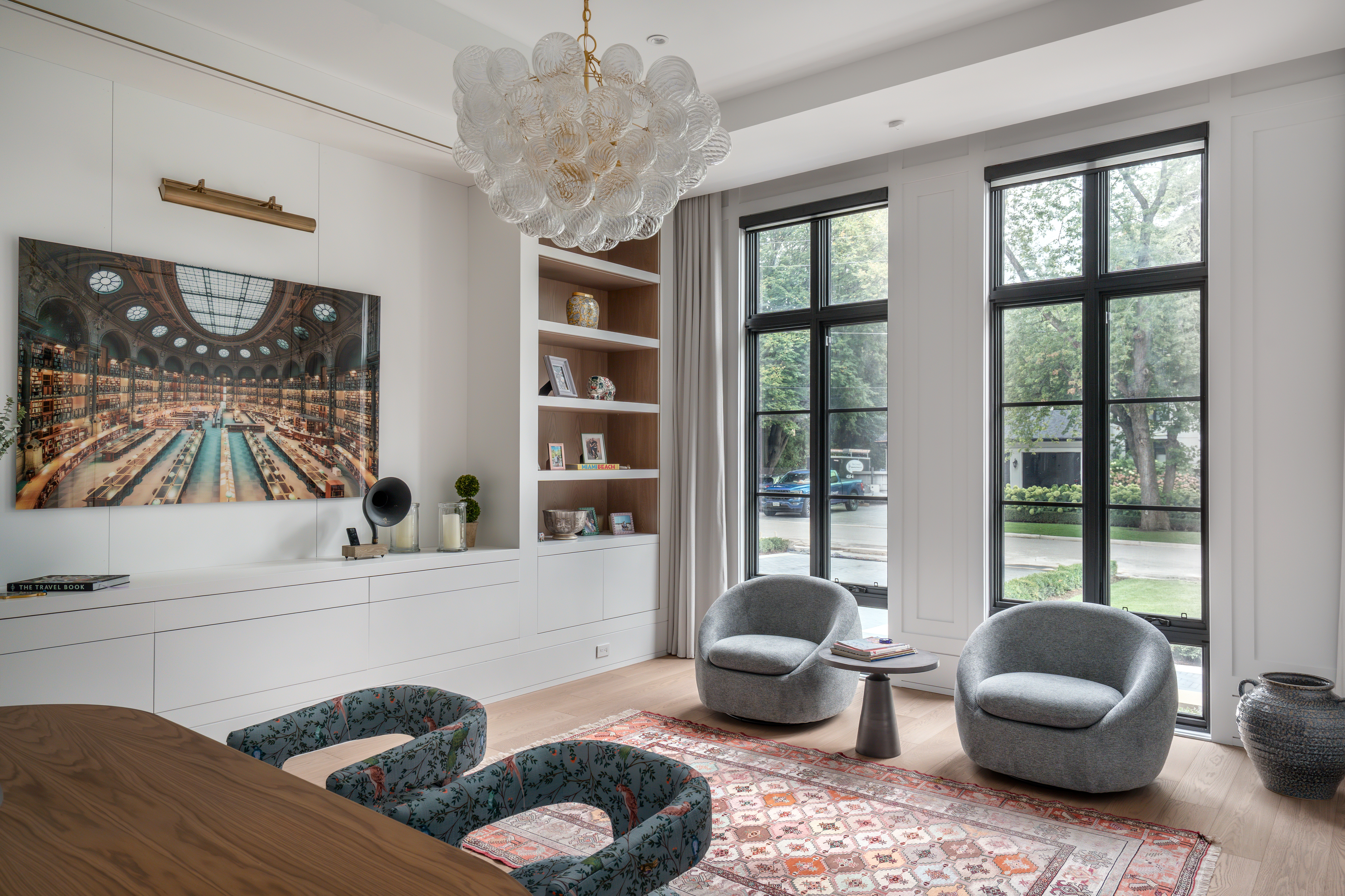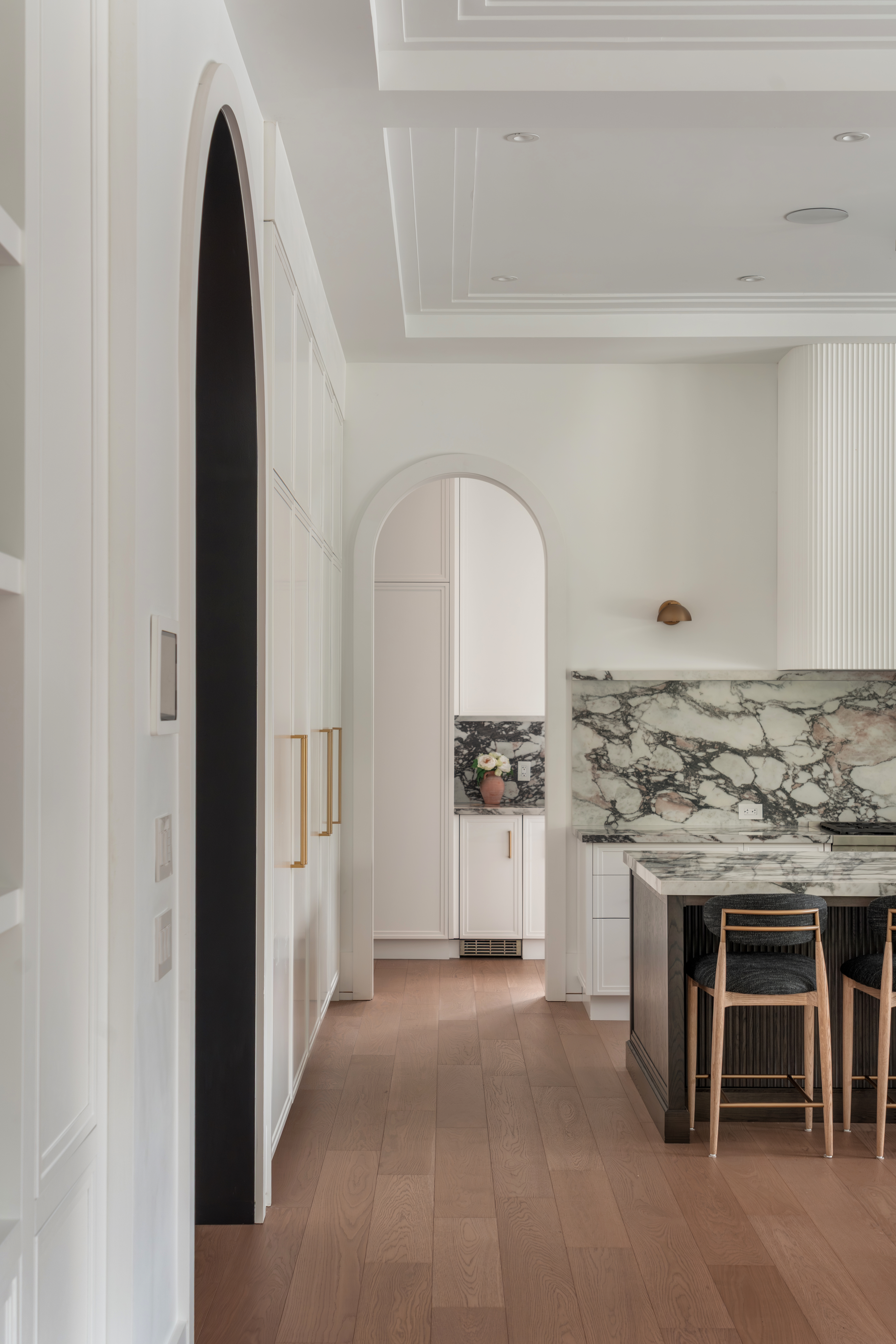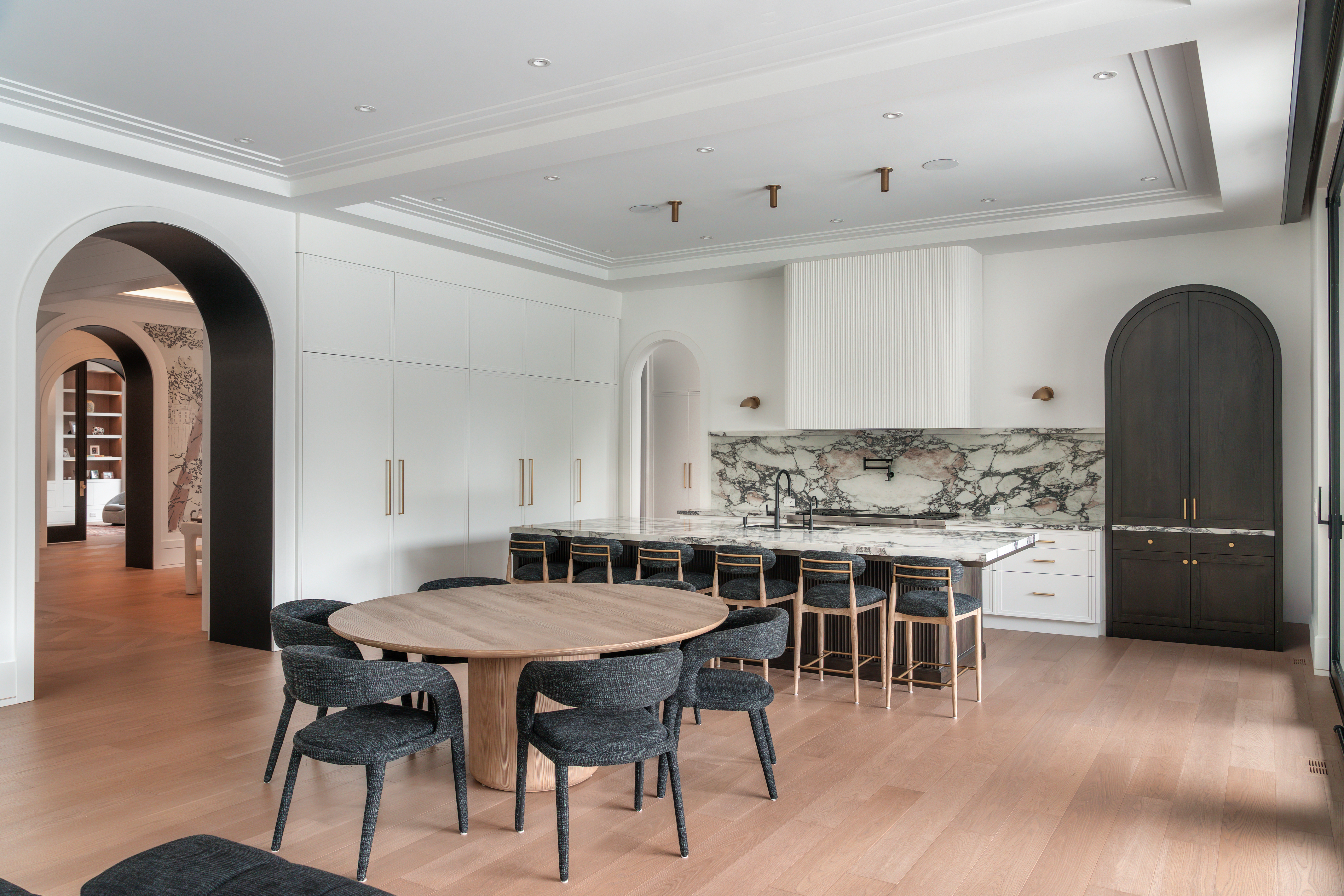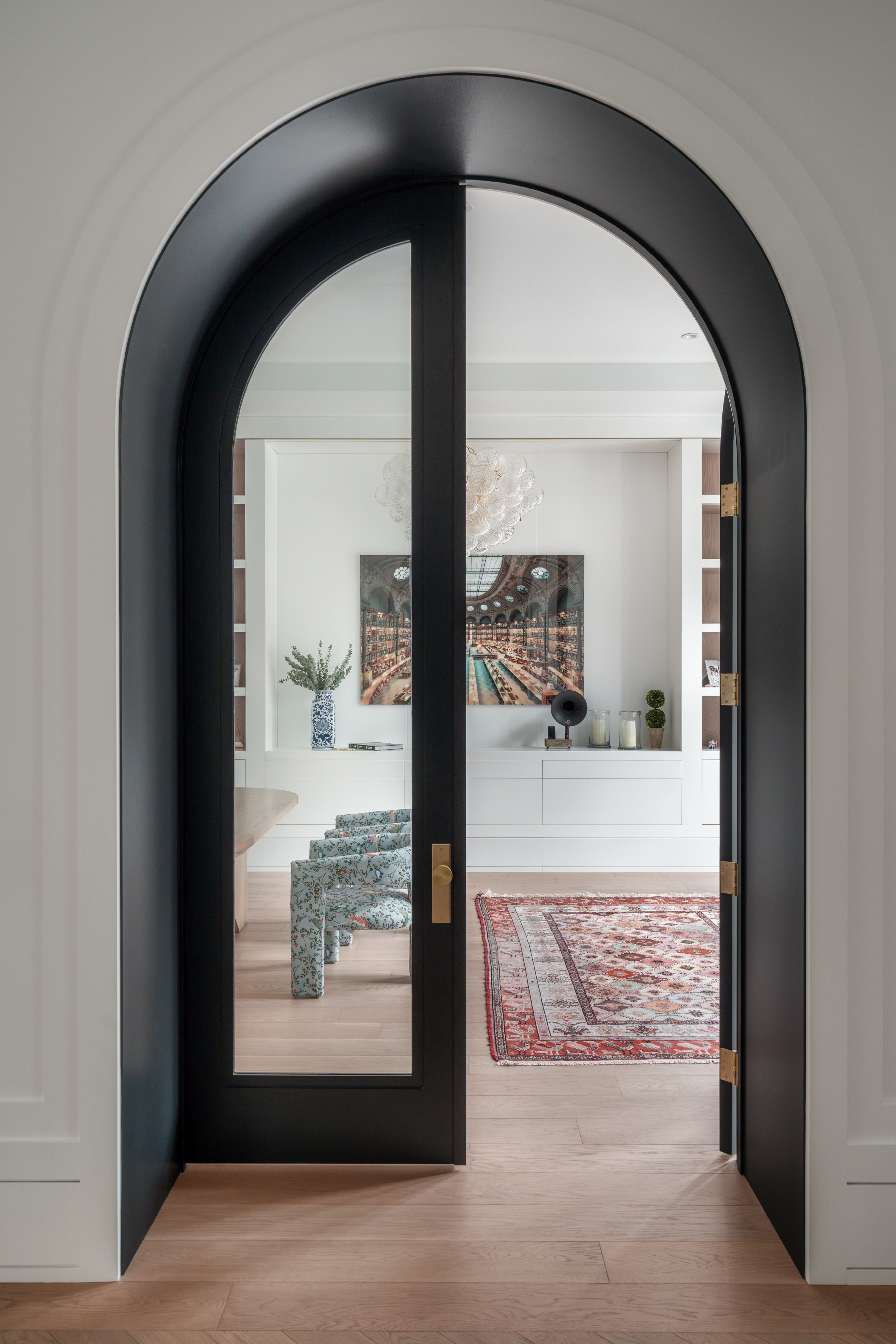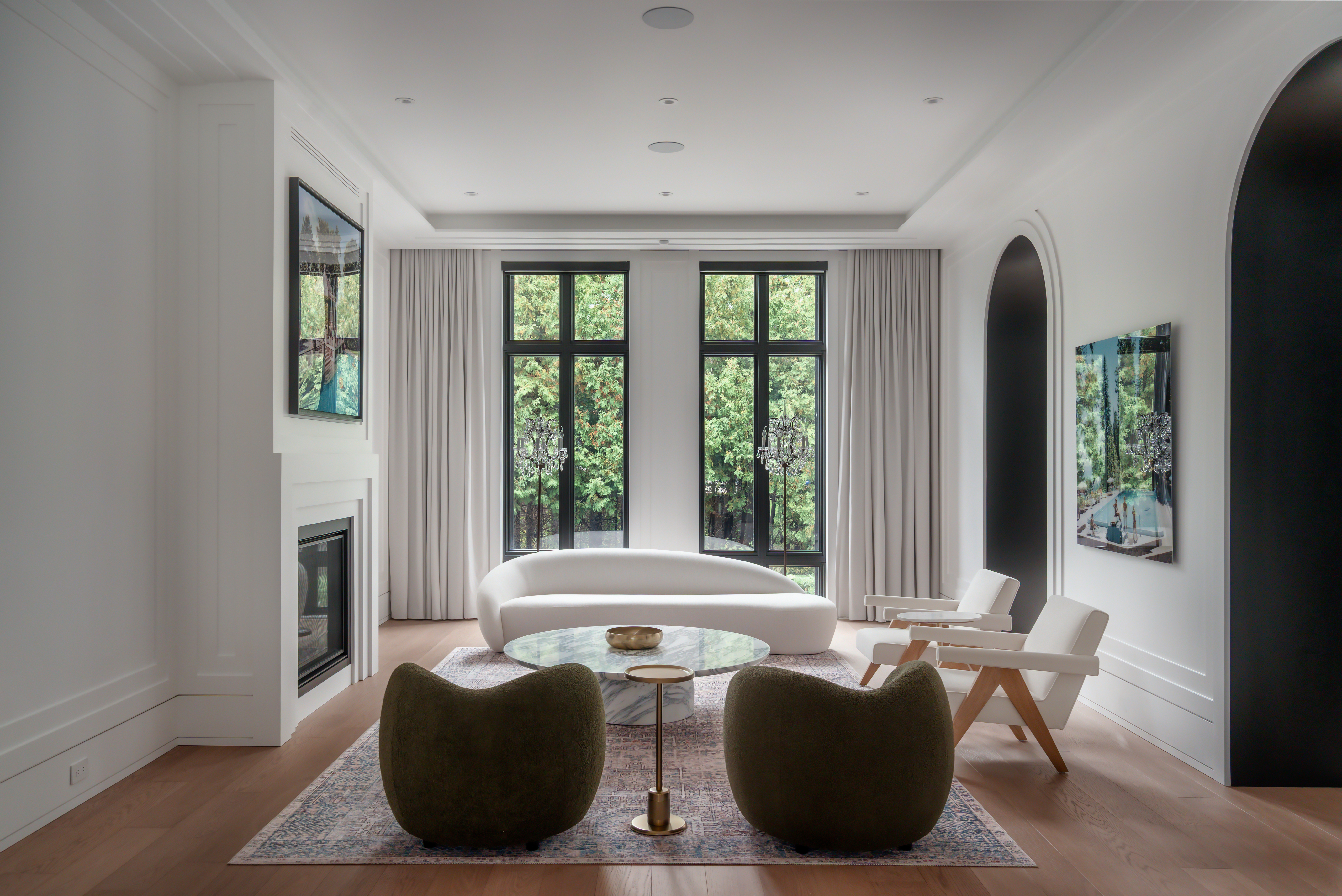 As both the architectural and interior design team, we approached the interior with the same focus on proportion, detail, and material richness. Arched openings soften the flow between rooms, while custom millwork, layered mouldings, and expansive sightlines anchor the interior architecture. The foyer and main hall feature herringbone wood flooring, adding warmth and texture that complement the home’s clean, modern detailing.