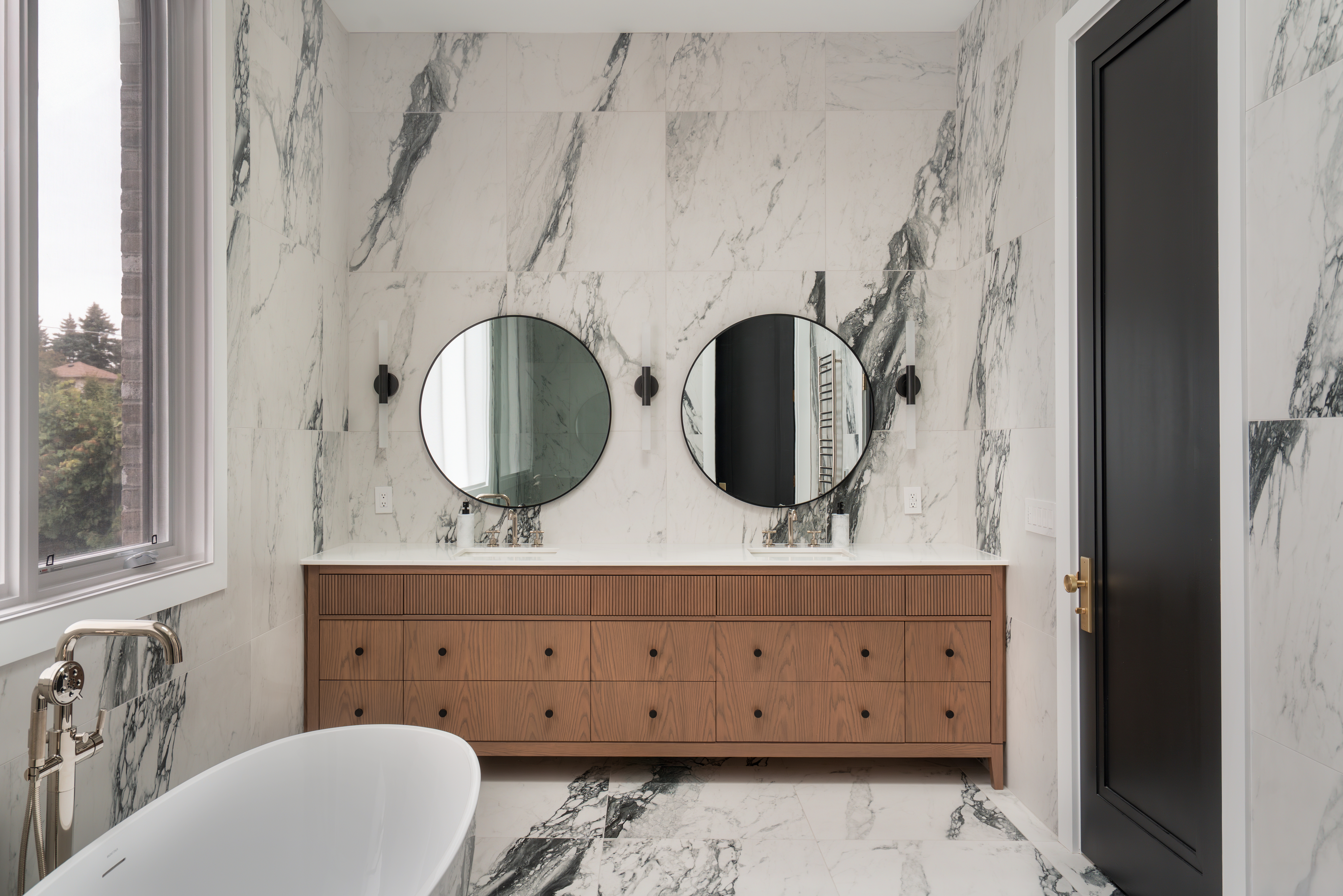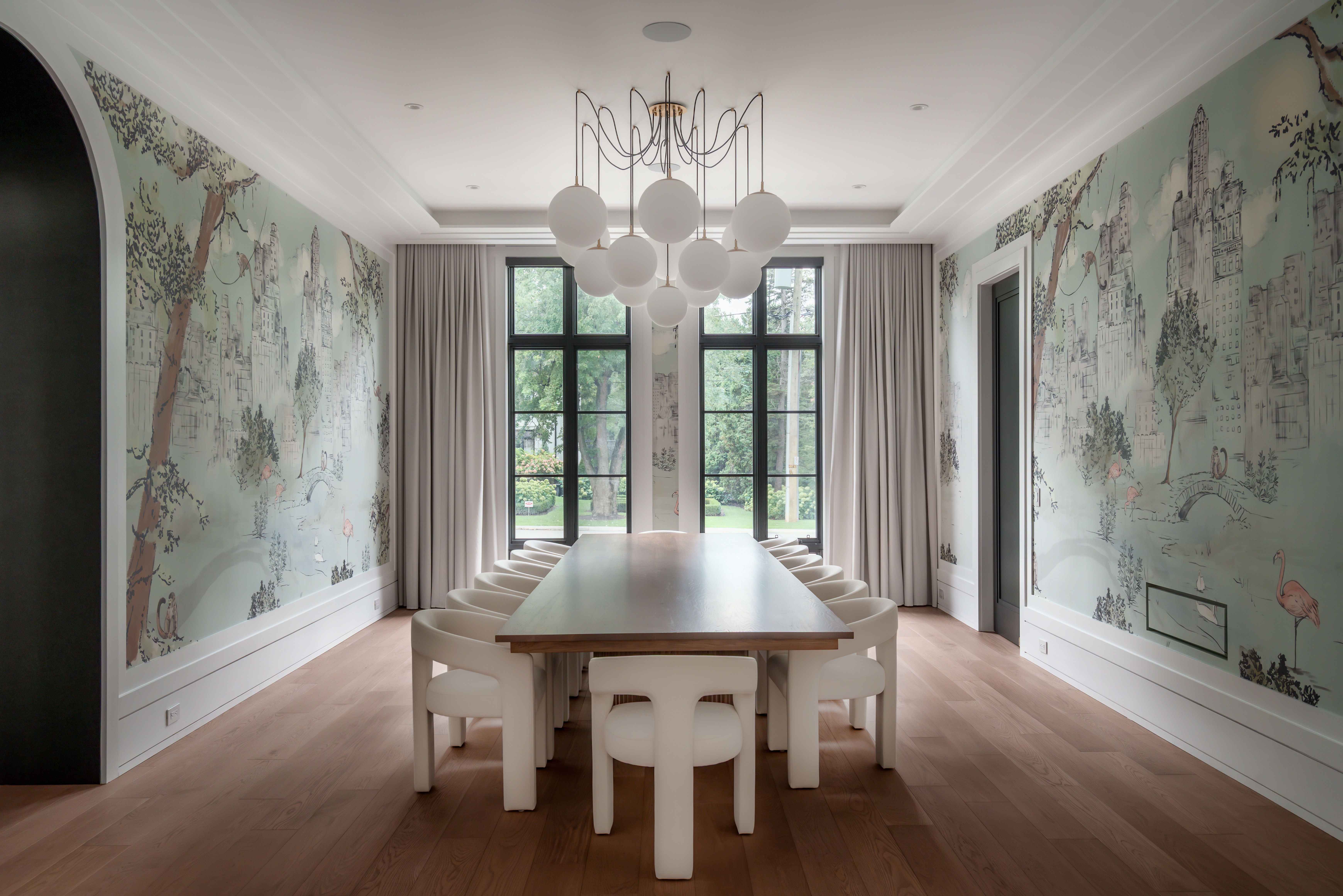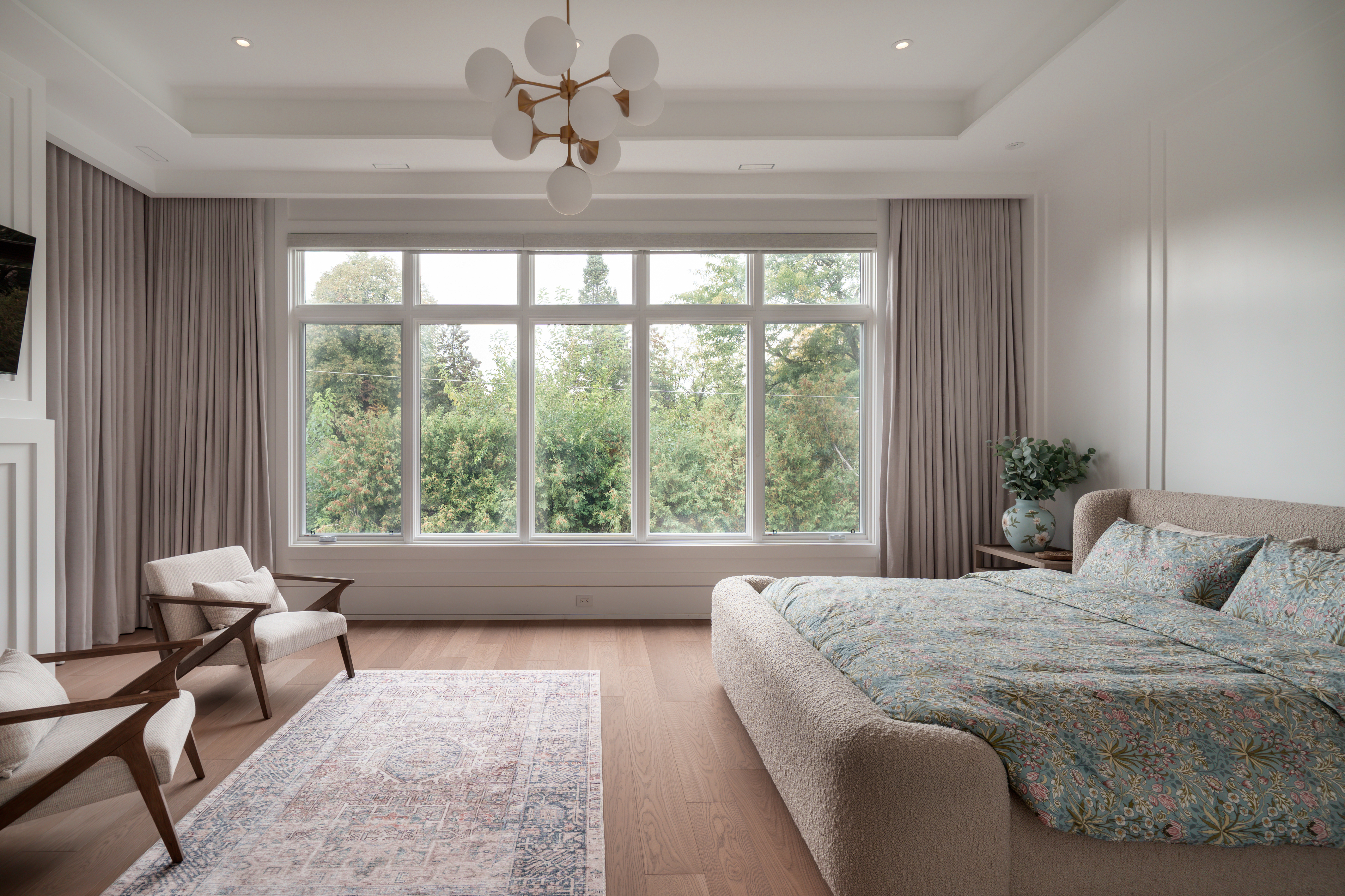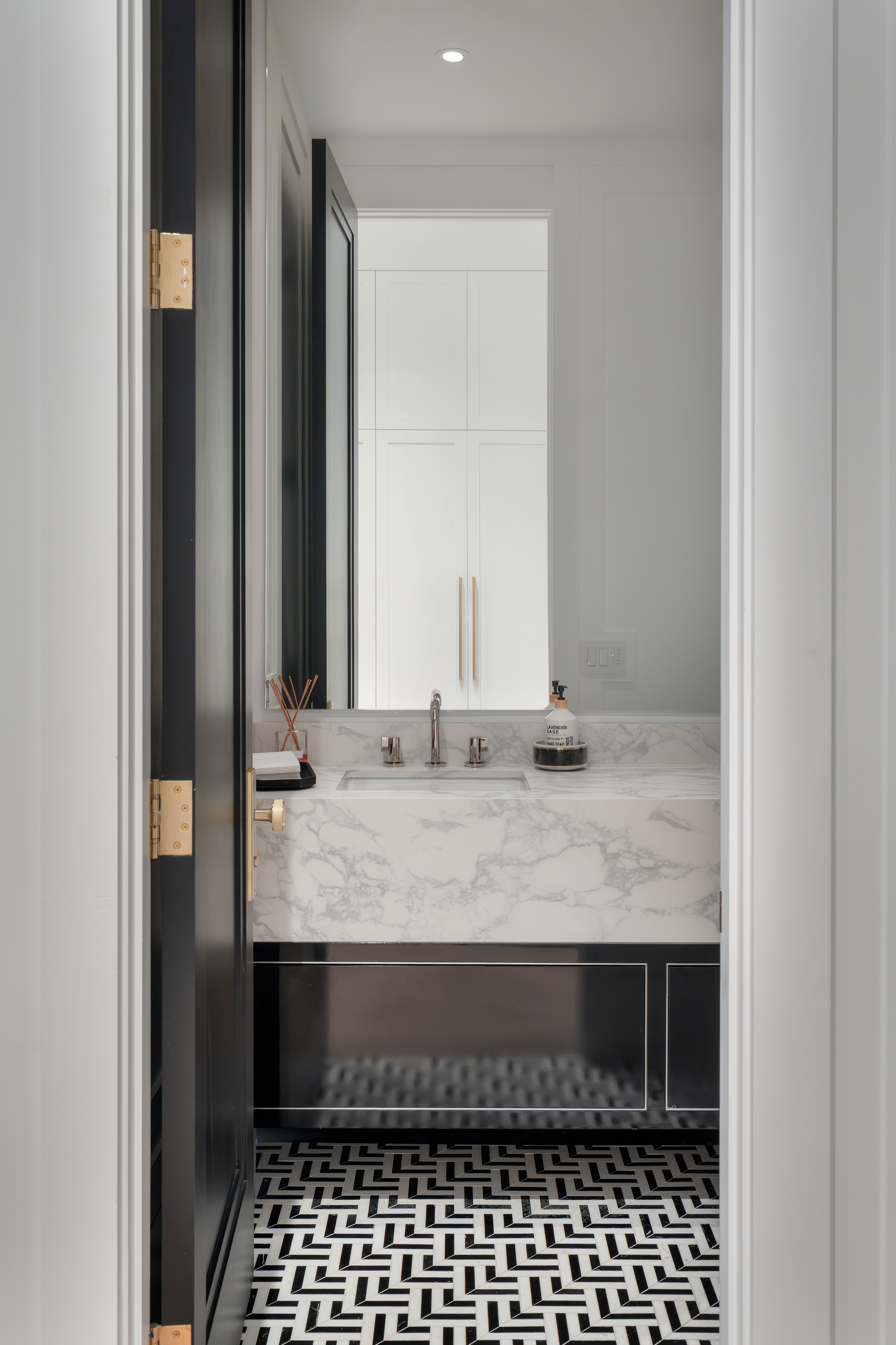 As both the architectural and interior design team, we approached the interior with the same focus on proportion, detail, and material richness. Arched openings soften the flow between rooms, while custom millwork, layered mouldings, and expansive sightlines anchor the interior architecture. The foyer and main hall feature herringbone wood flooring, adding warmth and texture that complement the home’s clean, modern detailing.