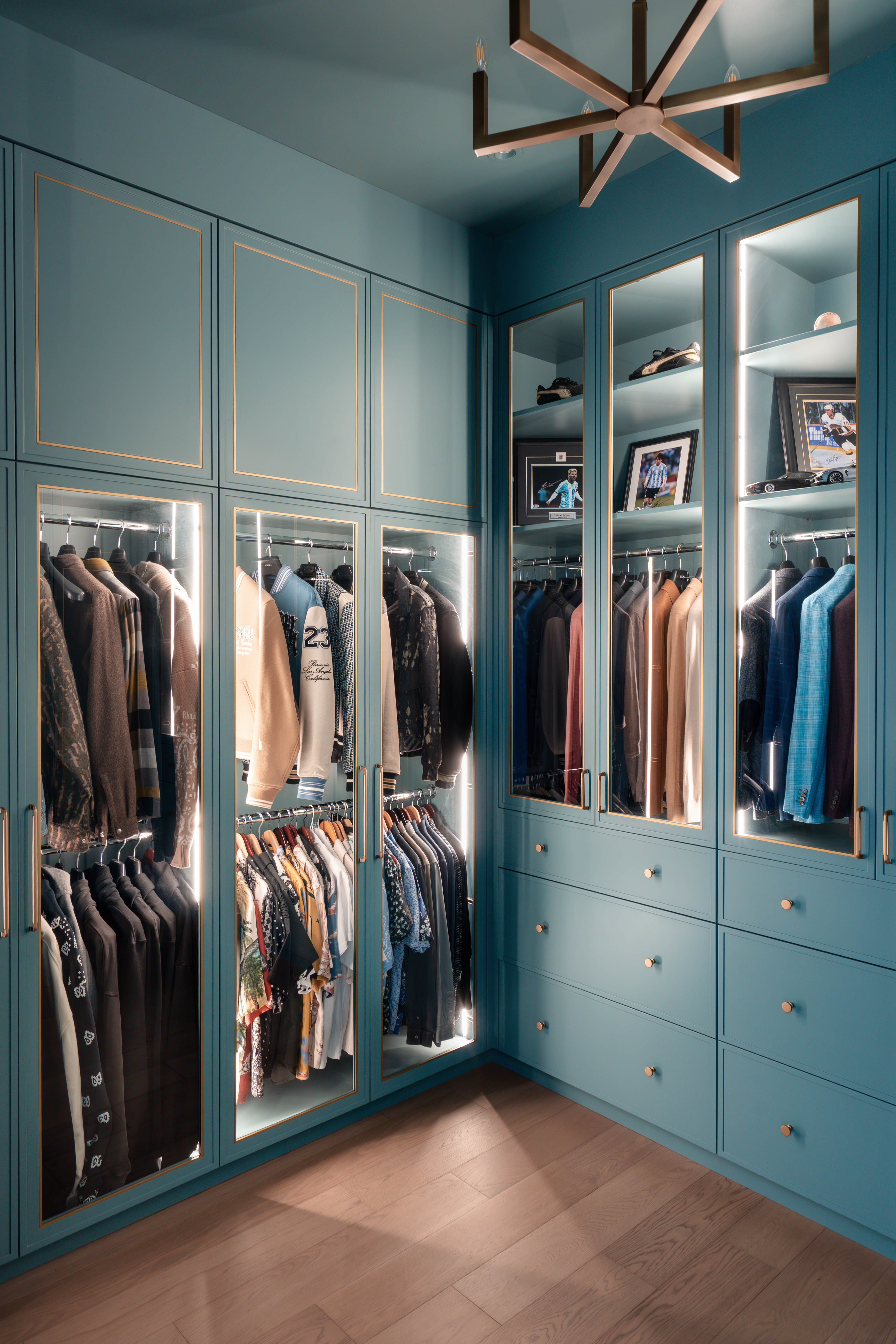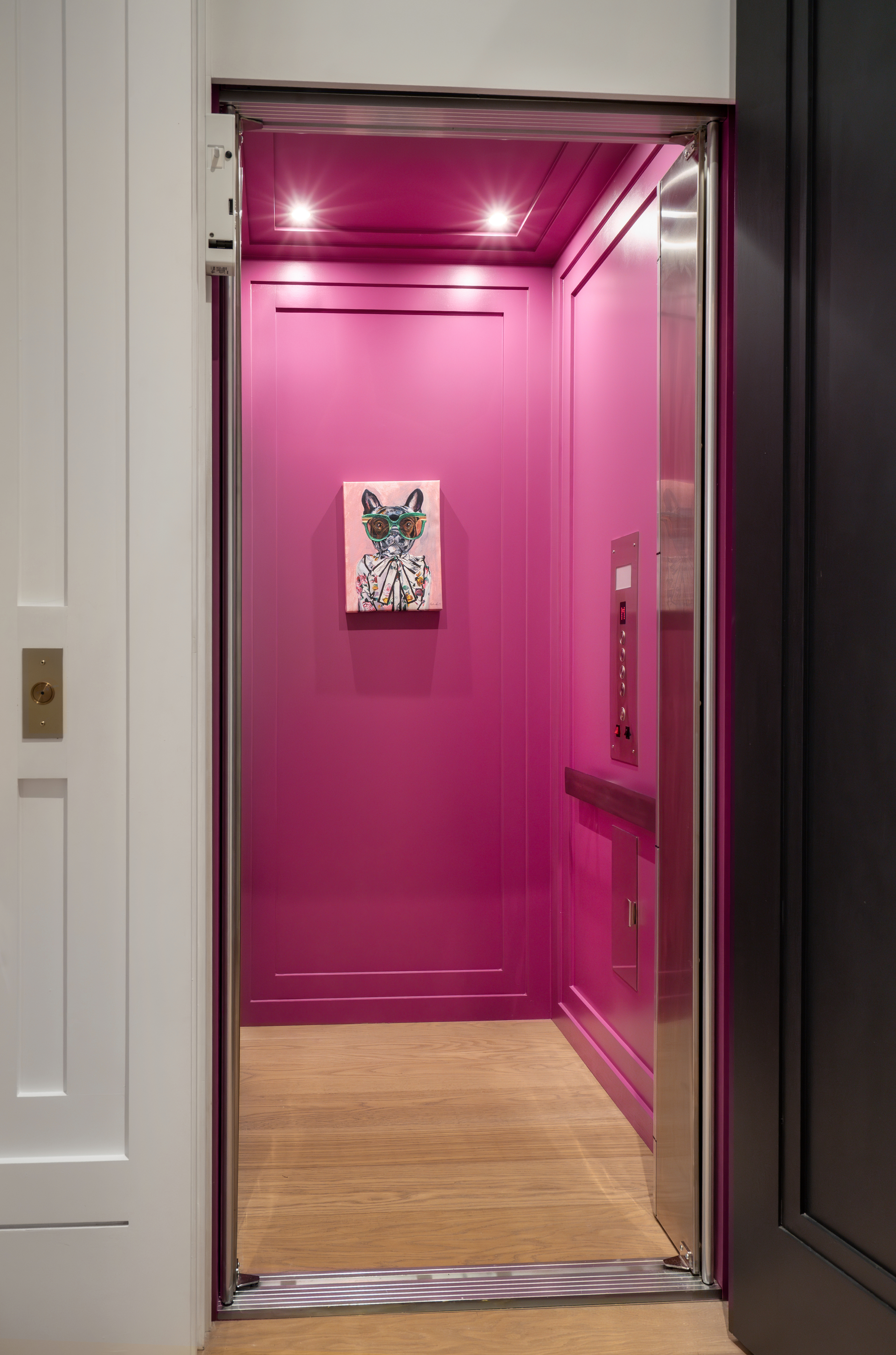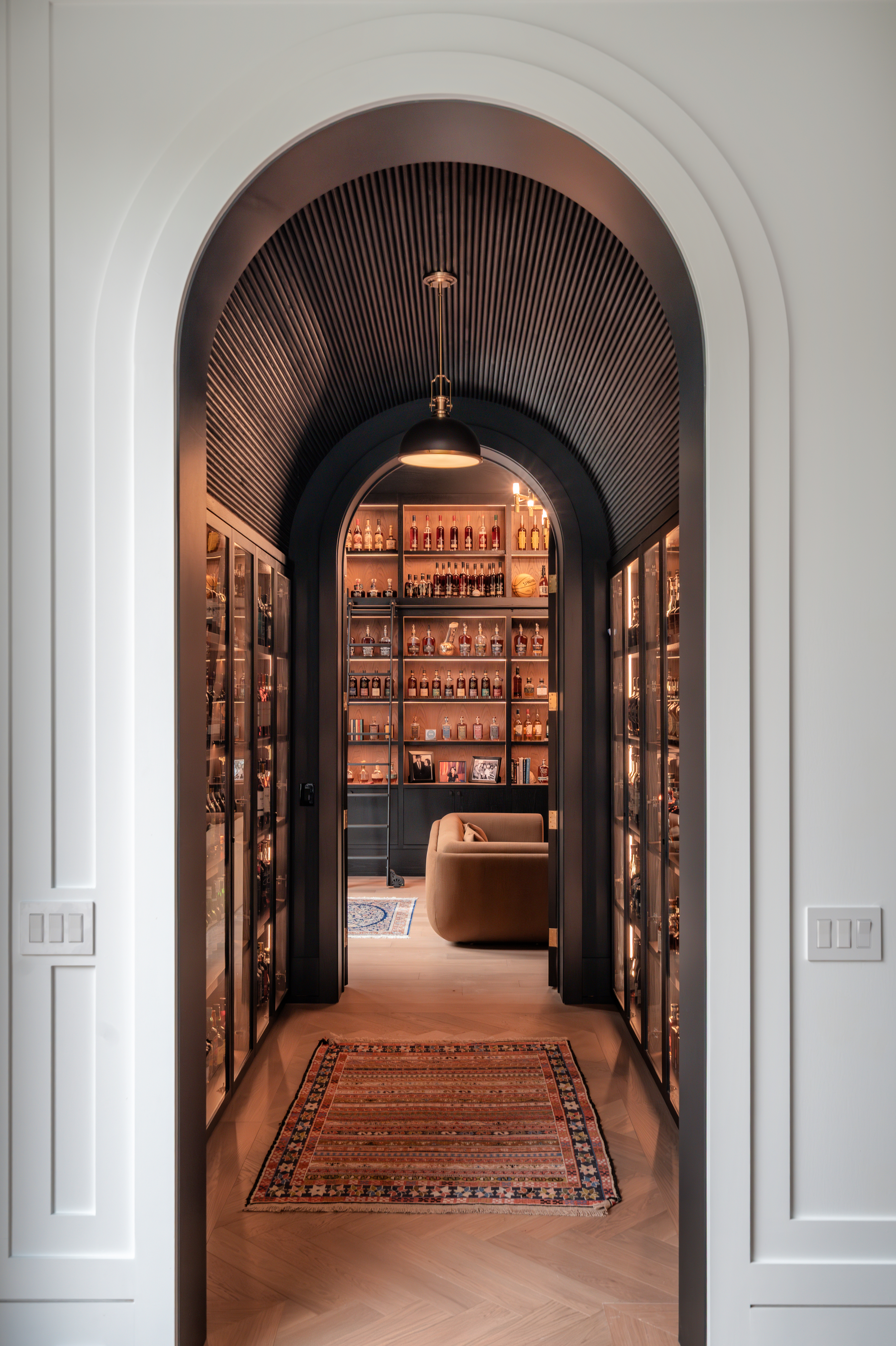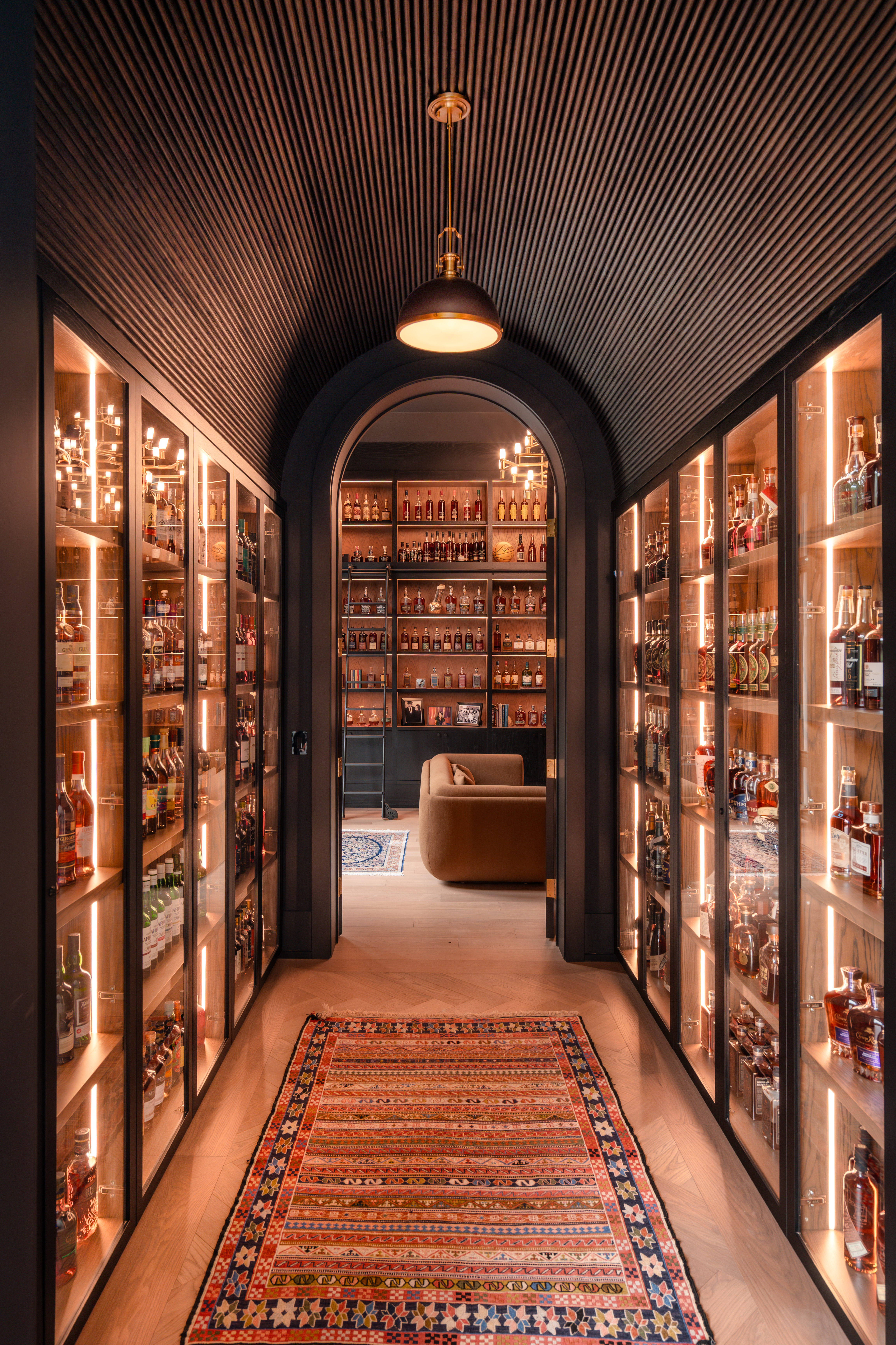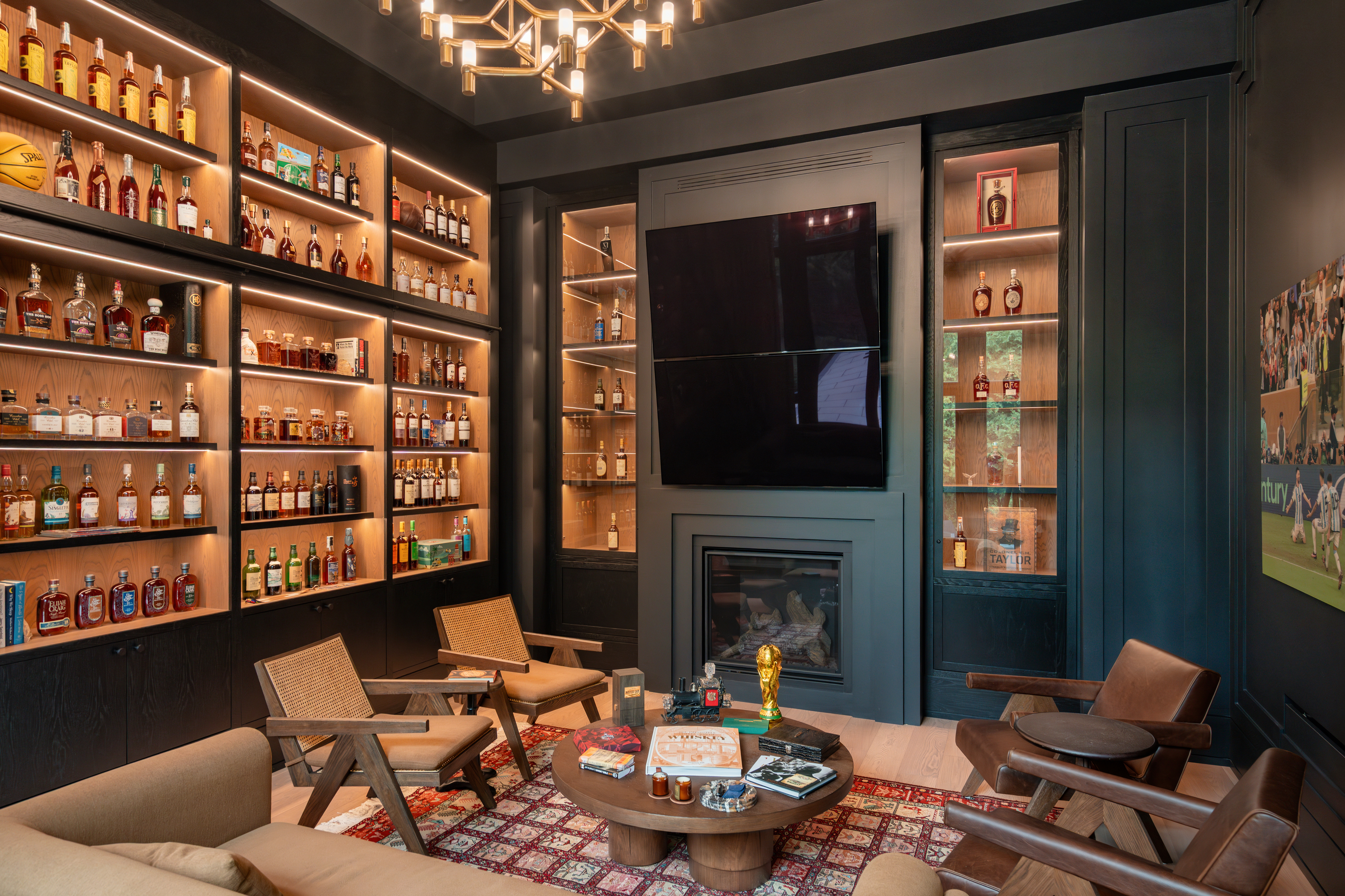 A standout feature of the design is the dedicated whiskey room—an intimate, moody retreat lined with illuminated display shelving, dark millwork, and a sculptural fireplace. This space provides a striking contrast to the home’s airy palette, offering a refined environment for conversation, tasting, and quiet escape.