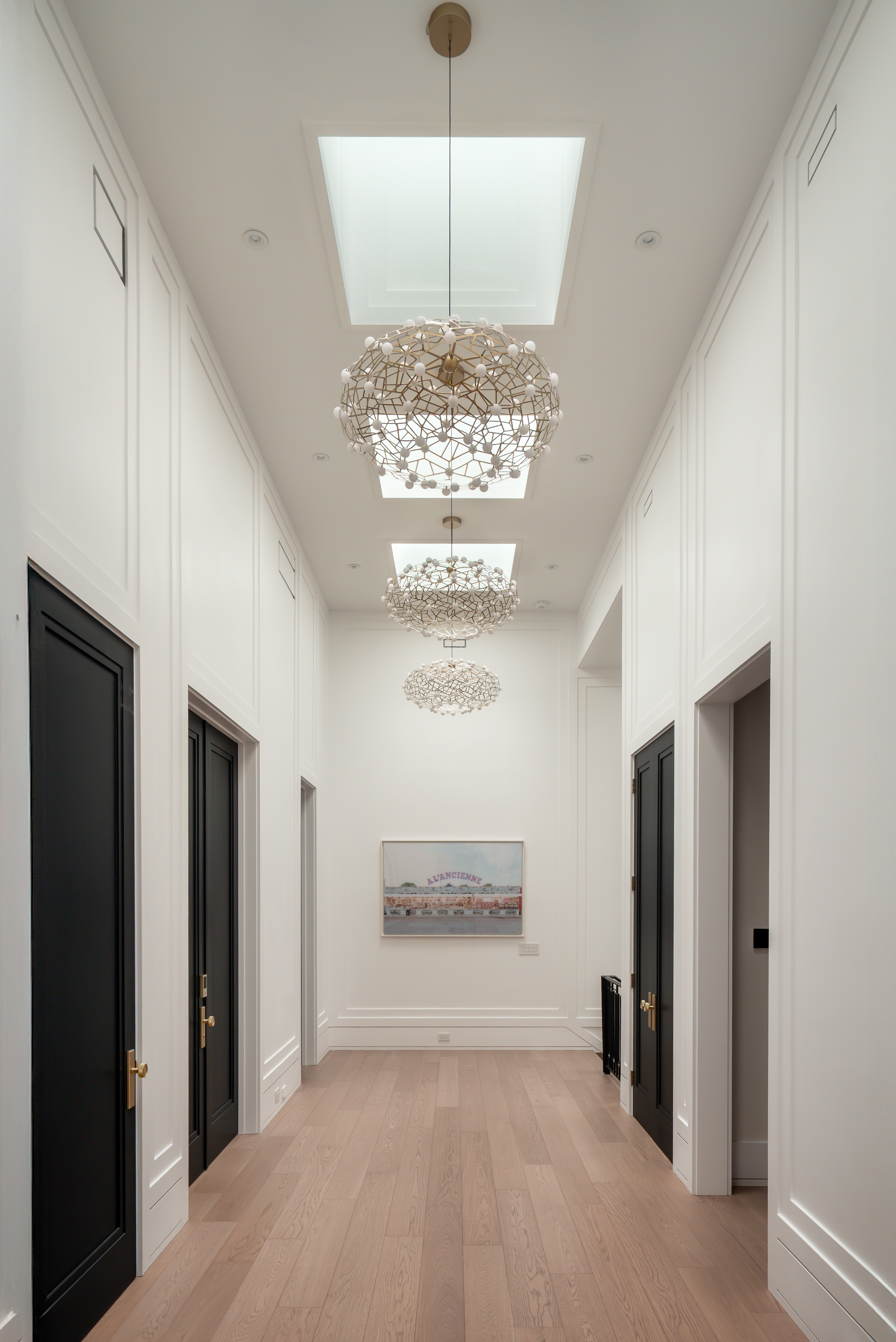A palette of light brick, stone detailing, and crisp black-framed windows reinforces its transitional character. Large expanses of glazing bring natural light deep into the home while preserving classical proportions and strong architectural symmetry. This harmony continues inside, where an intuitive layout guides you seamlessly from one space to the next.
