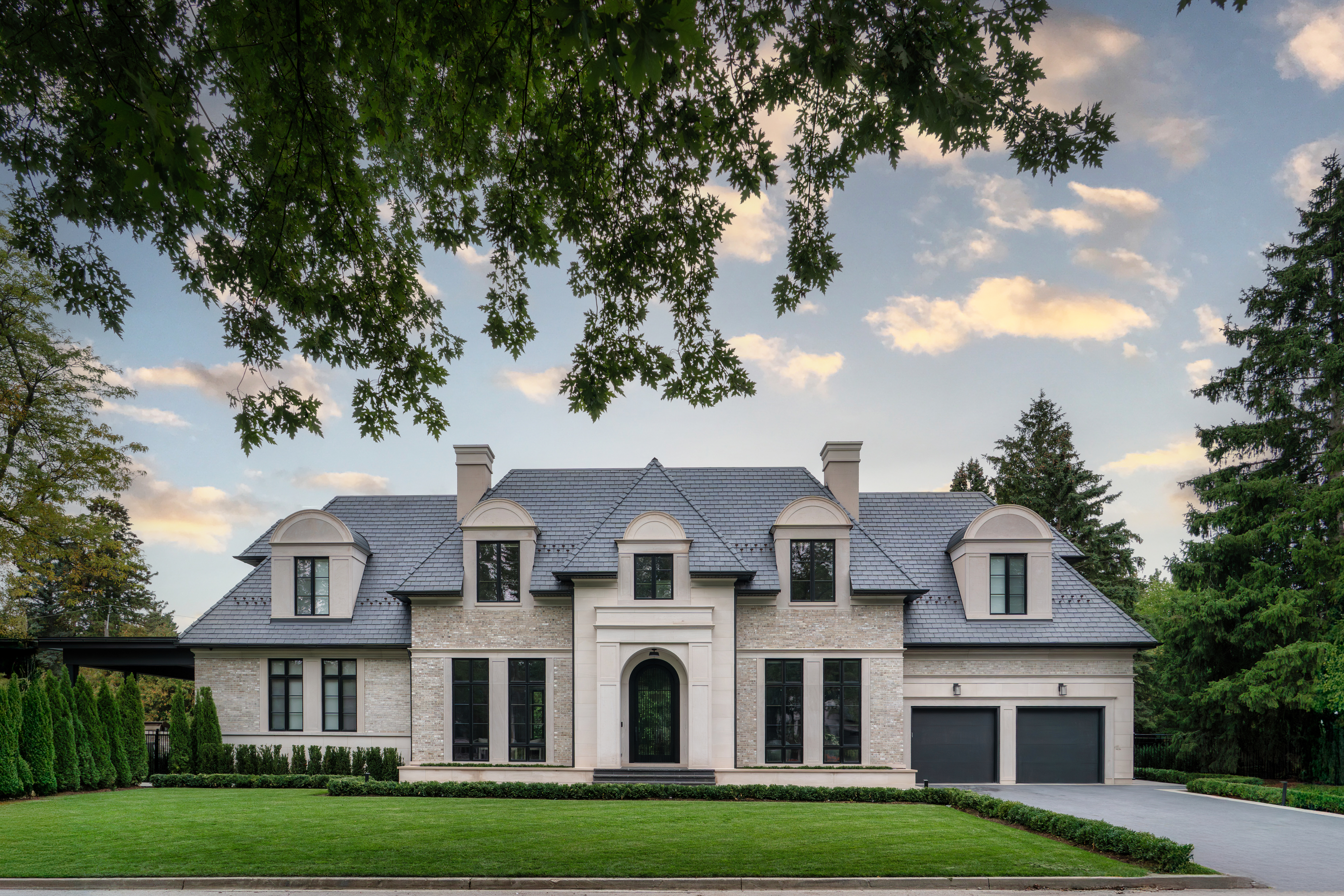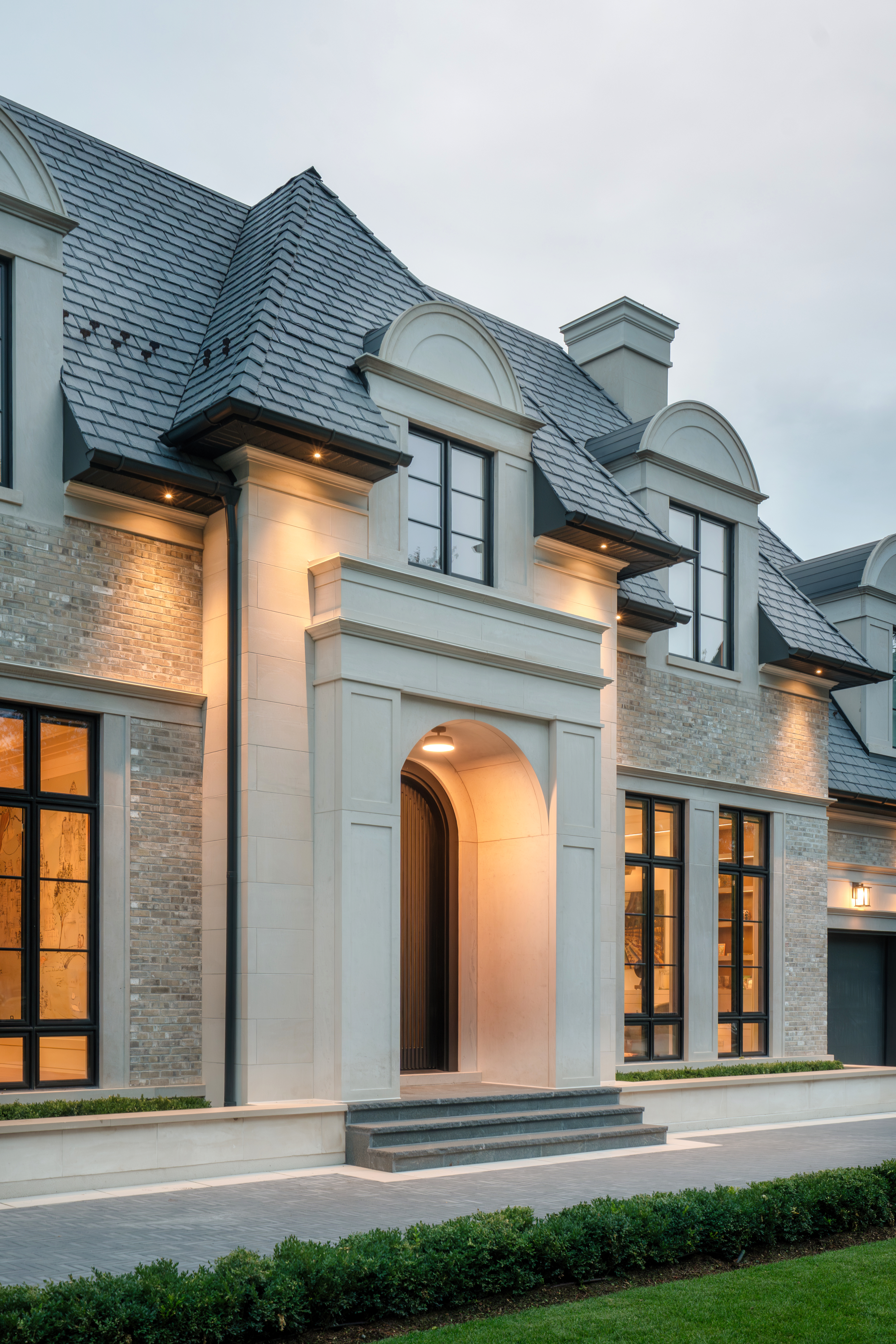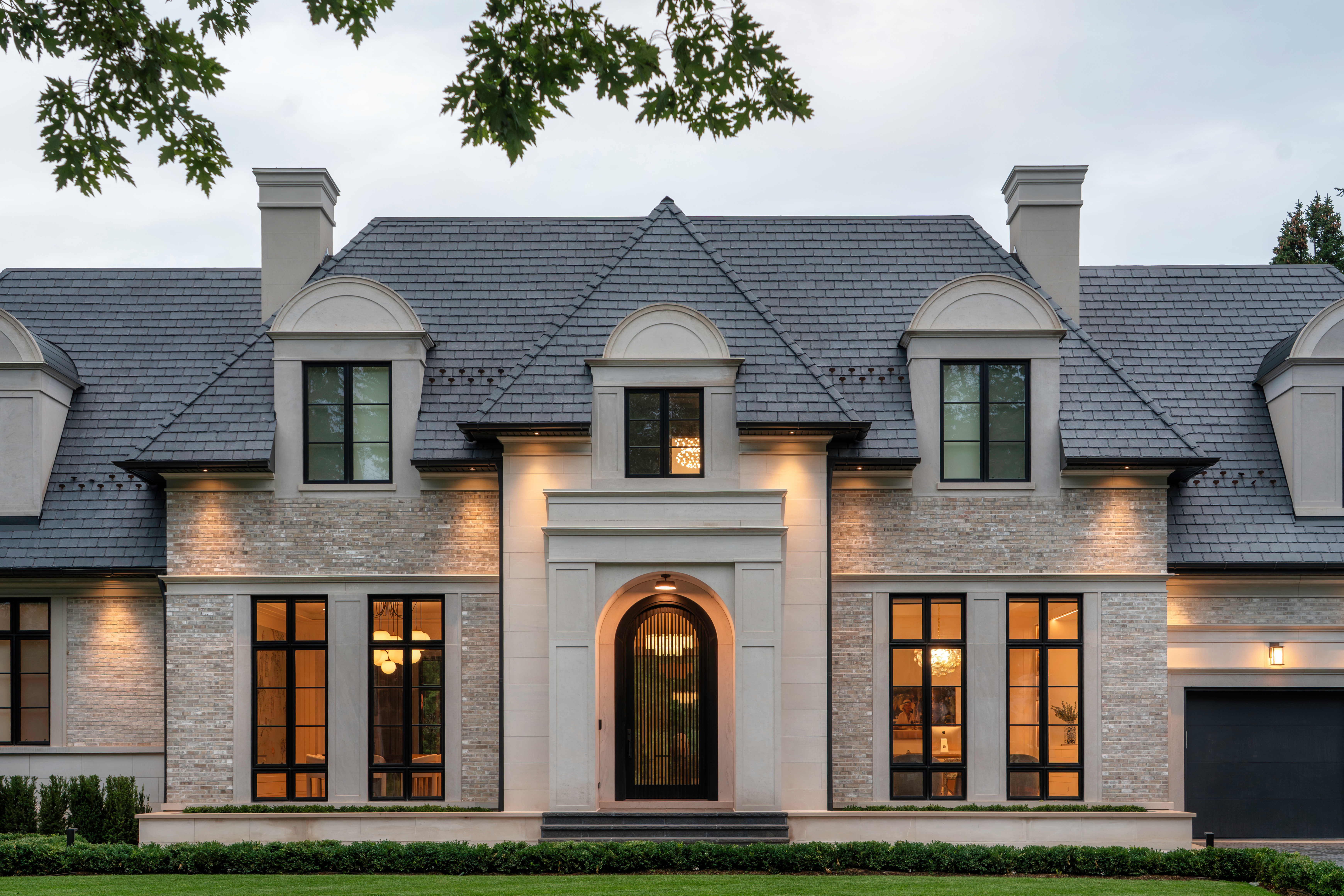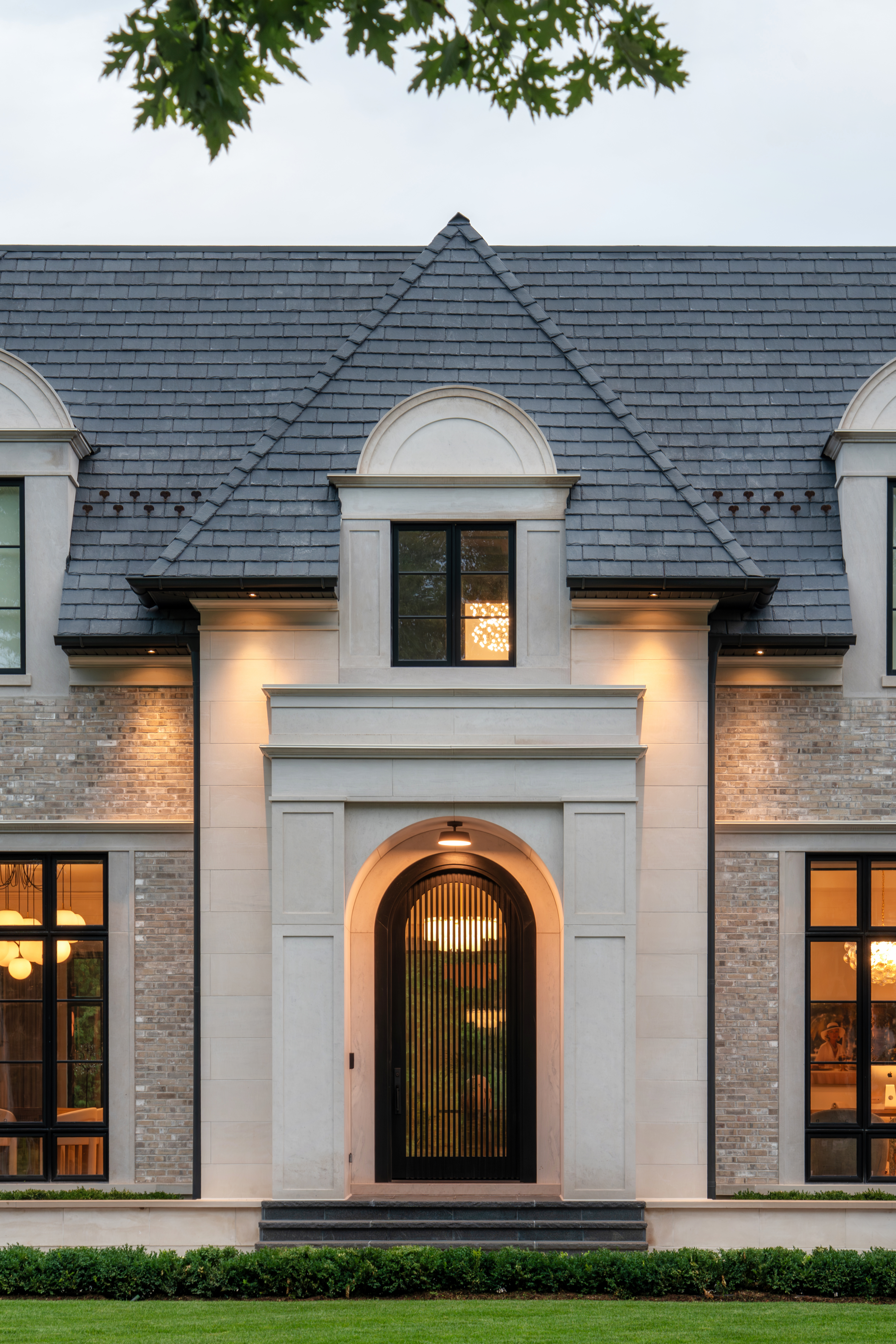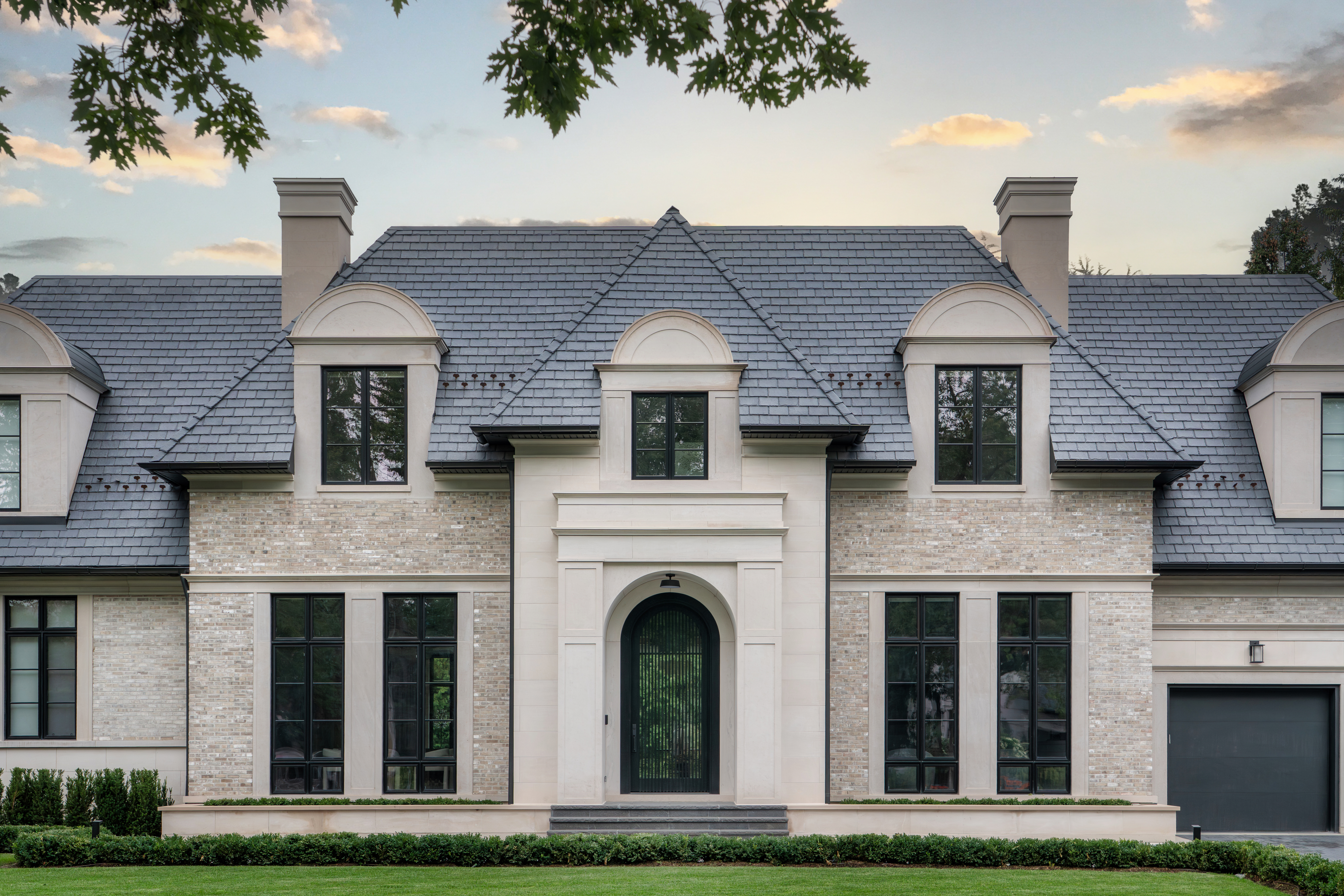This custom transitional home blends classic symmetry with modern craftsmanship, creating a residence that feels both timeless and distinctly contemporary. The façade is defined by a perfectly balanced composition—twin chimneys framing the roofline, paired curved dormers, and a central entry pavilion that introduces a sense of quiet grandeur. The soft, sculptural form of the dormers adds refinement to the steep roofline, enhancing the home’s stately presence from the street.