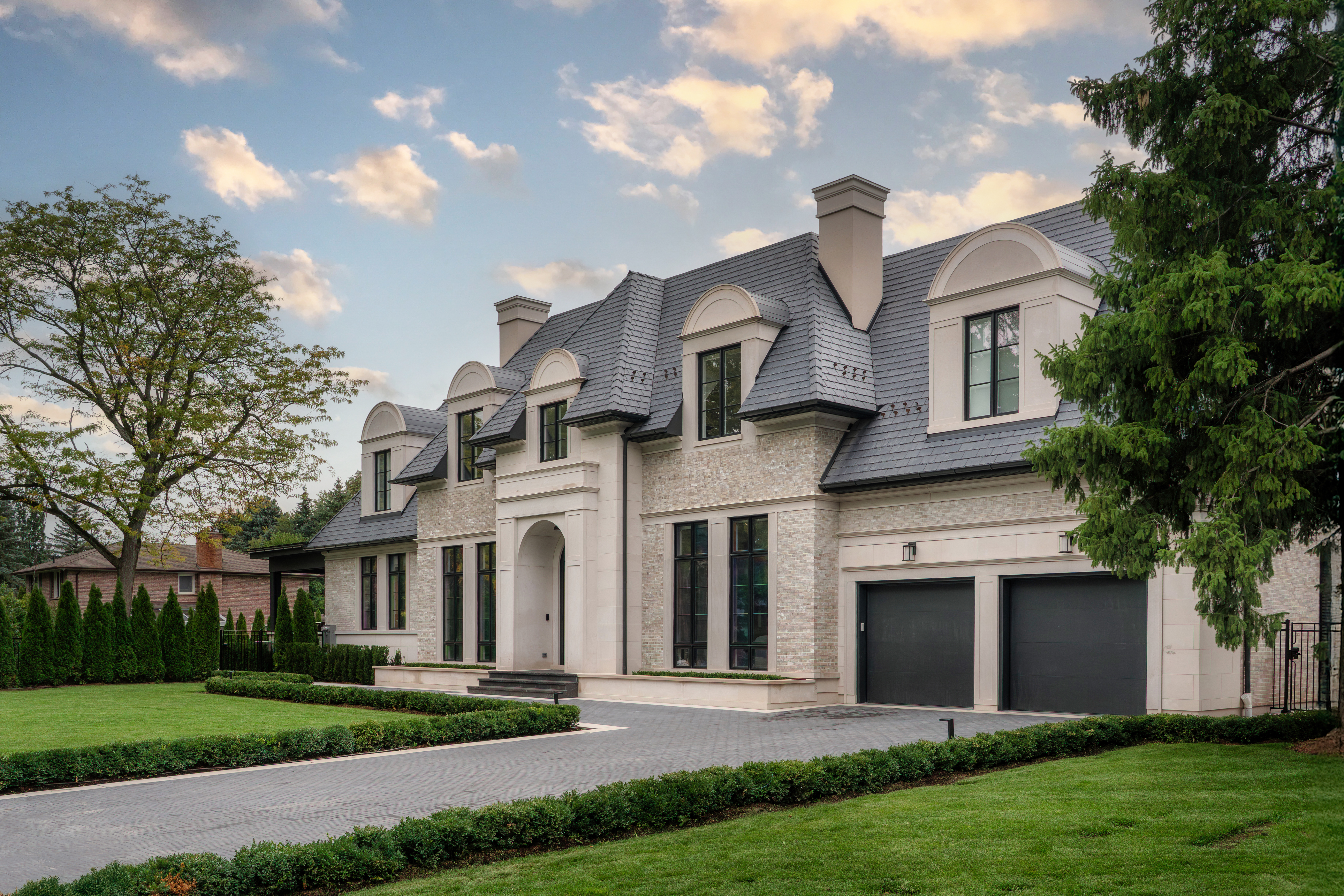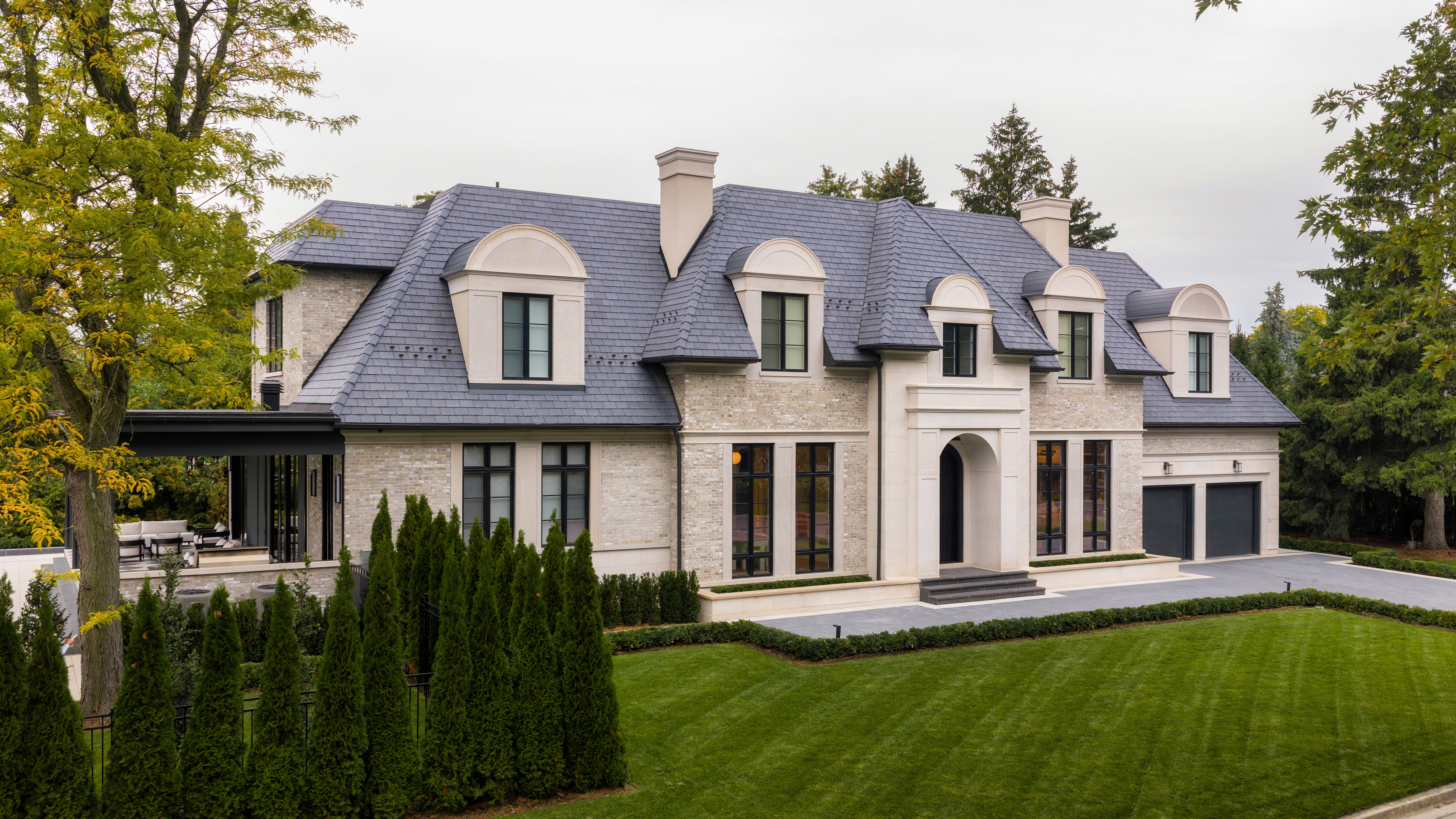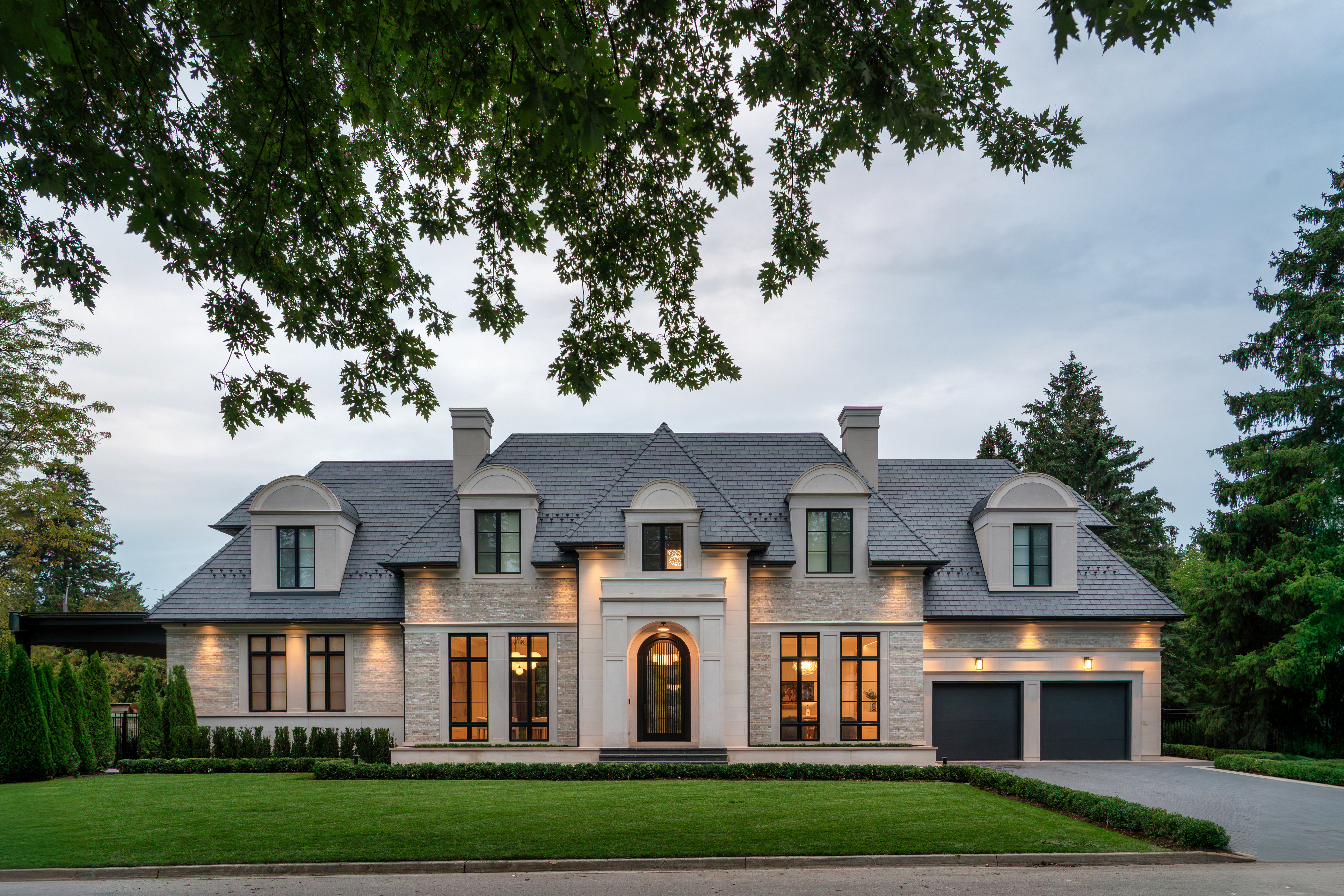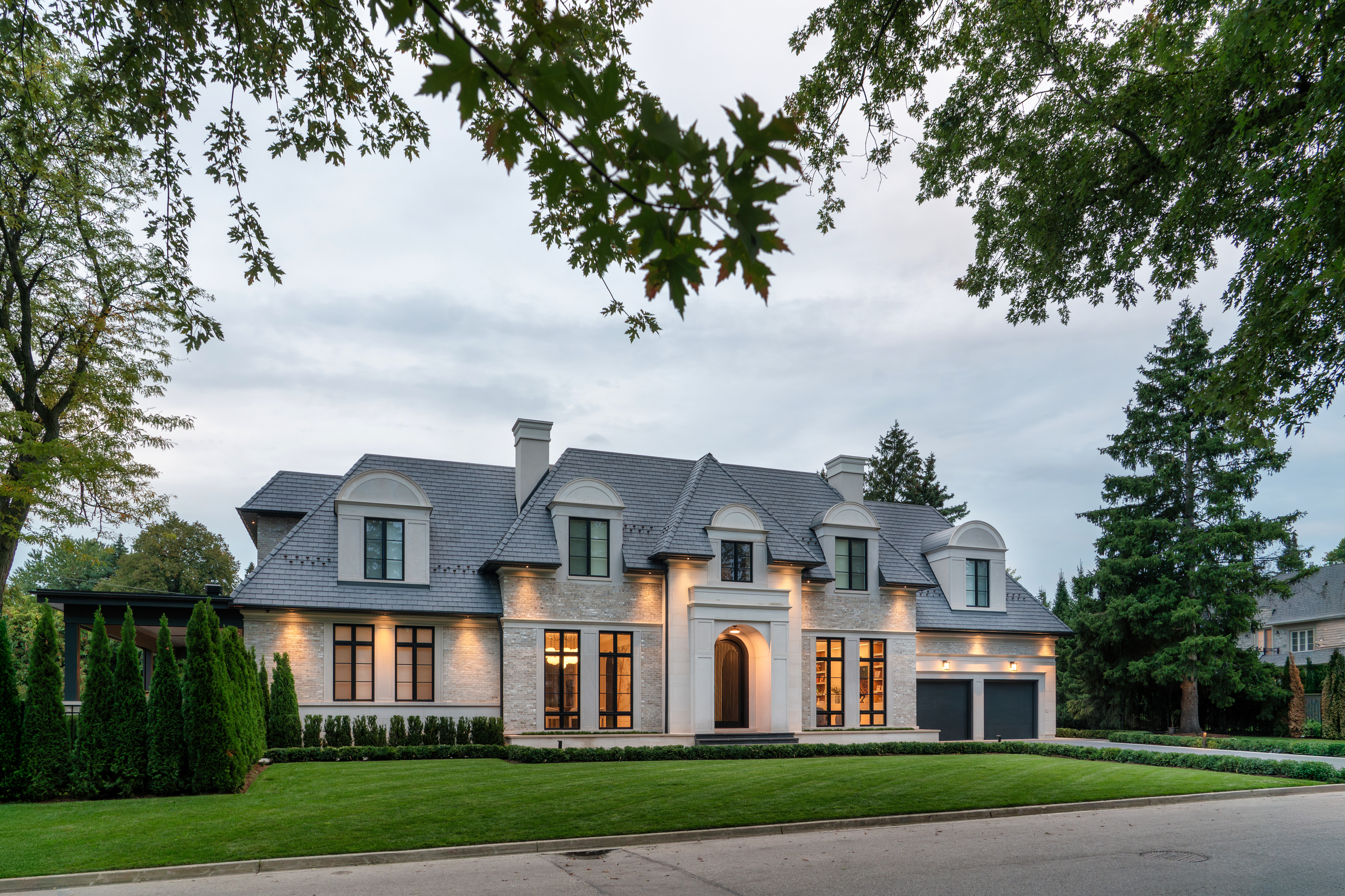 This custom transitional home blends classic symmetry with modern craftsmanship, creating a residence that feels both timeless and distinctly contemporary. The façade is defined by a perfectly balanced composition—twin chimneys framing the roofline, paired curved dormers, and a central entry pavilion that introduces a sense of quiet grandeur. The soft, sculptural form of the dormers adds refinement to the steep roofline, enhancing the home’s stately presence from the street.