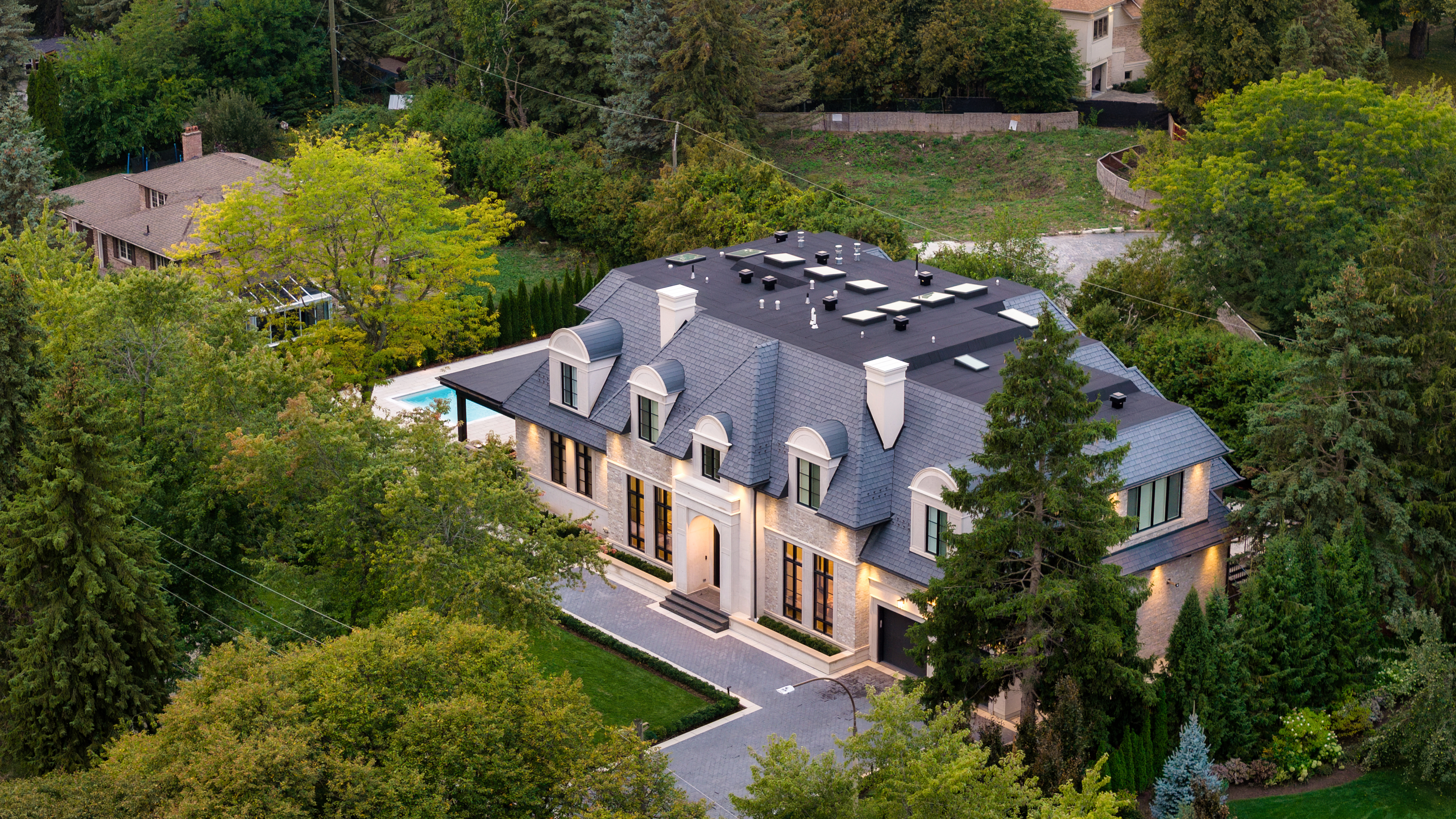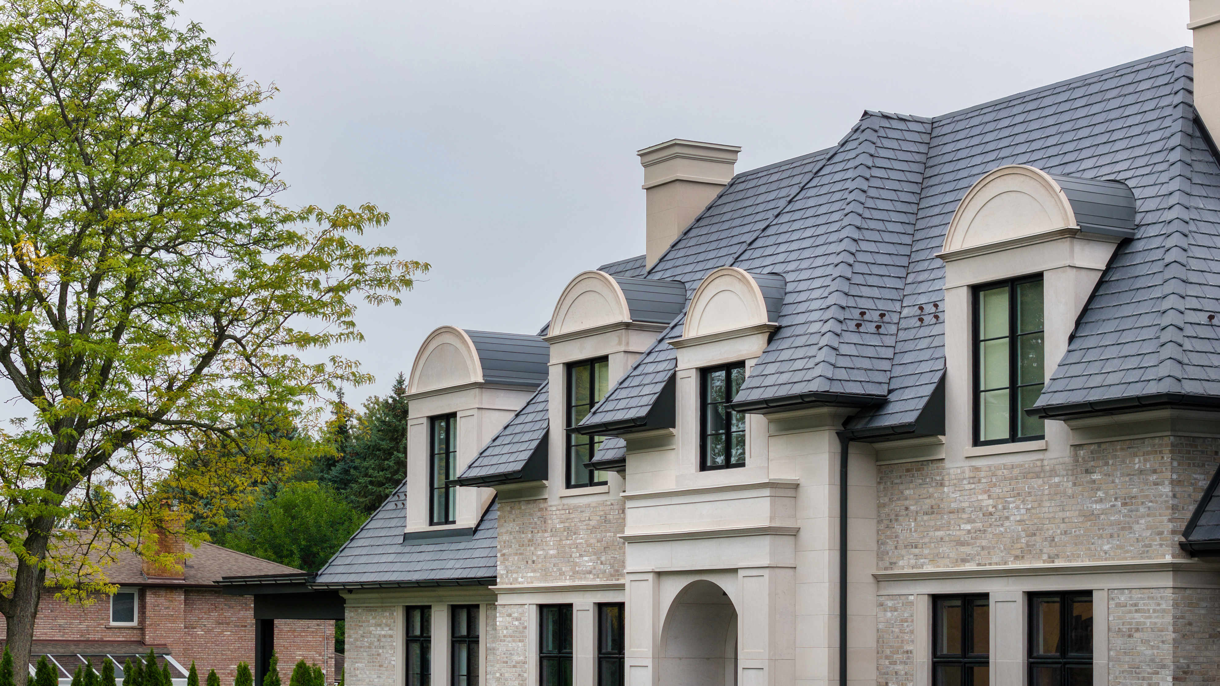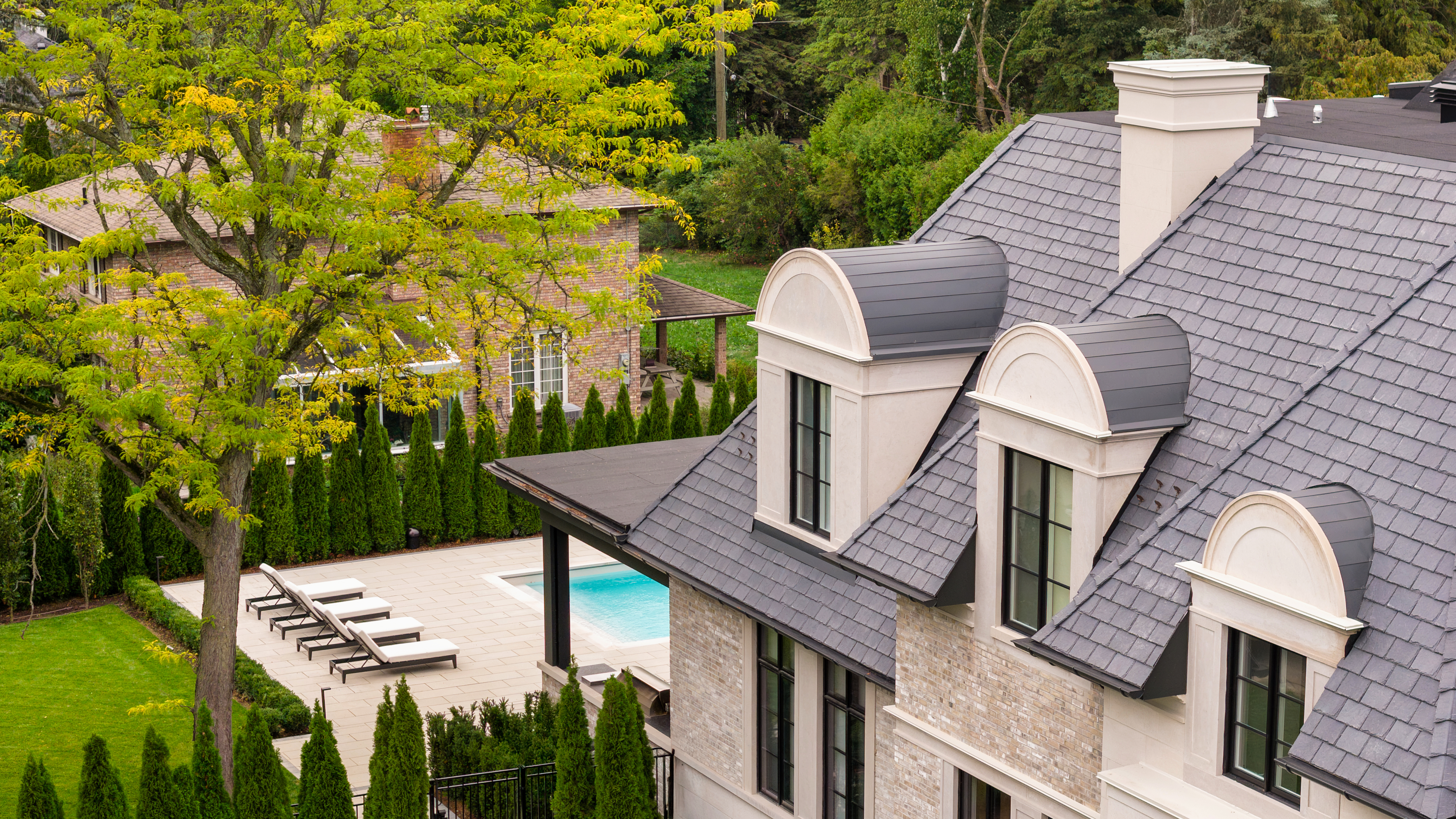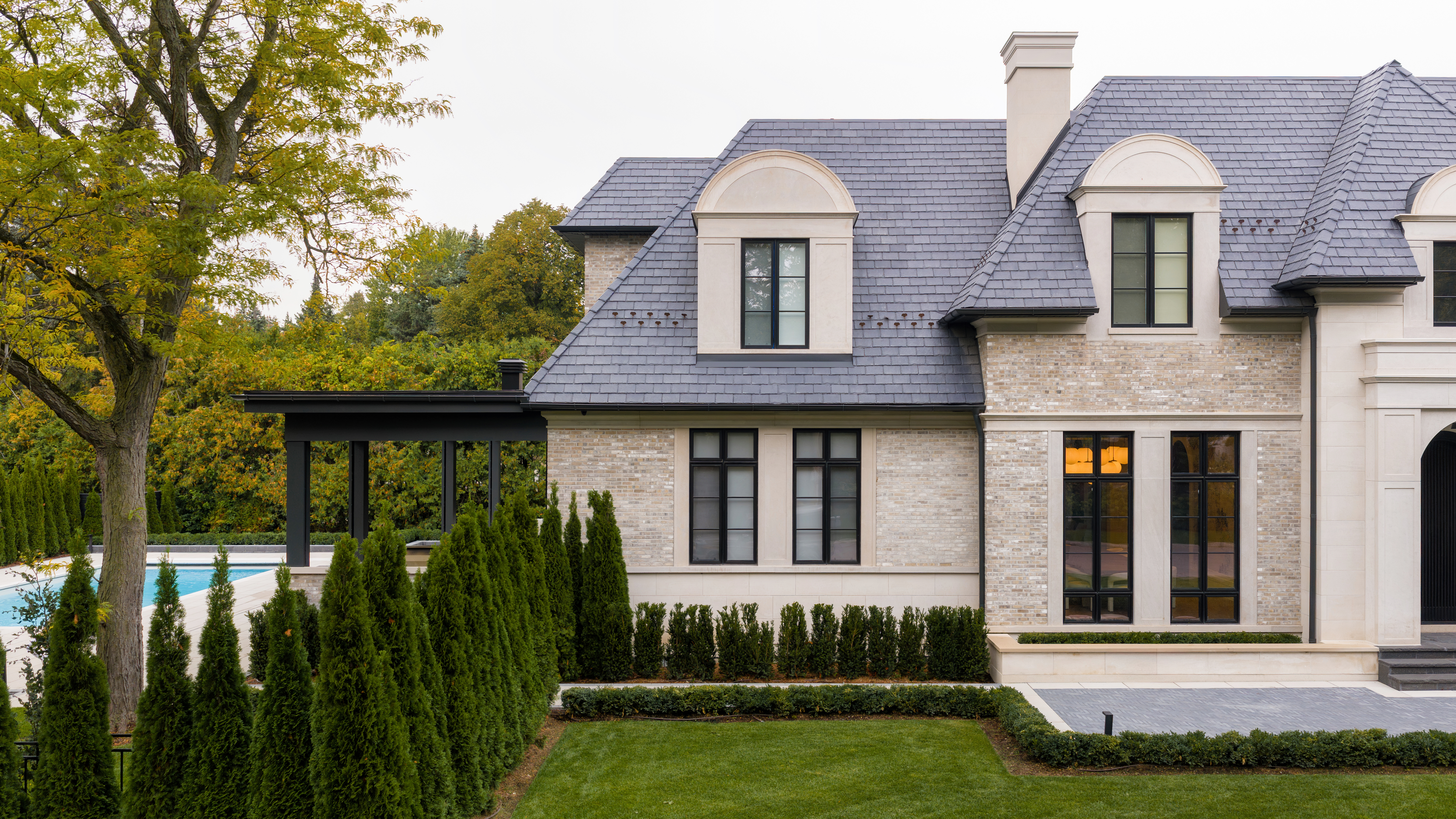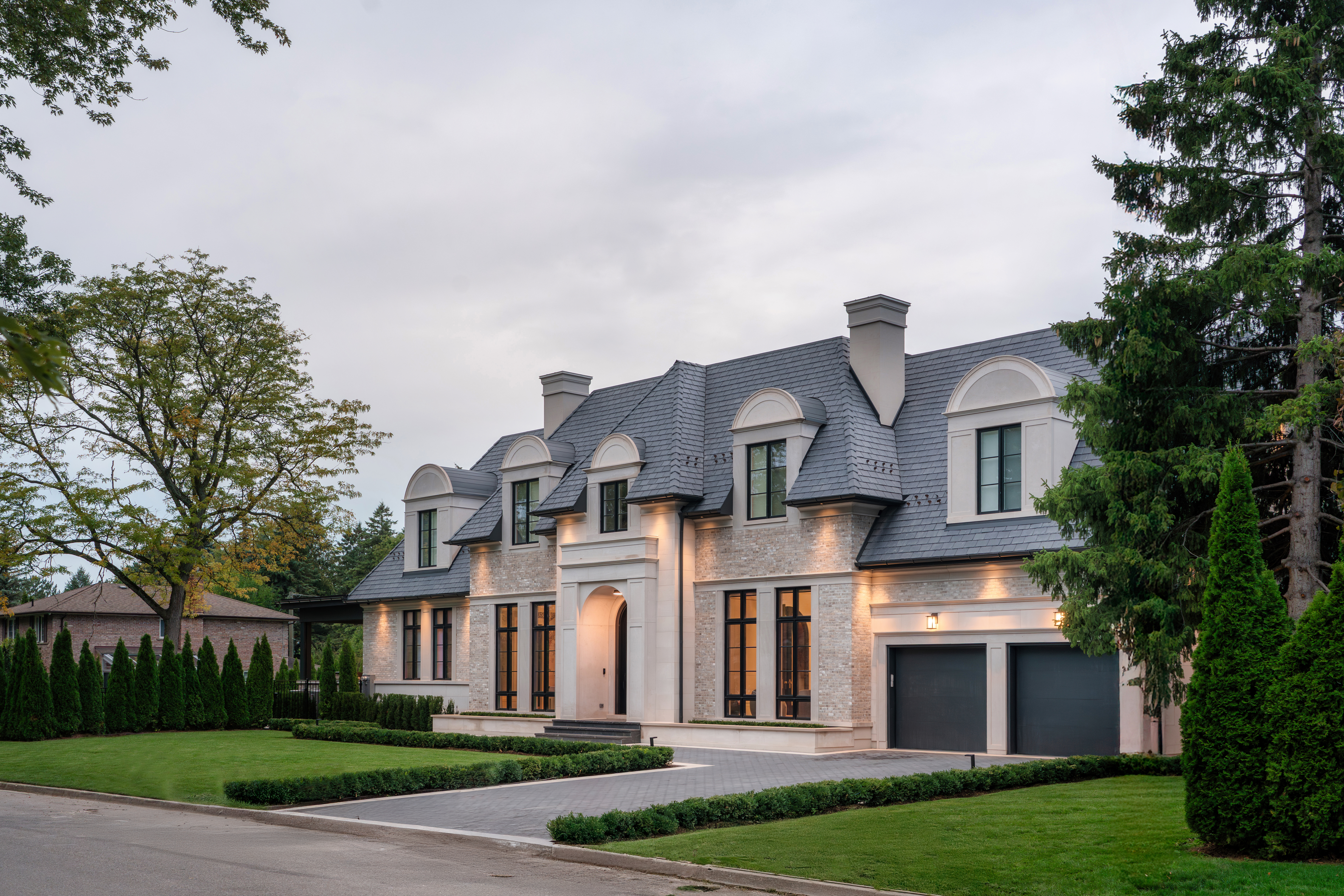 This custom transitional home blends classic symmetry with modern craftsmanship, creating a residence that feels both timeless and distinctly contemporary. The façade is defined by a perfectly balanced composition—twin chimneys framing the roofline, paired curved dormers, and a central entry pavilion that introduces a sense of quiet grandeur. The soft, sculptural form of the dormers adds refinement to the steep roofline, enhancing the home’s stately presence from the street.