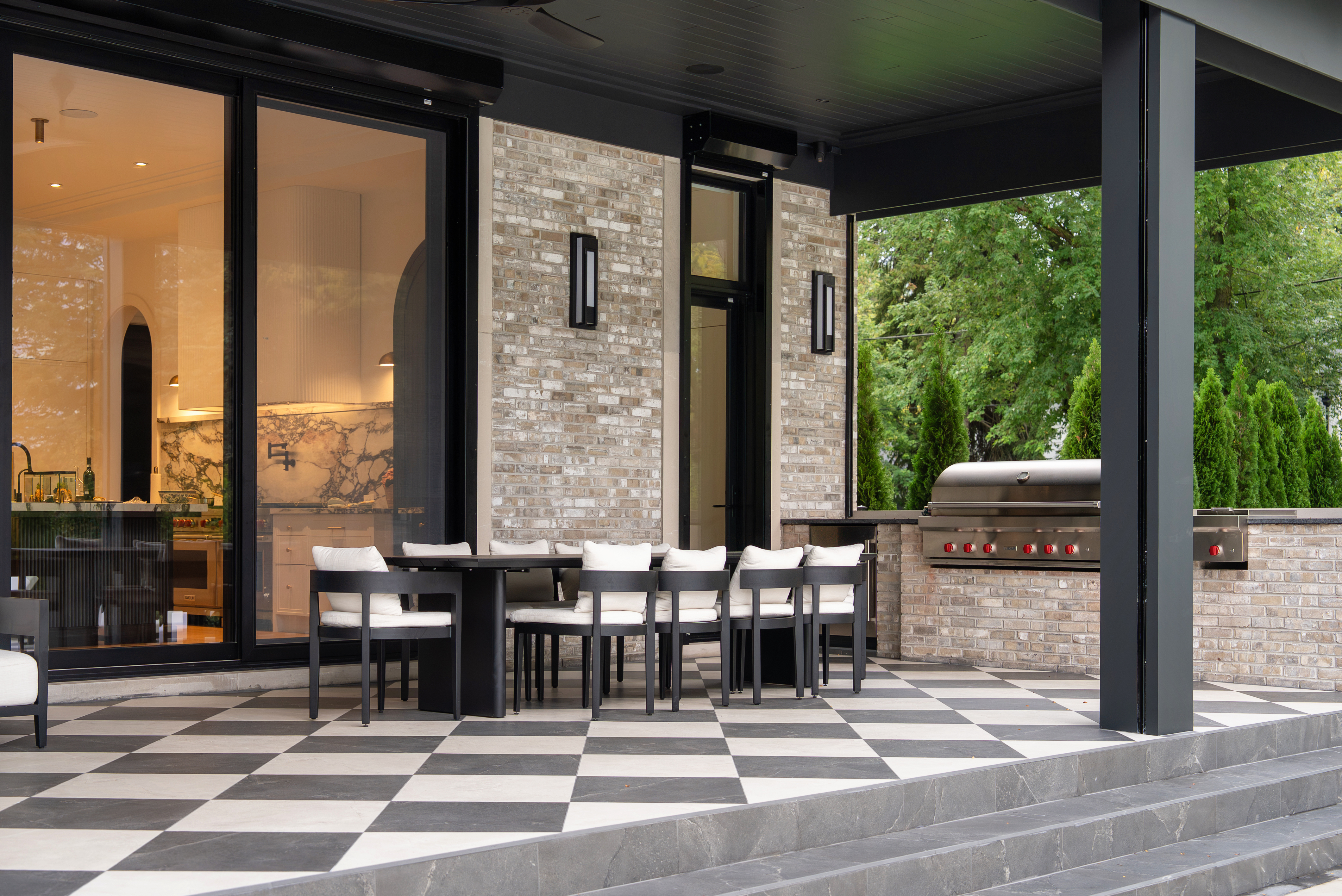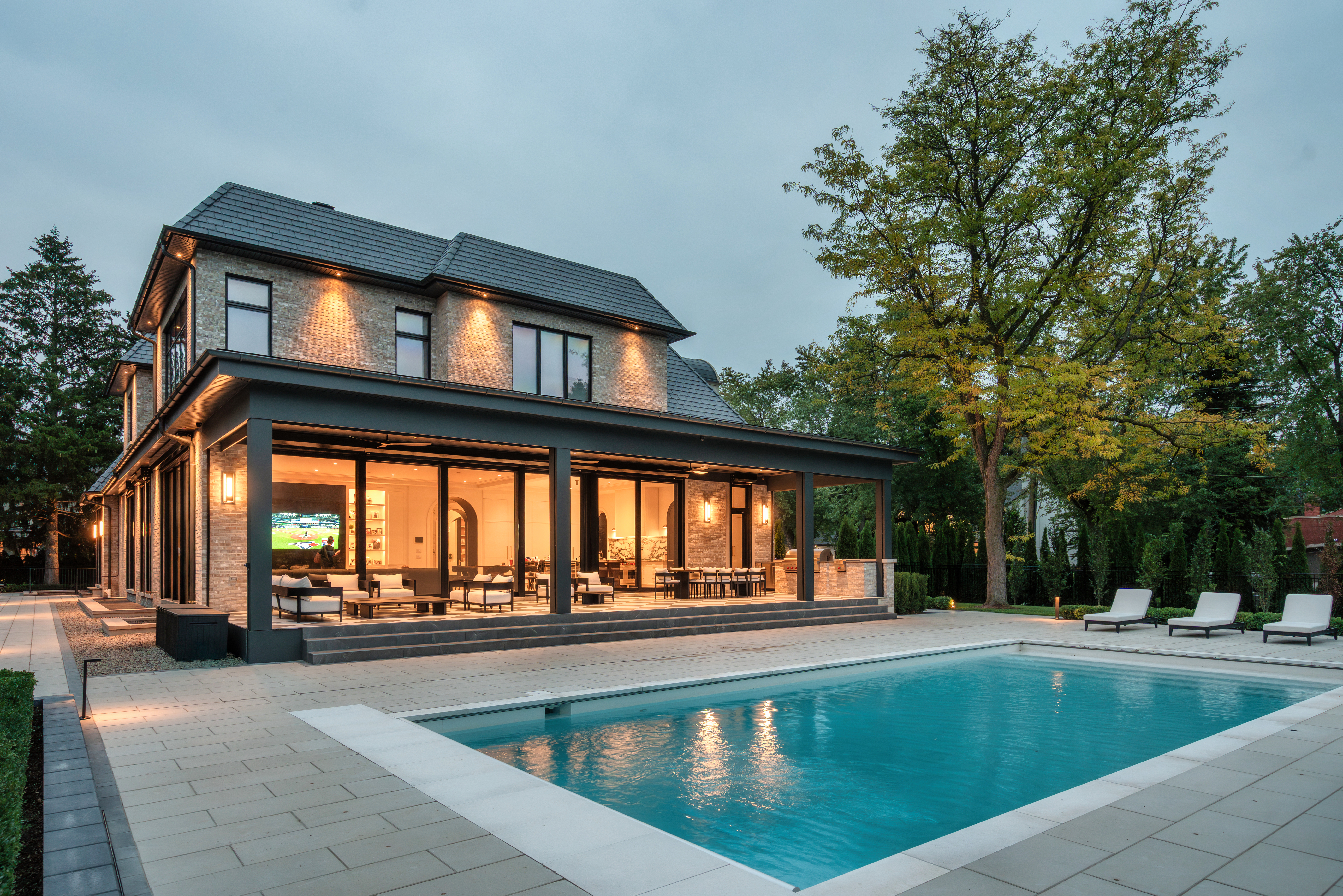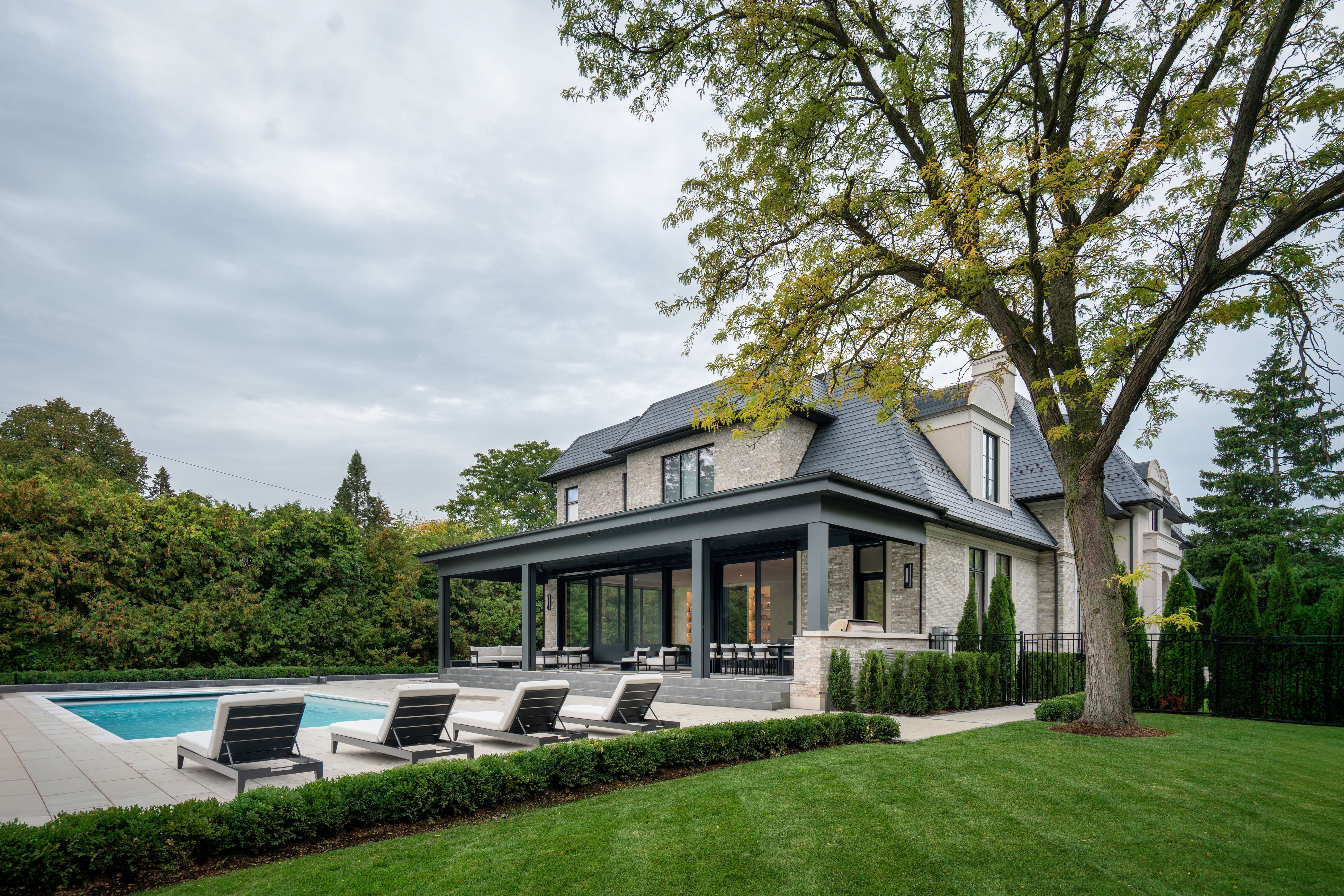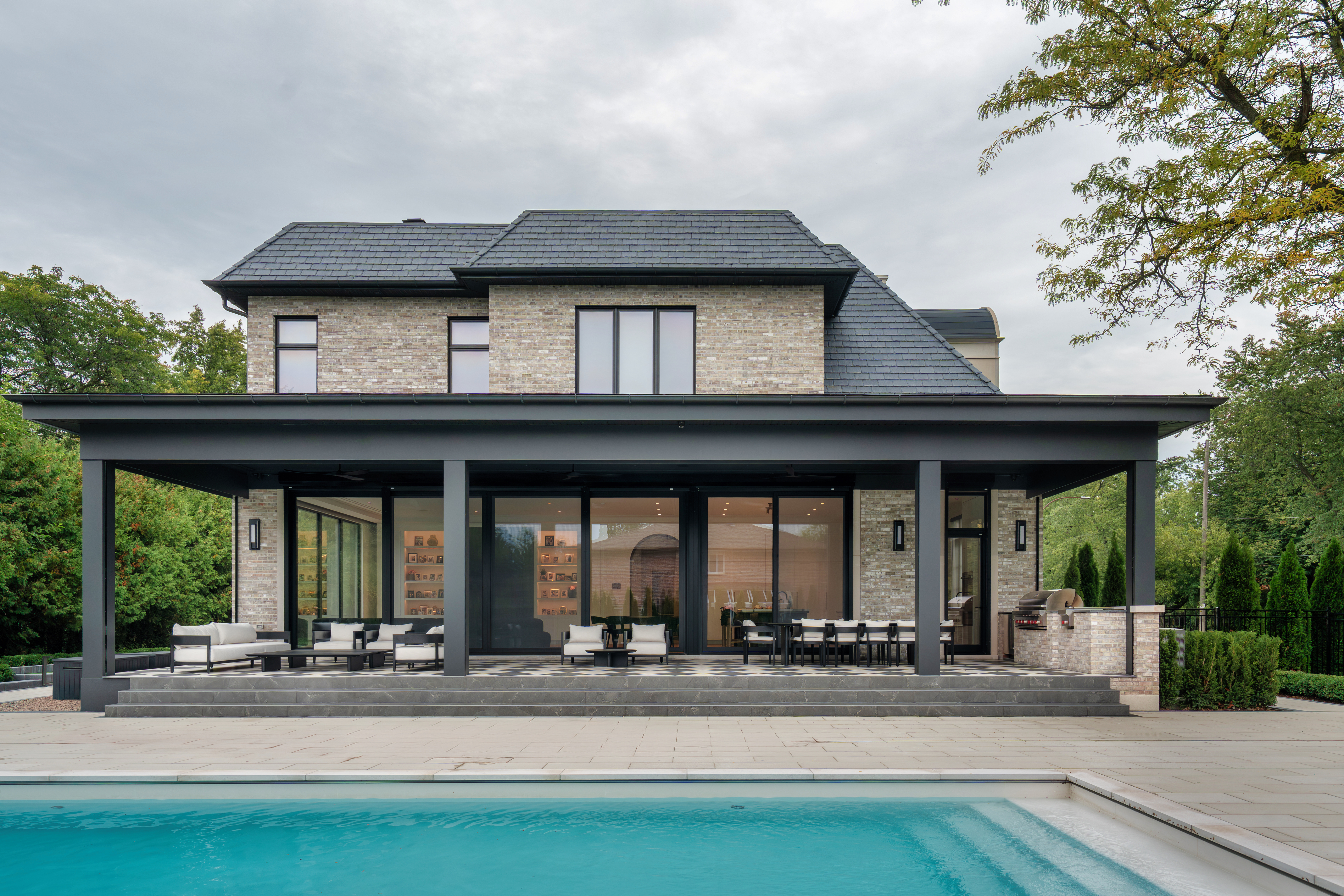 Because the lot is wider than it is deep, the backyard was thoughtfully positioned along the side yard. Expansive sliding doors open to a covered outdoor living space overlooking the pool, creating a seamless indoor–outdoor connection that extends the entertaining areas and reinforces the home’s blend of tradition and modernity.