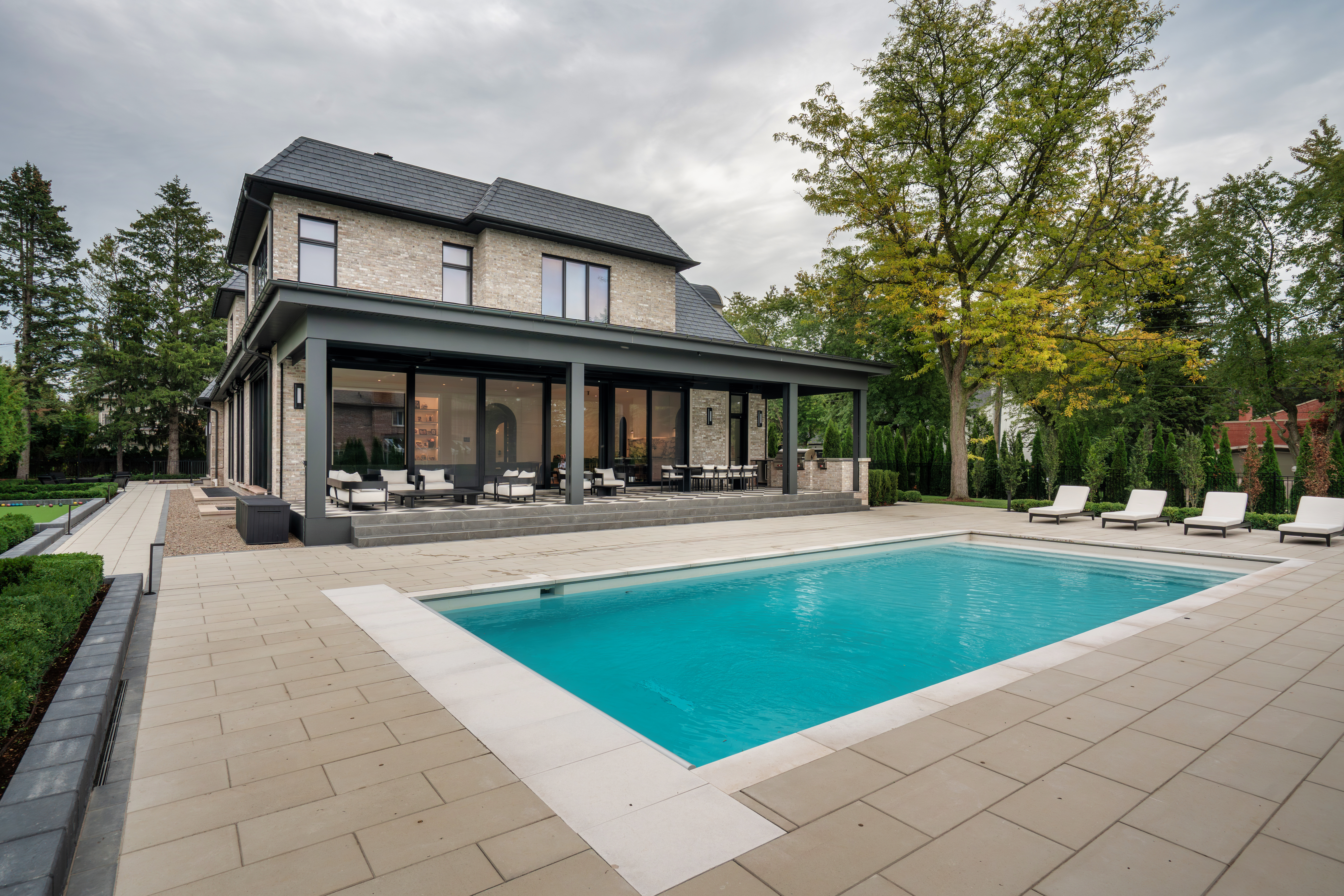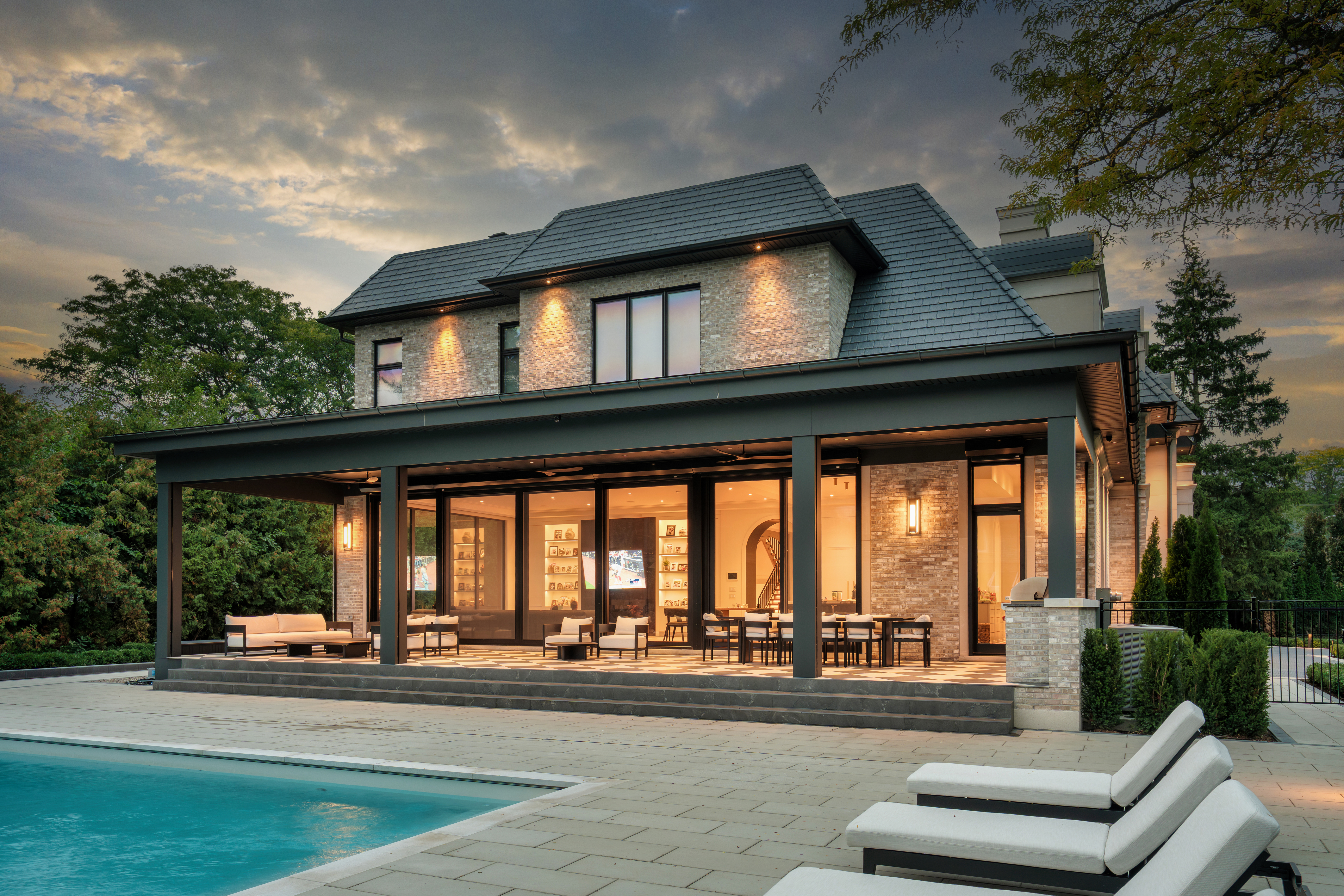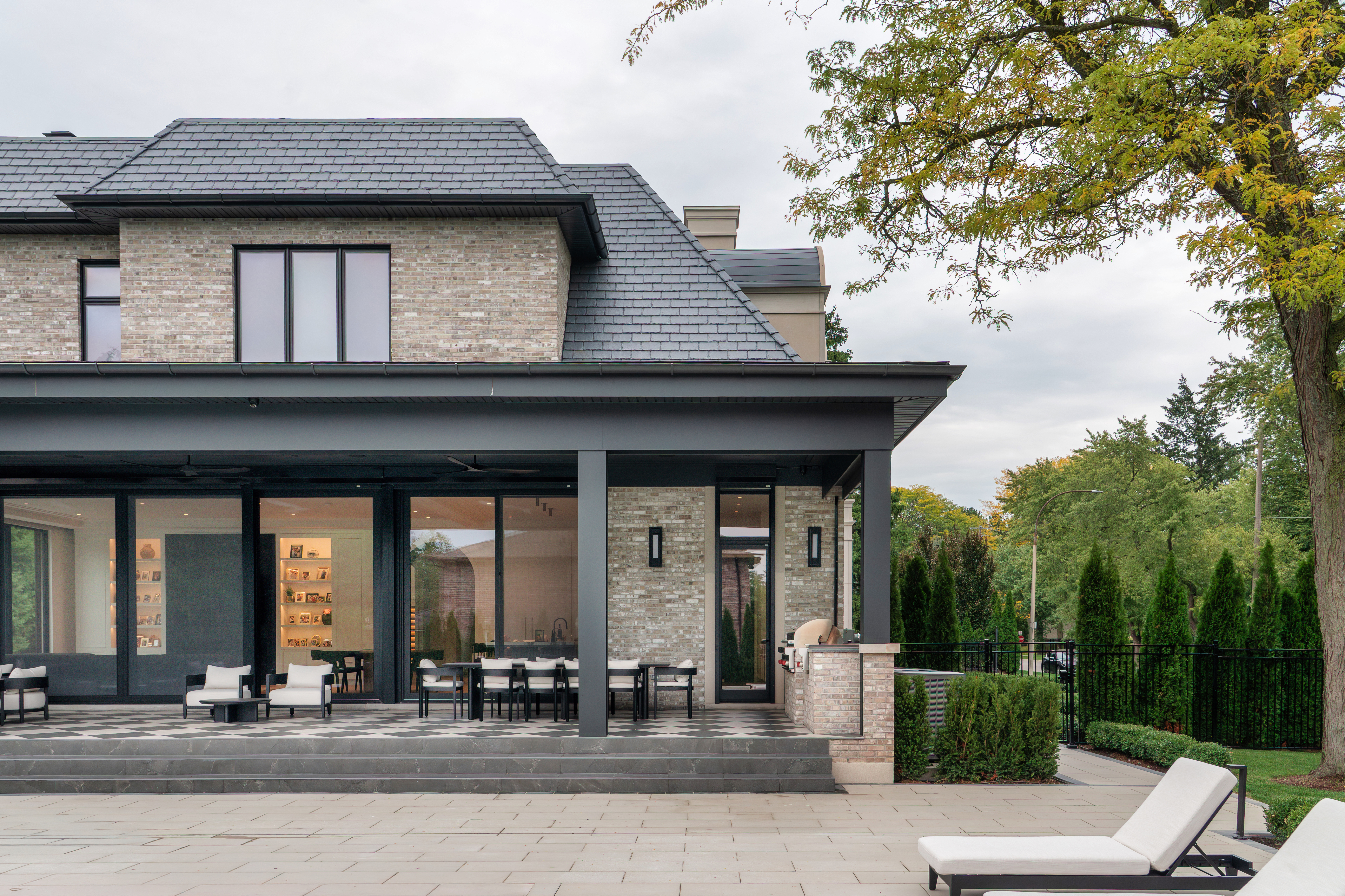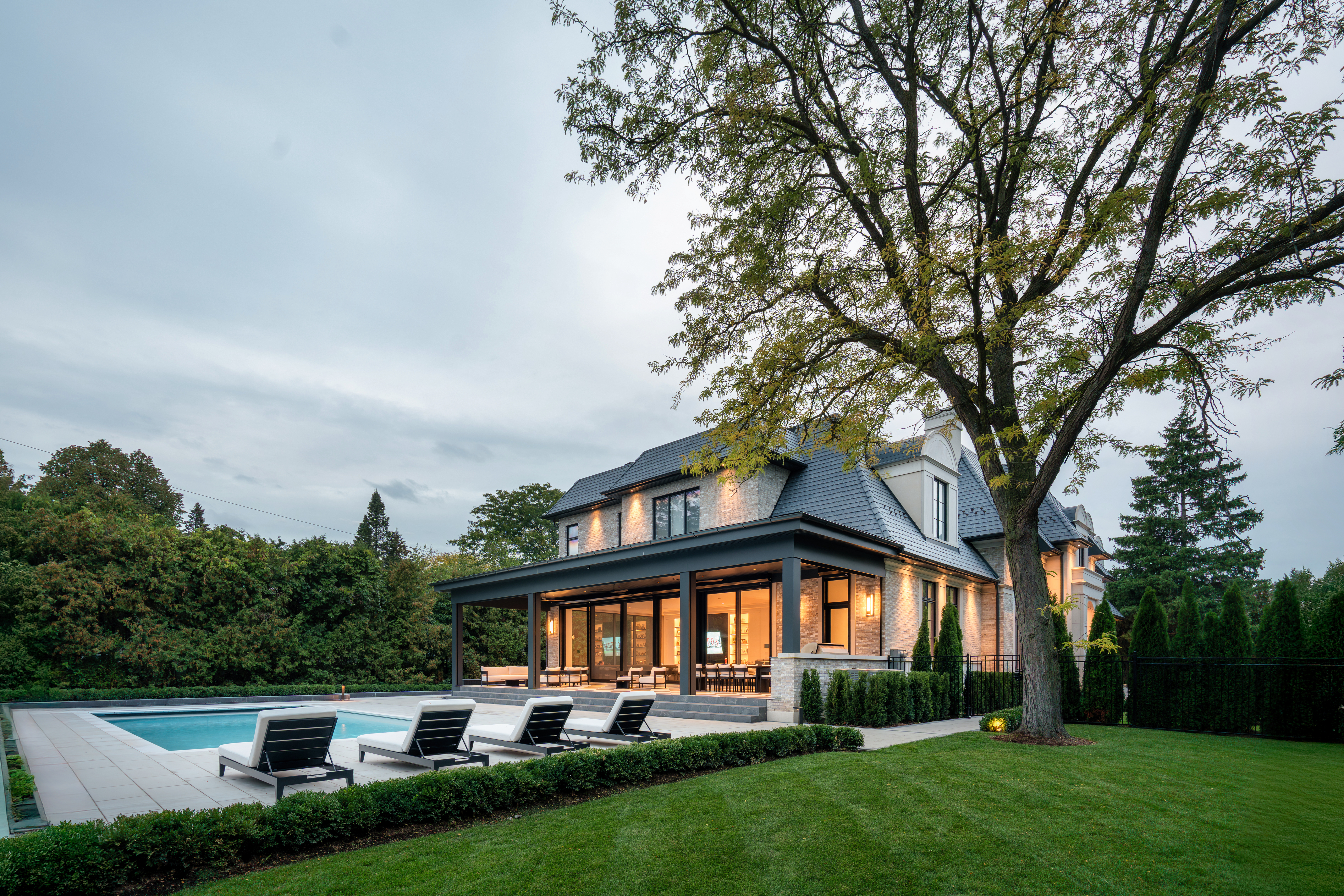 Because the lot is wider than it is deep, the backyard was thoughtfully positioned along the side yard. Expansive sliding doors open to a covered outdoor living space overlooking the pool, creating a seamless indoor–outdoor connection that extends the entertaining areas and reinforces the home’s blend of tradition and modernity.