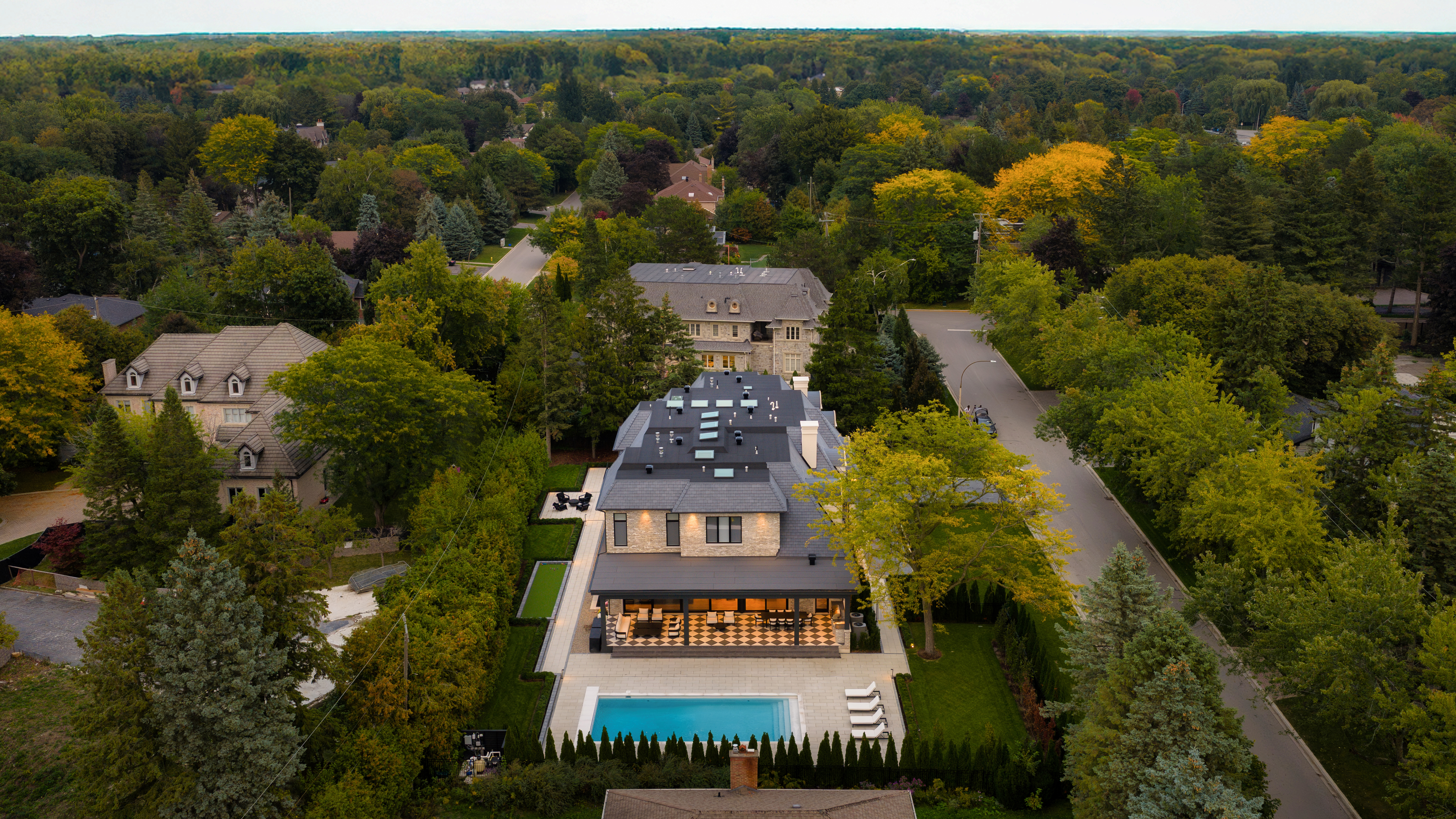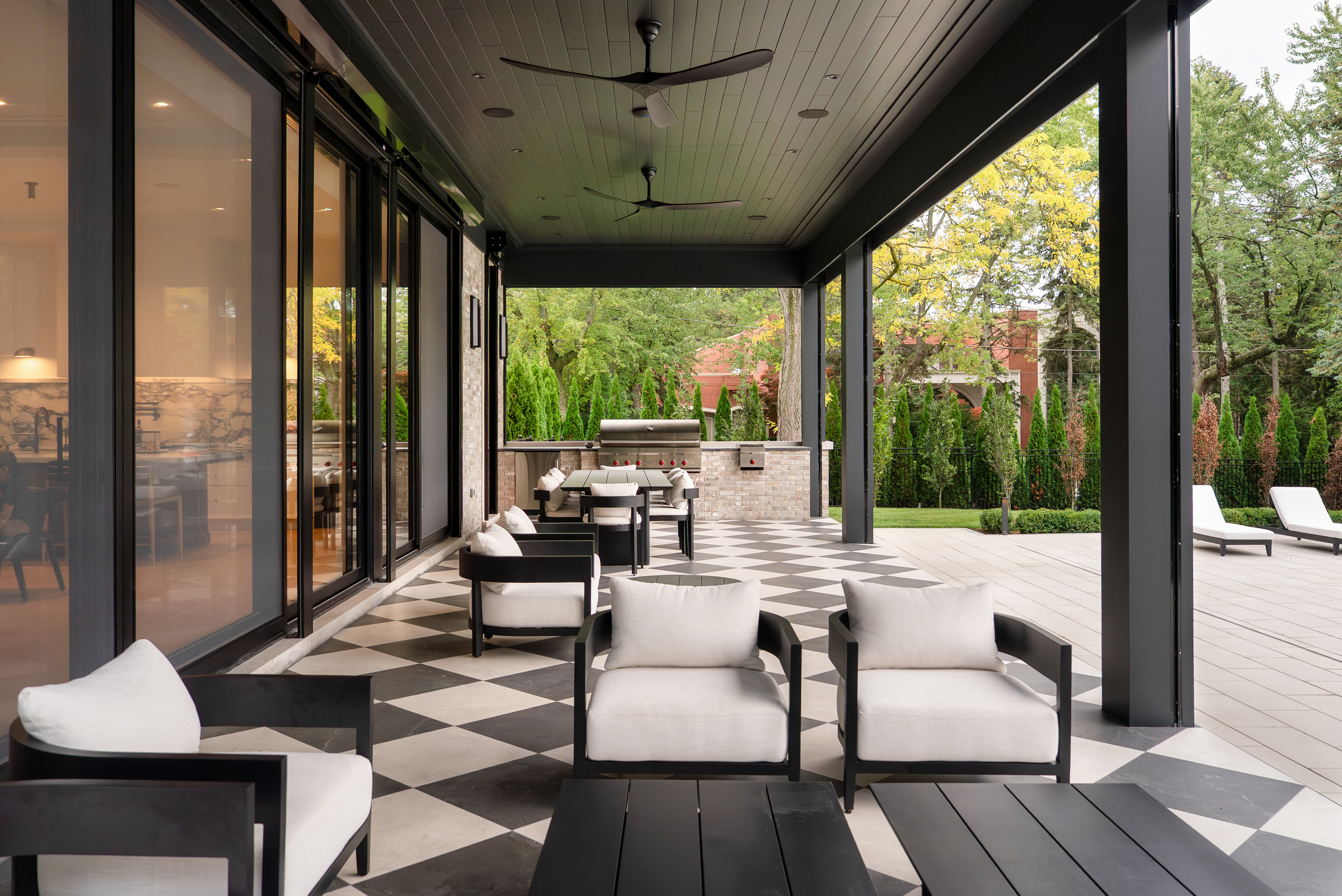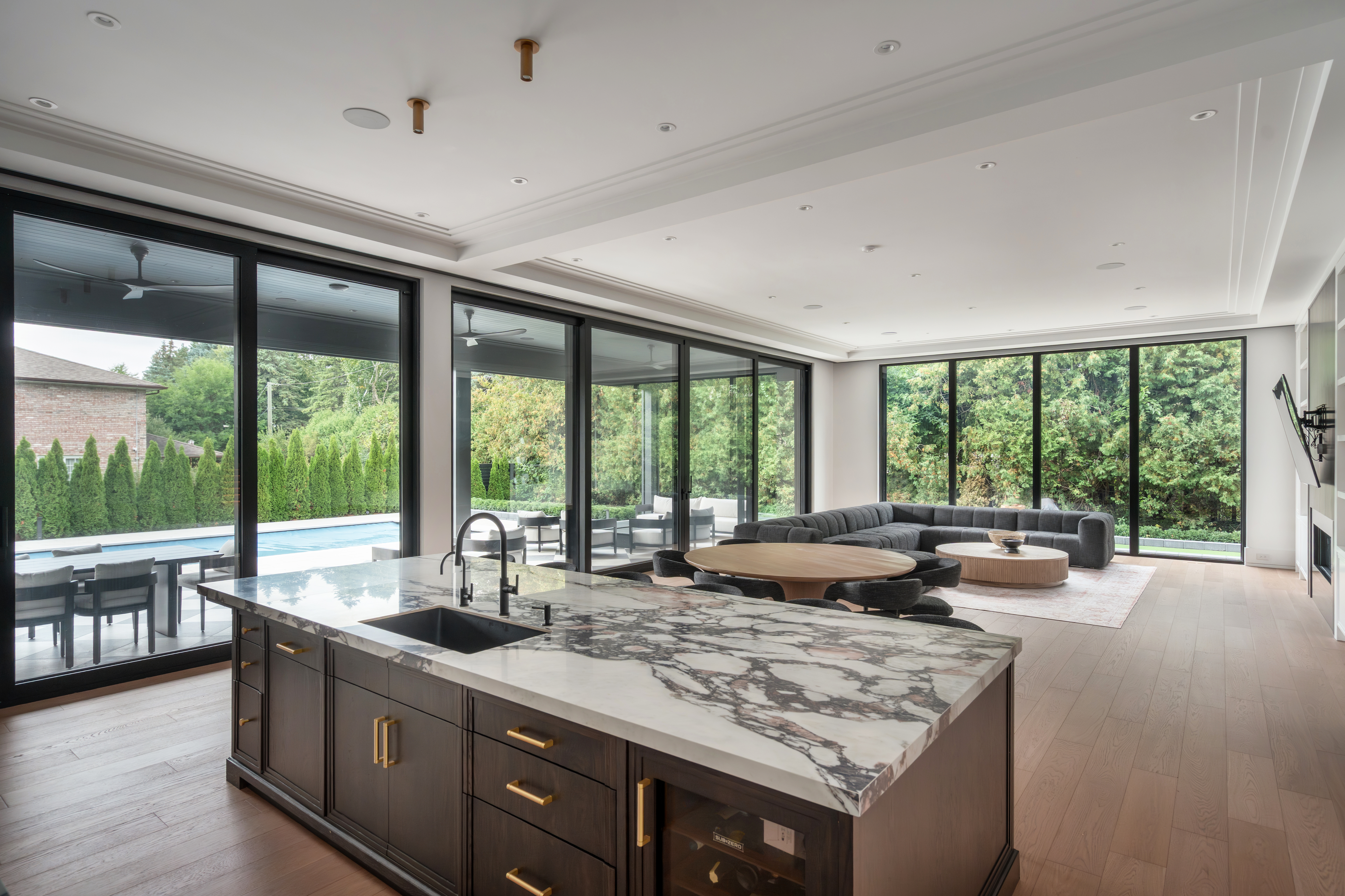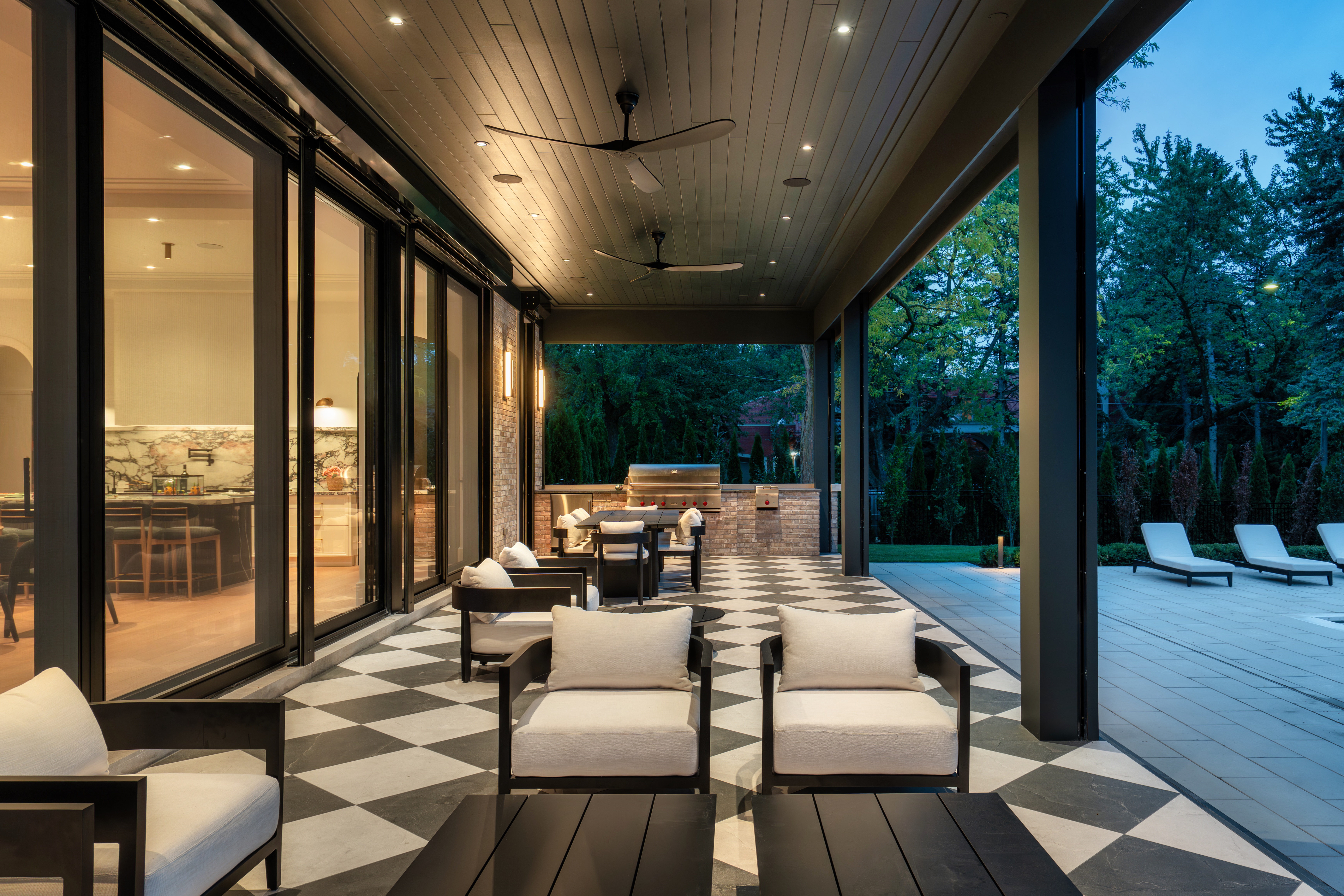 Because the lot is wider than it is deep, the backyard was thoughtfully positioned along the side yard. Expansive sliding doors open to a covered outdoor living space overlooking the pool, creating a seamless indoor–outdoor connection that extends the entertaining areas and reinforces the home’s blend of tradition and modernity.